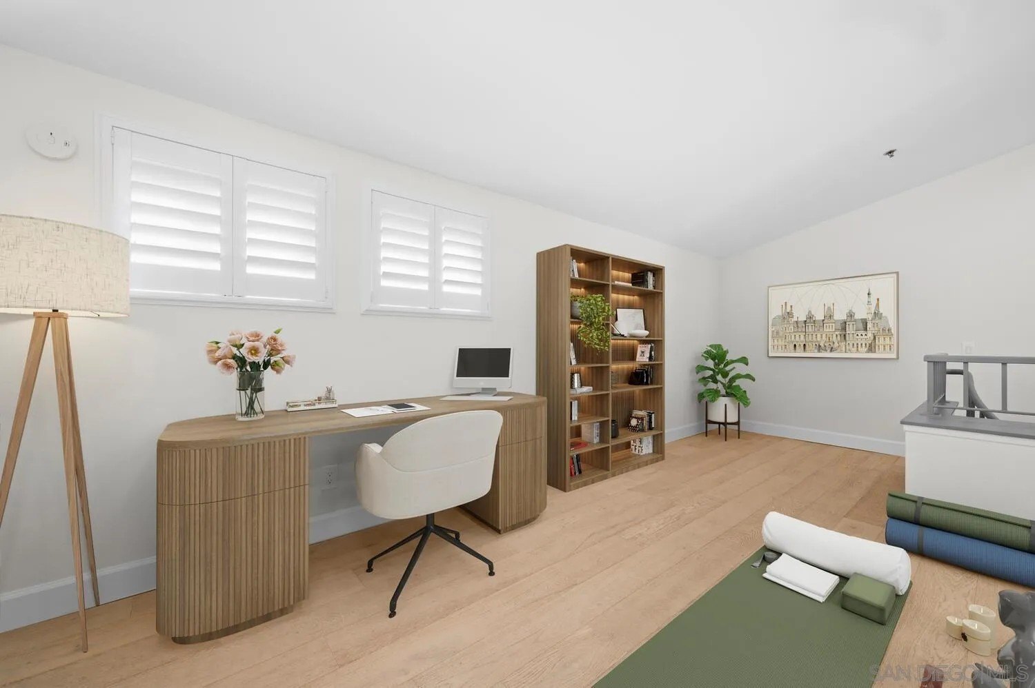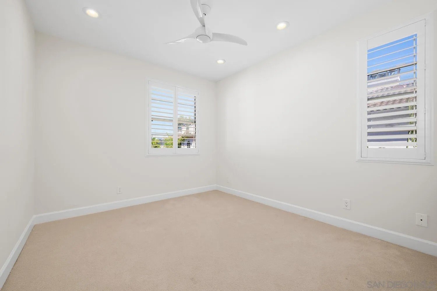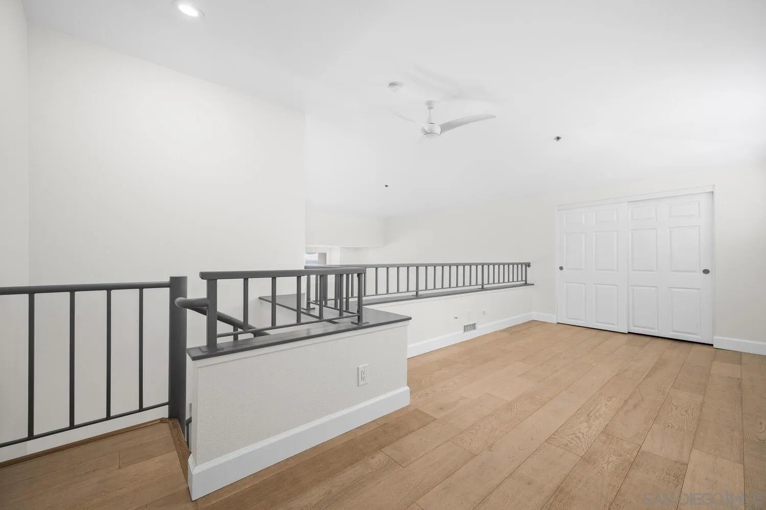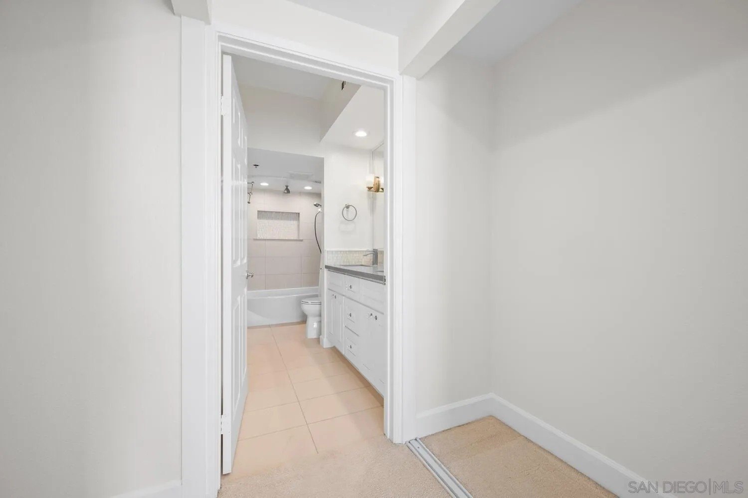 Experience elevated living in the heart of Mission Valley in this stunning top-floor end-unit condominium. With only one shared wall, enjoy exceptional peace and quiet along with soaring vaulted ceilings and a private balcony that create an open and airy atmosphere with tranquil views of the community's inner courtyard. The thoughtfully designed split floor plan features spacious primary and secondary suites on opposite sides of the home, separated by open-concept living areas for maximum privacy.