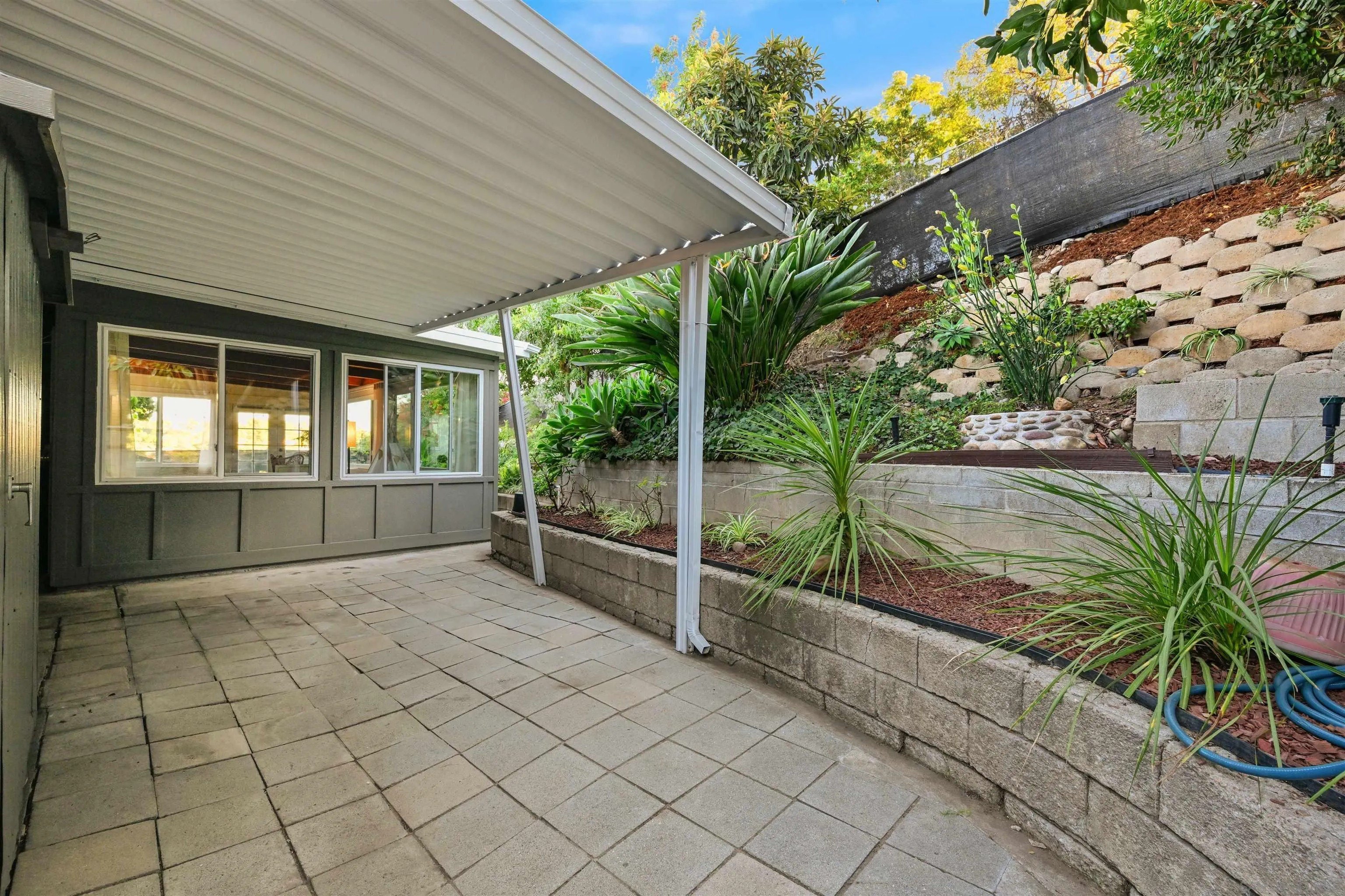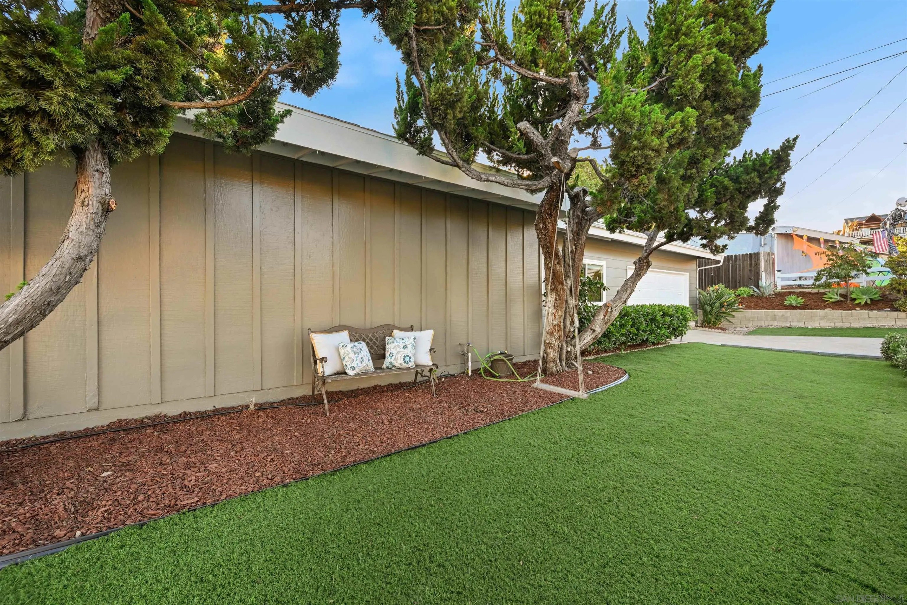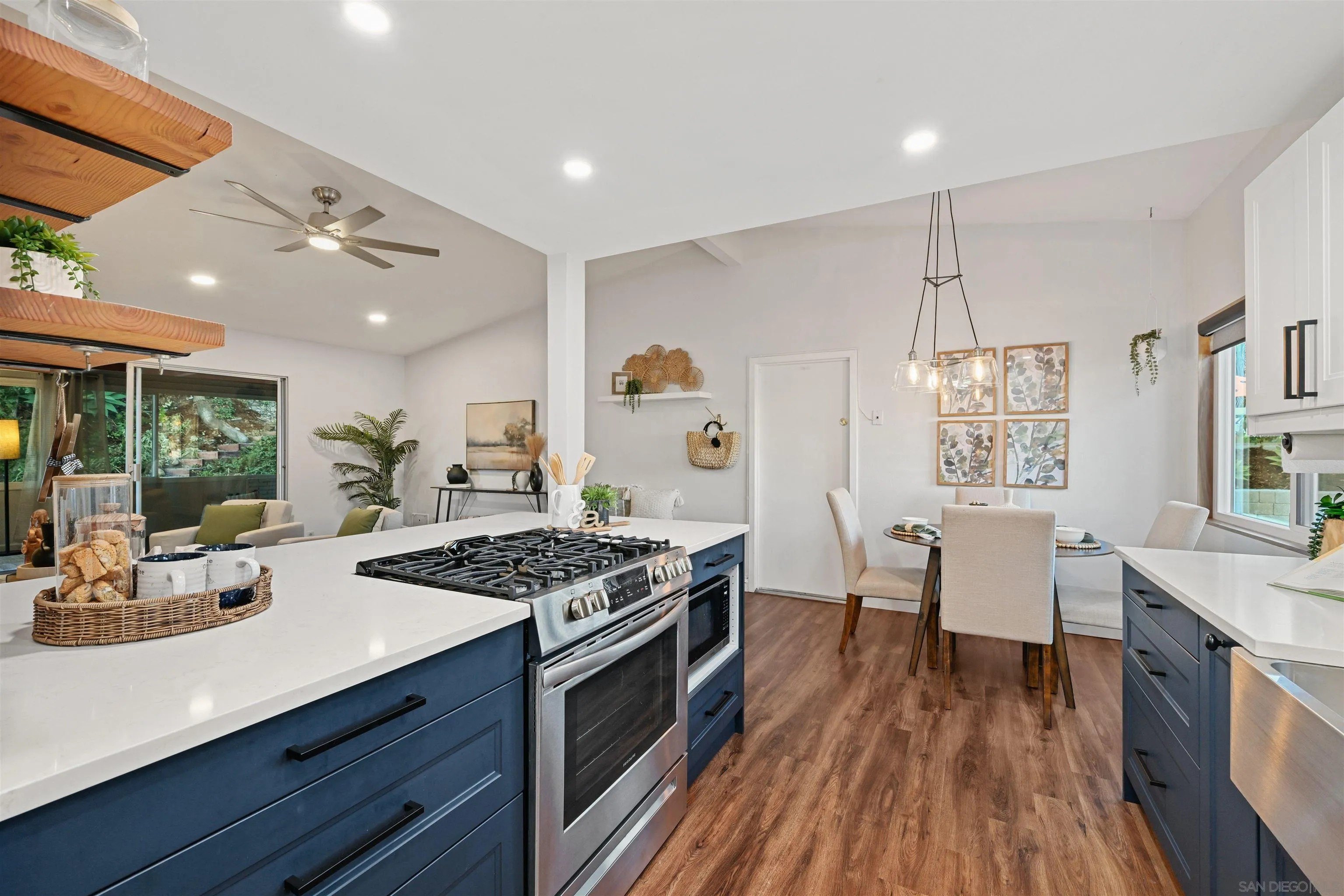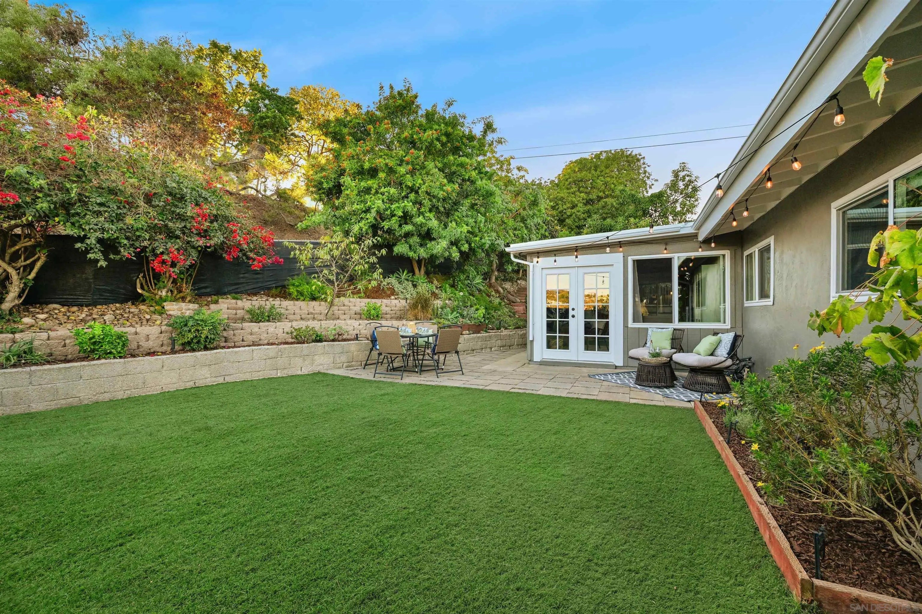 Discover this beautifully remodeled single-family home in the vibrant heart of central San Diego. This inviting 3-bedroom, 2-bath residence perfectly blends modern design with everyday comfort, offering a bright, open floor plan enhanced by vaulted ceilings, large windows, and fresh neutral tones. Stylish laminate flooring flows throughout, complementing the upgraded kitchen, which features crisp white cabinetry, quartz countertops, a decorative tile backsplash, a stainless steel apron sink, and a gas range ideal for the home chef. Both bathrooms have been tastefully remodeled with modern finishes, while custom bedroom closets add a touch of functional luxury. A spacious, enclosed sunroom with open-beam shiplap ceilings expands the living area, making it perfect for an office, playroom, or creative retreat. Additional upgrades include new windows, new water heater, fresh interior and exterior paint, and low-maintenance turf with fully landscaped grounds. The attached 2-car garage provides added convenience and storage. The backyard is a private oasis with a variety of fruit trees, multiple patios for outdoor entertaining, and terraced garden areas with steps leading to southwest-facing views of the surrounding hills. Ideally located near Talmadge, Kensington, and City Heights, this move-in-ready gem offers quick access to North Park dining, Balboa Park, downtown San Diego, beaches, shopping, and major freeways, making it the perfect blend of comfort, style, and convenience in one of San Diego's most central neighborhoods.