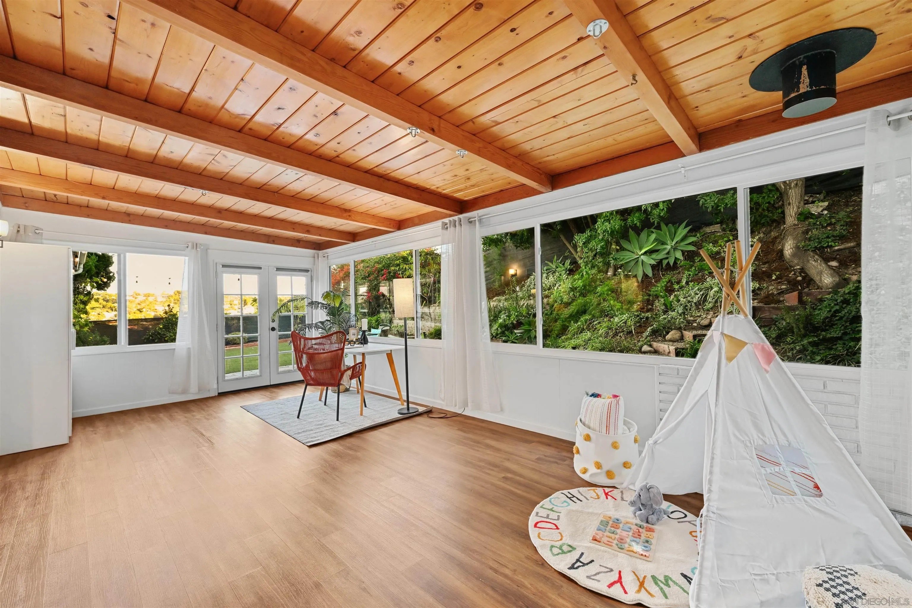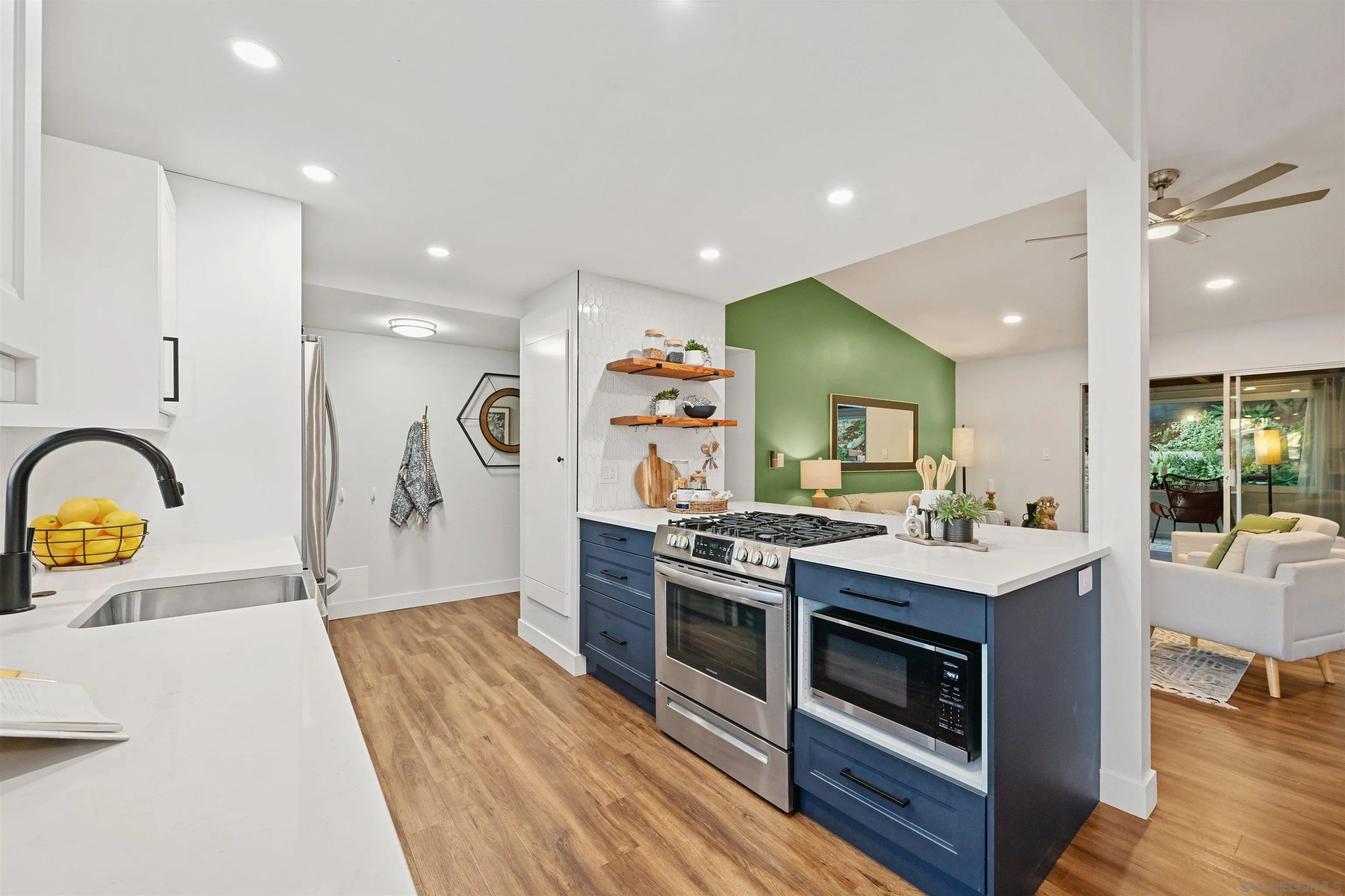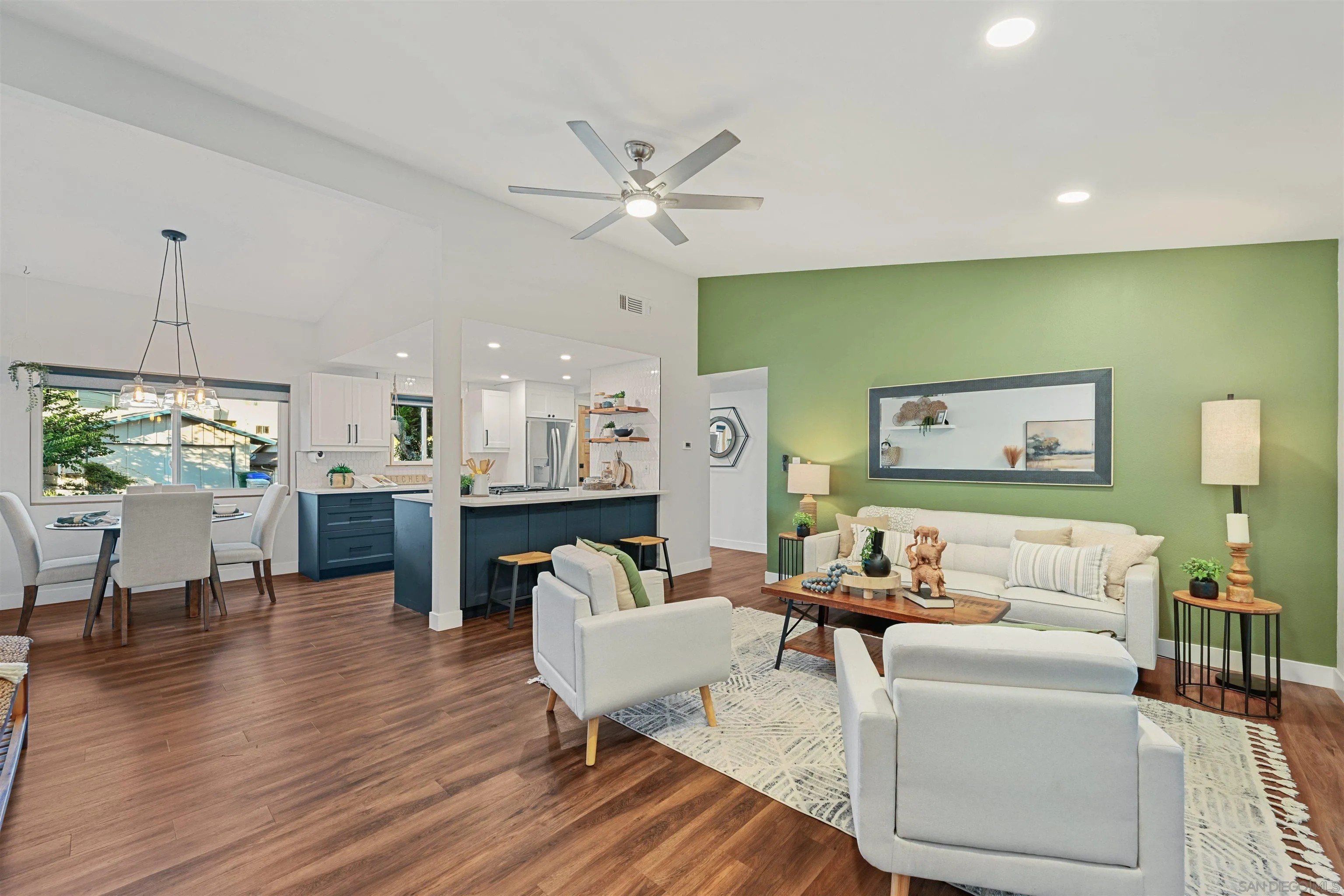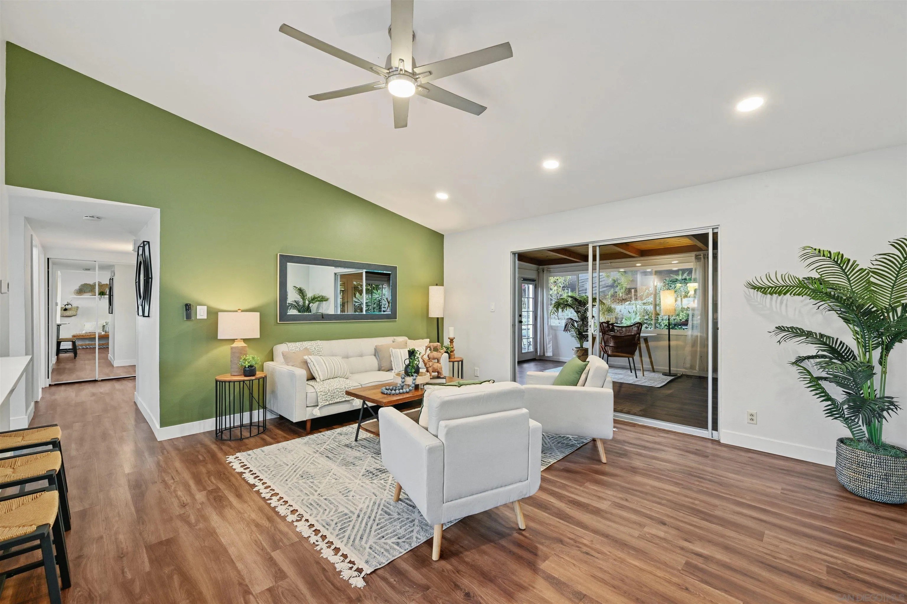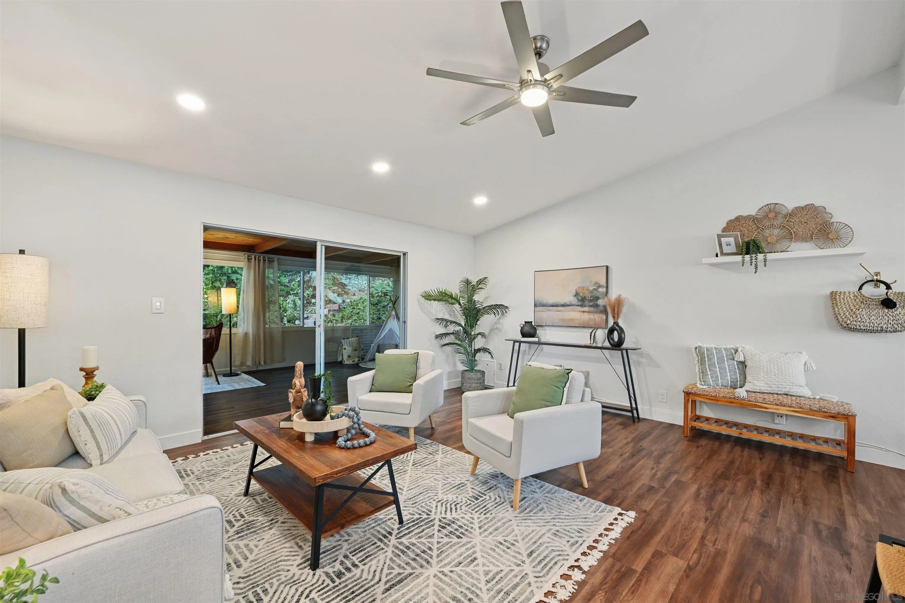 Discover this beautifully remodeled single-family home in the vibrant heart of central San Diego. This inviting 3-bedroom, 2-bath residence perfectly blends modern design with everyday comfort, offering a bright, open floor plan enhanced by vaulted ceilings, large windows, and fresh neutral tones. Stylish laminate flooring flows throughout, complementing the upgraded kitchen, which features crisp white cabinetry, quartz countertops, a decorative tile backsplash, a stainless steel apron sink, and a gas range ideal for the home chef. Both bathrooms have been tastefully remodeled with modern finishes, while custom bedroom closets add a touch of functional luxury. A spacious, enclosed sunroom with open-beam shiplap ceilings expands the living area, making it perfect for an office, playroom, or creative retreat. Additional upgrades include new windows, new water heater, fresh interior and exterior paint, and low-maintenance turf with fully landscaped grounds. The attached 2-car garage provides added convenience and storage. The backyard is a private oasis with a variety of fruit trees, multiple patios for outdoor entertaining, and terraced garden areas with steps leading to southwest-facing views of the surrounding hills. Ideally located near Talmadge, Kensington, and City Heights, this move-in-ready gem offers quick access to North Park dining, Balboa Park, downtown San Diego, beaches, shopping, and major freeways, making it the perfect blend of comfort, style, and convenience in one of San Diego's most central neighborhoods.