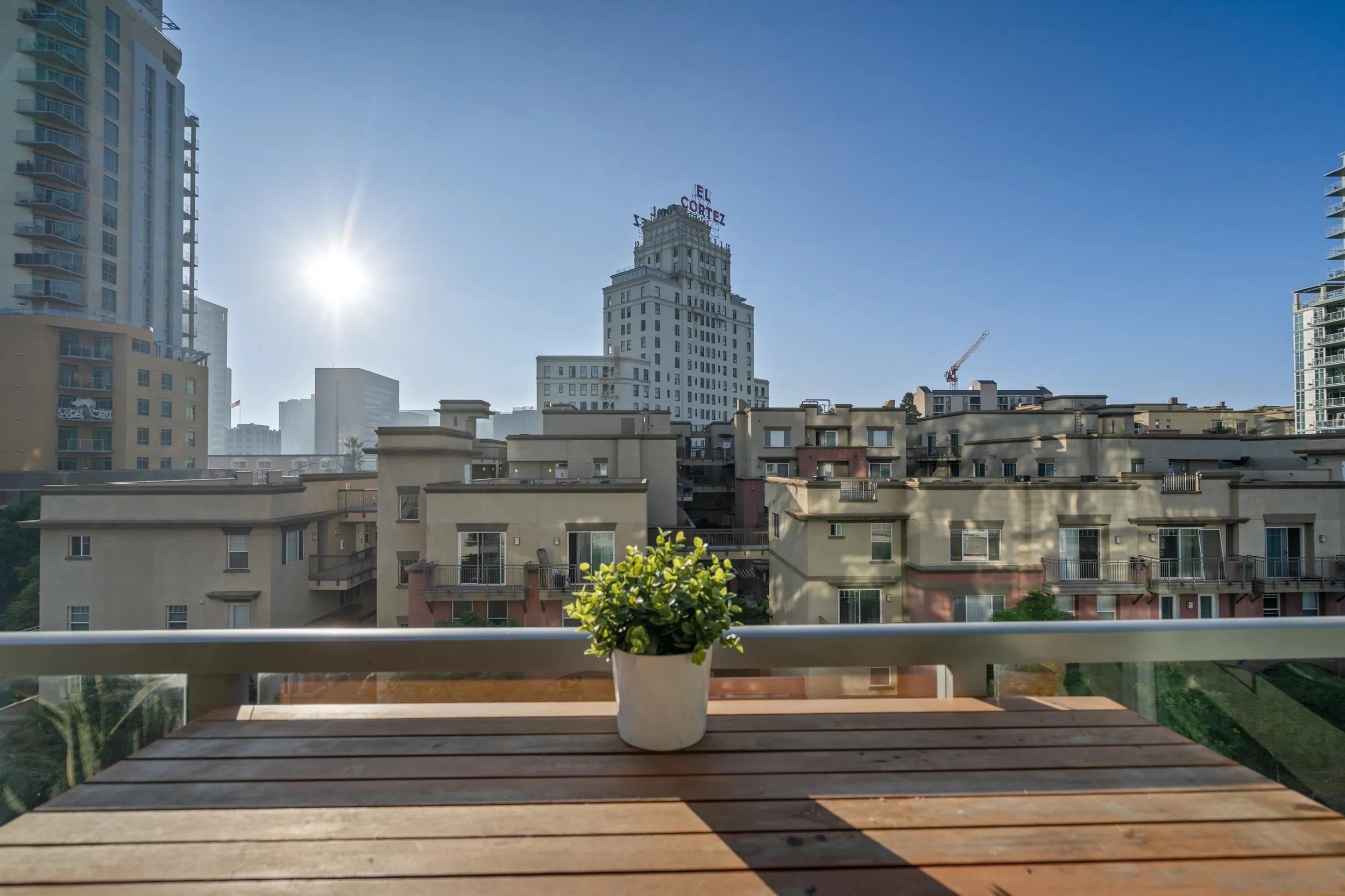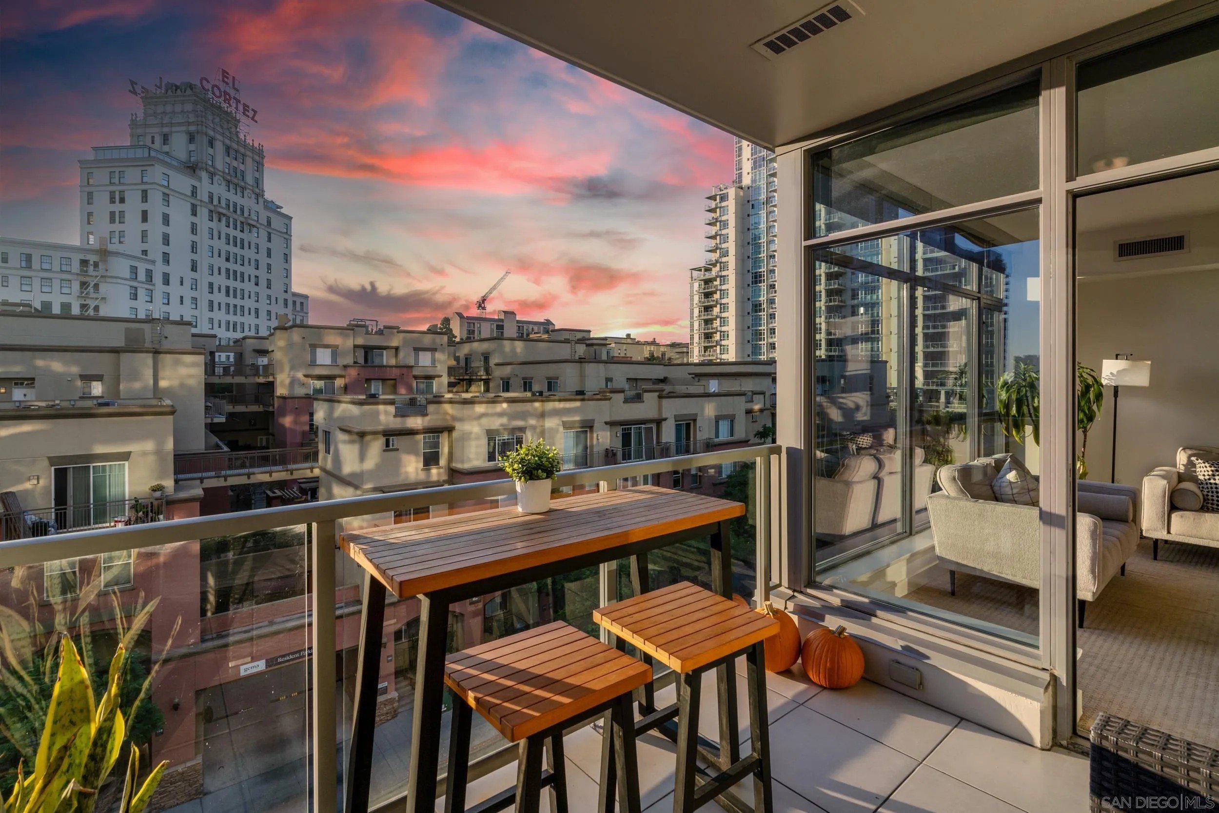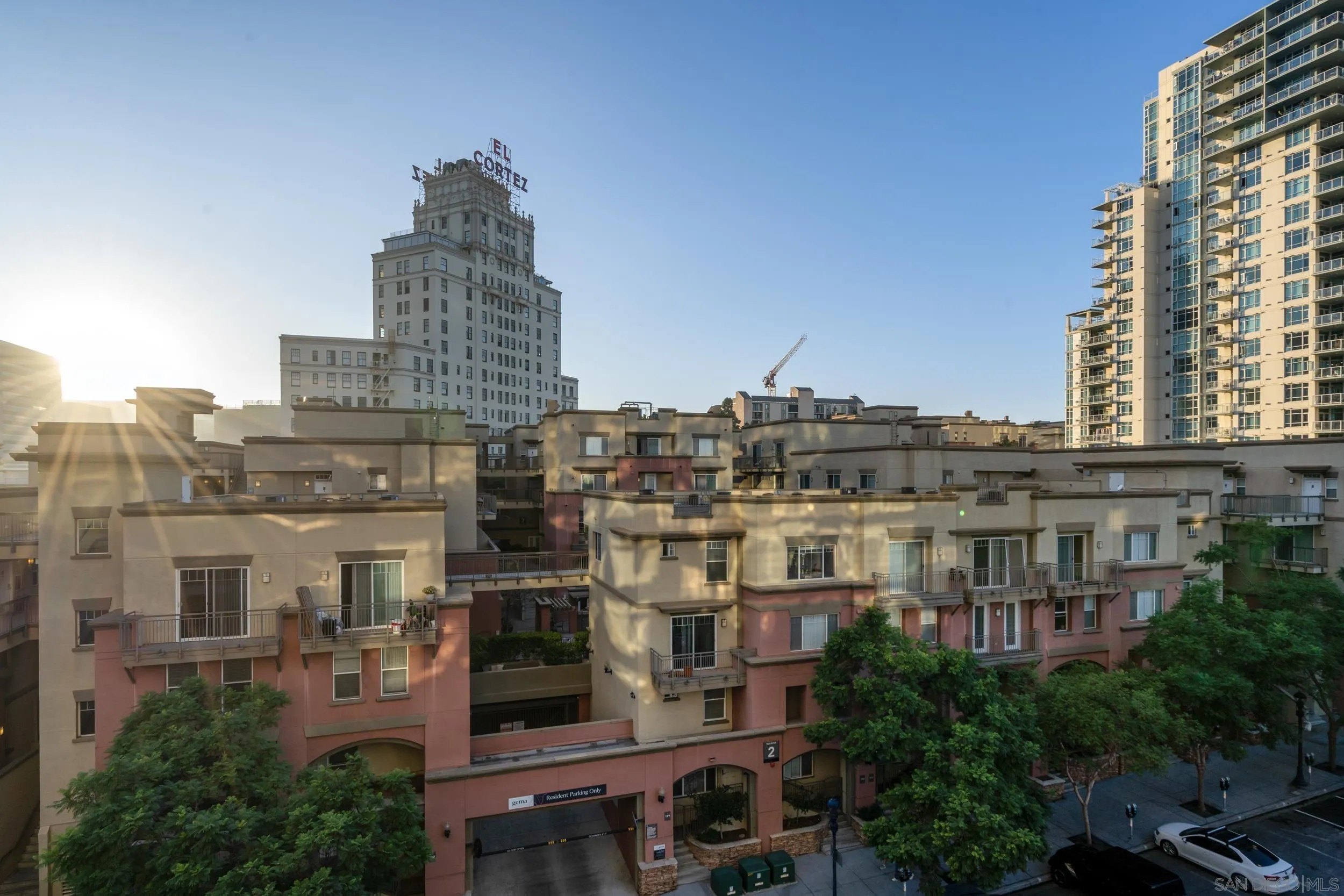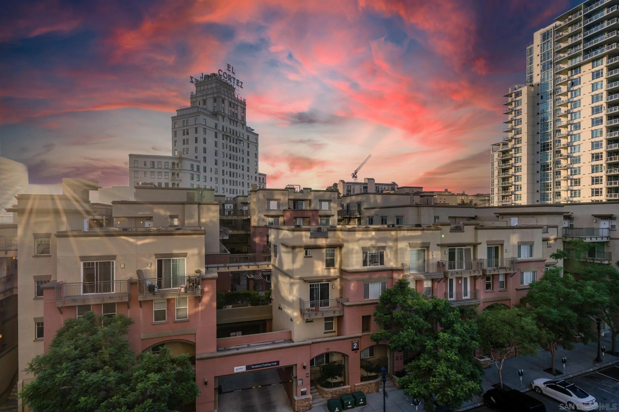 Modern elegance meets downtown vibrance in this stunning Aria residence, located in the serene Cortez Hill neighborhood. Bright and airy with a west-facing orientation, this home captures sweeping city views of the Downtown skyline, the historic El Cortez & spectacular sunsets - a perfect spot to unwind after a busy day. Designed for effortless living, the open-concept layout features high ceilings, oversized windows, and seamless flow between the living, dining, and kitchen areas-ideal for entertaining or relaxation. The contemporary kitchen impresses with stainless steel appliances, sleek quartz countertops, and ample storage. Meanwhile, the spacious bedroom features a large walk-in closet and convenient dual access to the bathroom. Additional highlights include an in-unit washer and dryer, assigned underground parking, and a rare private storage room, located directly in front of the parking space. Aria is a VA & FHA approved community, and residents enjoy an exceptional amenity collection, including a fully equipped fitness center, a 70-foot lap pool and spa, a stylish clubroom with a theatre area featuring lounge seating, a wet bar, and a dining/meeting area. With its peaceful, residential feel and close proximity to Balboa Park, Little Italy, the Gaslamp Quarter, Tweet Street Park, bus and trolley transportation, Petco Park, East Village, and the bayfront, this home offers the perfect balance of calm and connectivity. Aria - where contemporary design, city views, and resort-style living come together beautifully in the heart of Cortez Hill of Downtown San Diego.