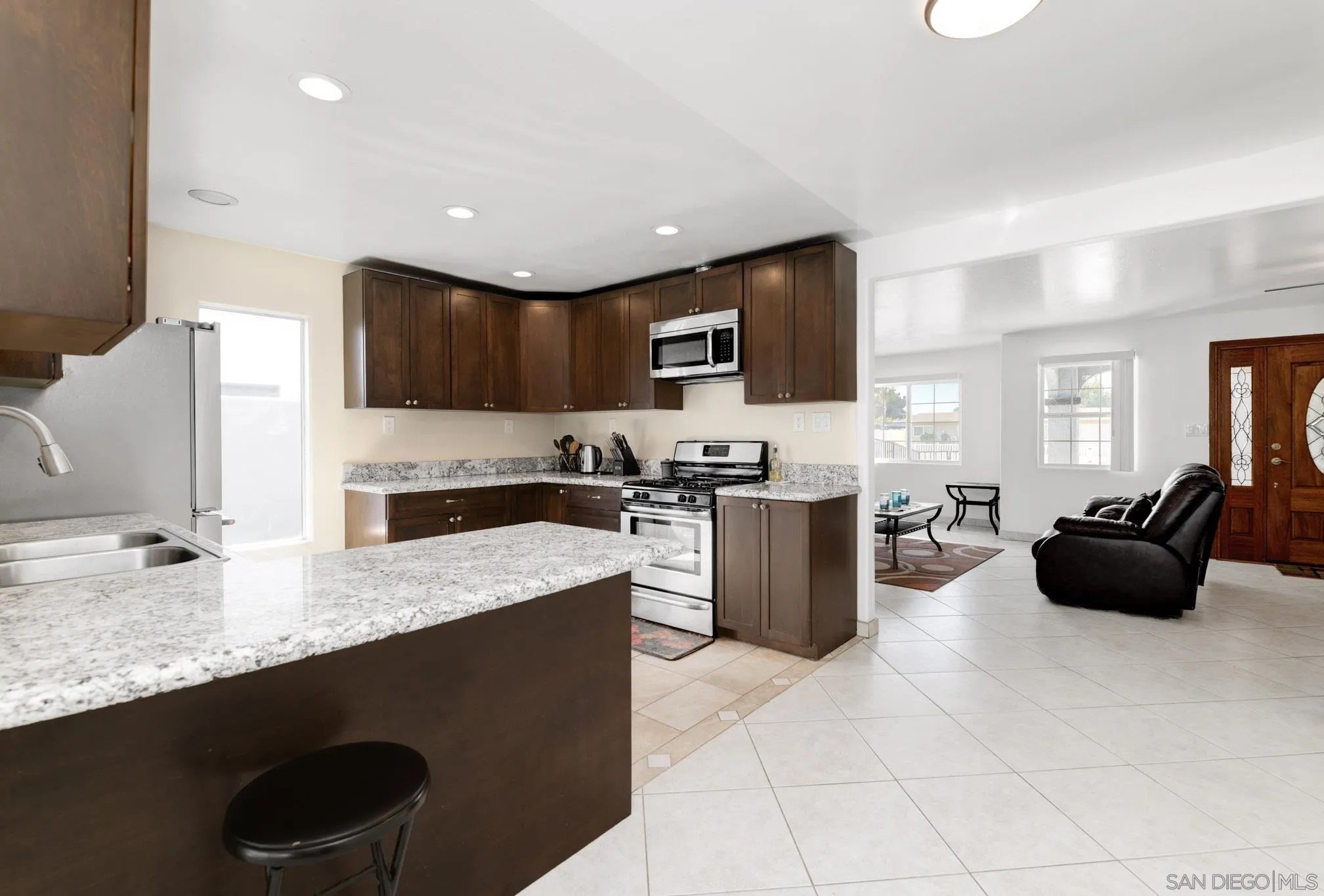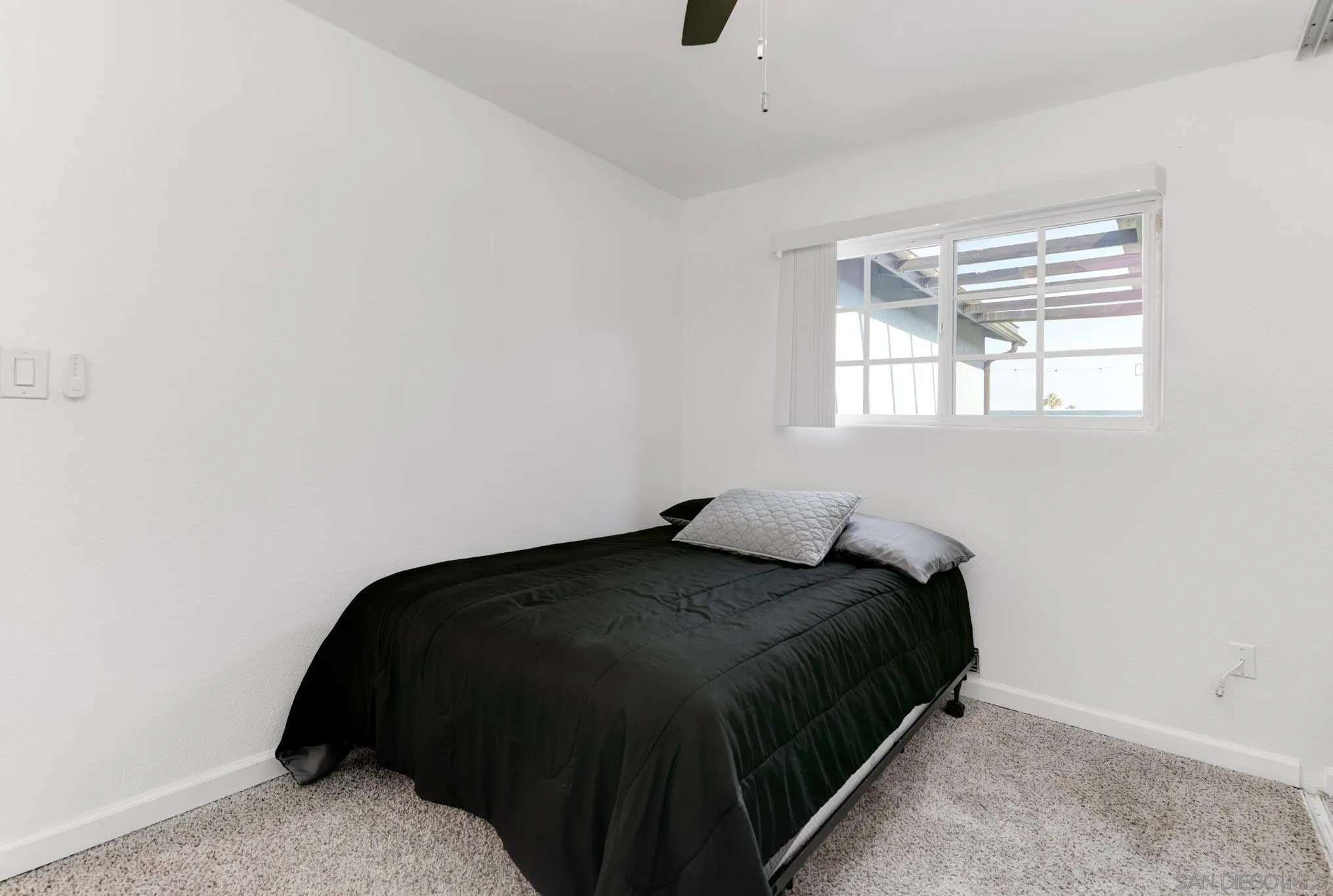 ENTERTAINERS DELIGHT!! Single-story 1,710 sq ft home on a quiet cul-de-sac tip, set back from the main road. 1261 Helix is planted on a flat street, but the rear property line sits above a bluff with 180 degrees unobstructed views-city lights at night, neighborhood below, and wide-open sky by day. The back yard is huge and tailor made for a good kickback, a birthday or a Superbowl party. Inside: dual-pane vinyl windows and sliding doors throughout. Tile floors in kitchen, living, and traffic areas; carpet in bedrooms. Every room has a new ceiling fan with remote. Large living room with oversized fireplace. Open kitchen features granite counters, stainless steel appliances, and direct sightlines to living and dining spaces-ideal for hosting. Dedicated laundry room. Full interior and exterior repaint completed. Outside: fully gated with rolling front gate. Wide main driveway plus separate RV driveway runs full length of the house to rear patio. Back patio is poured concrete with pergola cover. Entire front and back yards upgraded with pet-grade artificial turf-dense, durable, and low-maintenance, stays bright year-round. 6-ft wood privacy fencing encloses the full perimeter. Leased solar panels cover 100% of the current owners' annual electric bill. Location balances seclusion with access: minutes to I-805, shopping, and daily needs in Chula Vista, yet traffic noise is minimal. Practical, updated, and positioned for views, parking, and privacy. VA approved all day. The perfect mid sized Single Family Home at a great price.