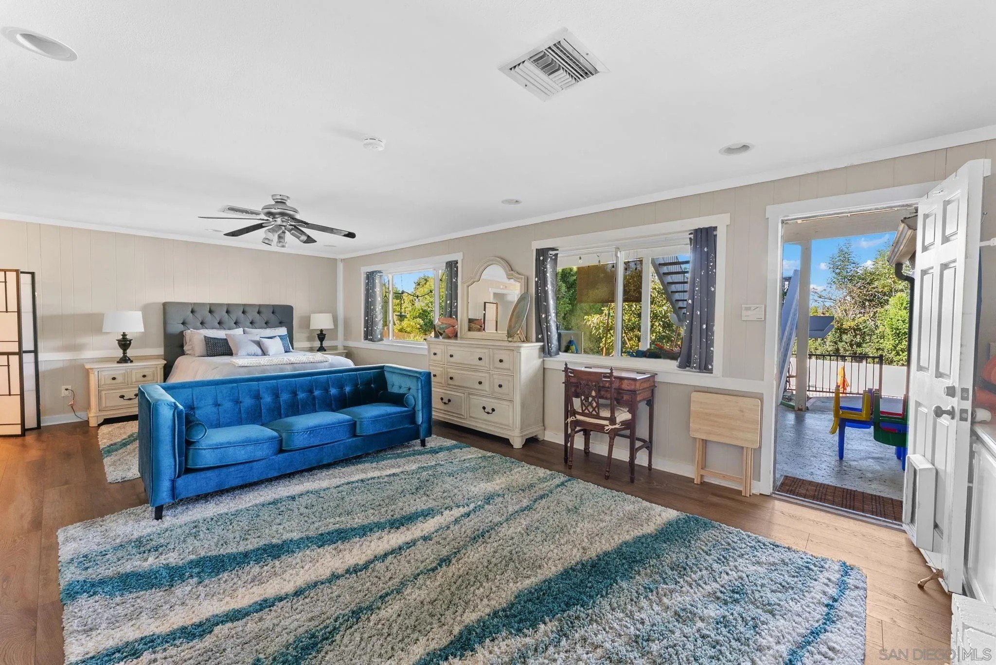 Welcome to luxury powered by 68 OWNED solar panels, including 3 Tesla power walls. Unparalleled elegance, sustainability and self-sufficiency are nestled in the hills of South Escondido delivering modern comfort while keeping operating costs remarkably low. With 5,368 sq.ft including an attached ADU, this palace is meticulously designed with living space ideal for family function & entertainment. A massive granite island highlights the open-concept kitchen which flows effortlessly into the upper-level living area where a 400+ sq. ft. covered terrace is the perfect spot to unwind with panoramic sunset views. The primary suite has striking vaulted ceilings with exposed beams, a spacious walk-in closet, and a luxurious spa-inspired bath ideal for relaxing. Additional bedrooms are thoughtfully placed on both levels. The lower level boasts a fully equipped ADU with private exterior access, a full kitchen, living room, an en-suite bath, laundry utilities, and it's own outdoor area-ideal for generating income and/or multi-generational living. Exposure from the west side bathes the property in natural light & delivers breathtaking sunsets. The massive lot is highlighted by numerous fruit-bearing trees including Macadamia, Avocado, Pomegranate, Orange, Lemon, and more along with thriving grapevines-creating a private orchard retreat. Adding to it's charm, the estate is home to six hens that produce over two dozen eggs weekly, enhancing the self-sustaining lifestyle. With a fully fenced & heated pool & spa, turf lawns, and a charming playhouse, this property is truly extraordinary!