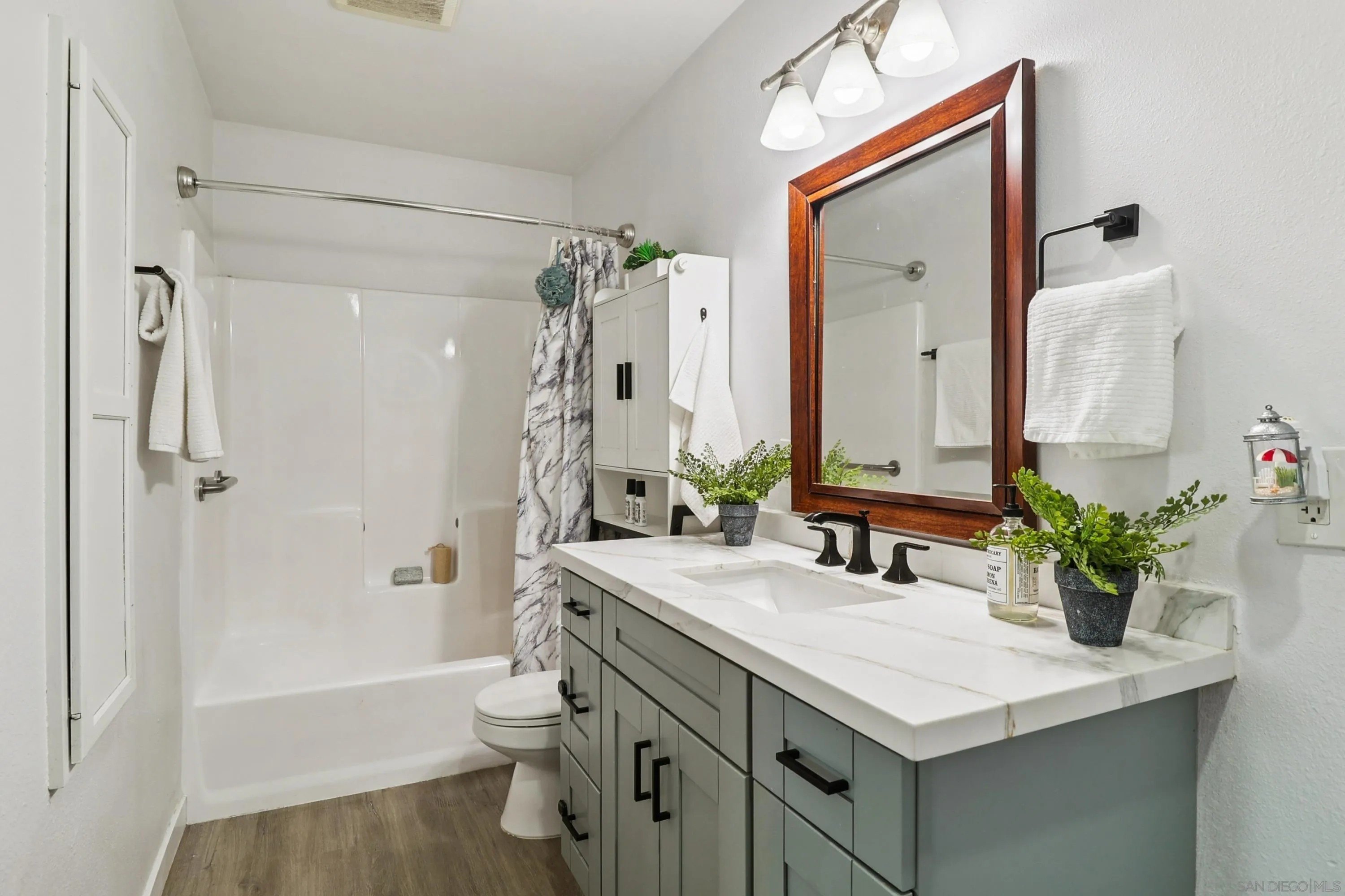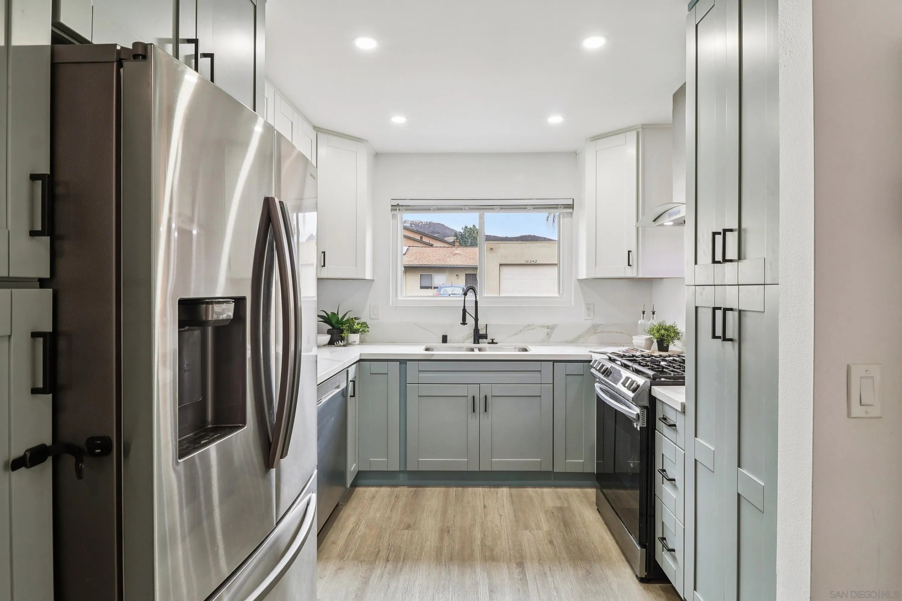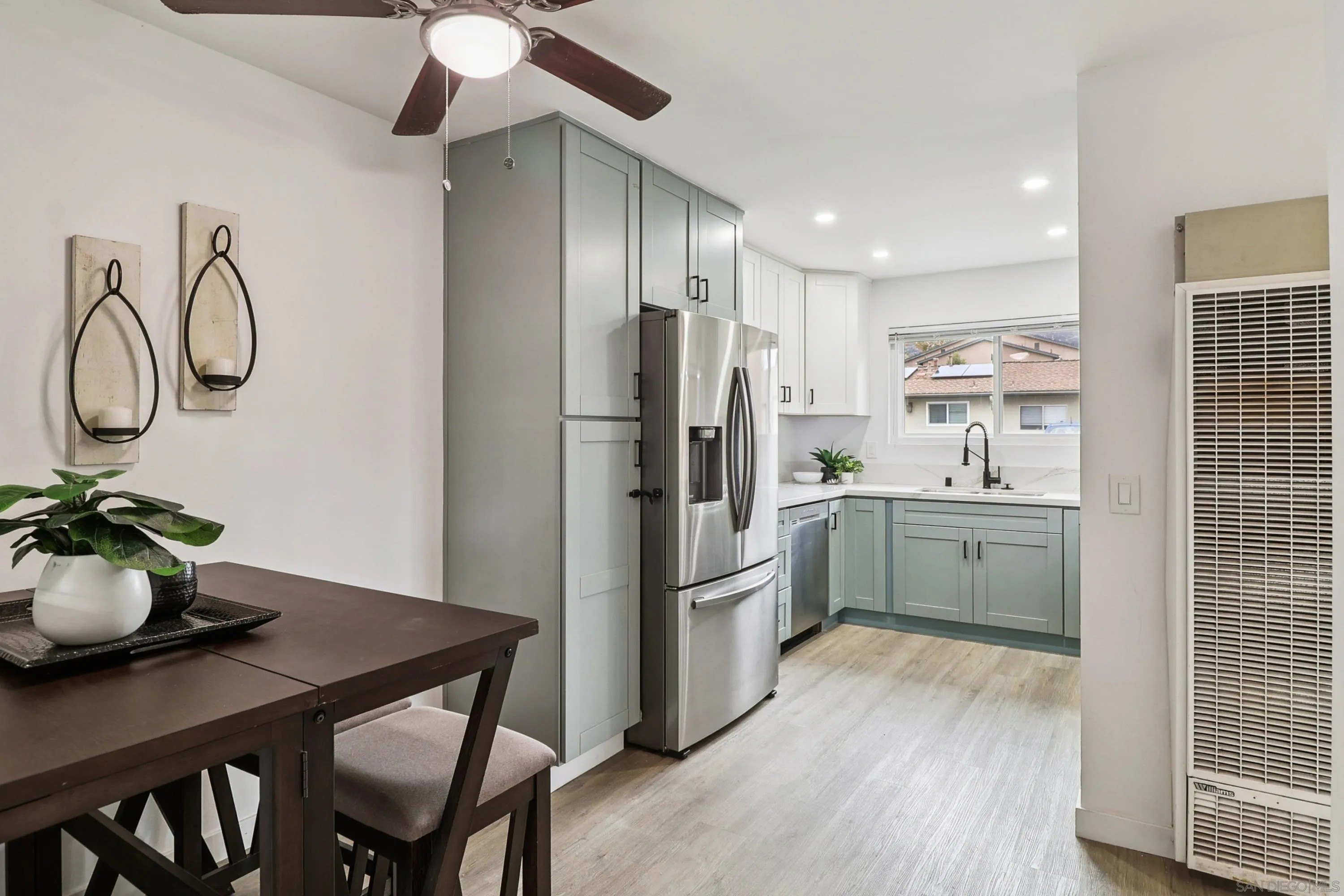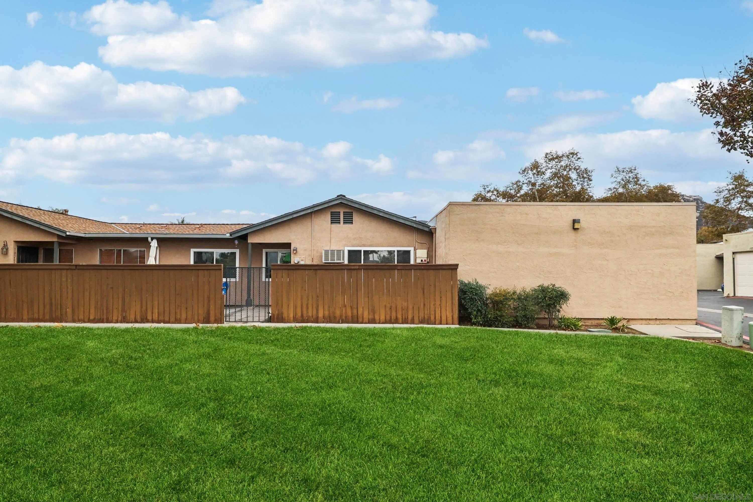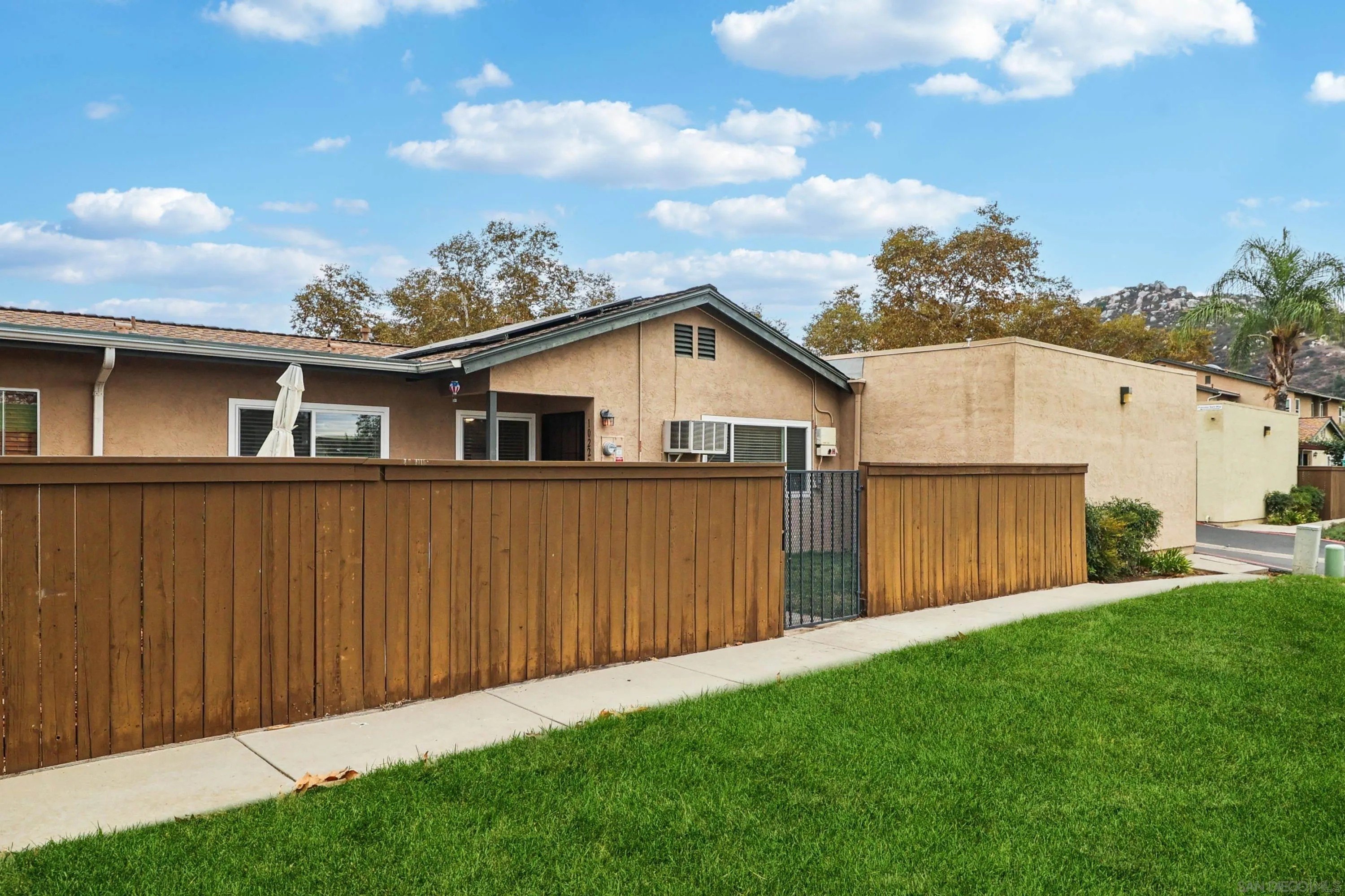 Incredible opportunity to own this beautifully updated 2BR, 1BA single-story corner unit in Riderwood Village (with an Assumable VA Loan at 4.99%)! This home lives like a detached home with no one above and a generous-sized private yard perfect for relaxing, BBQs, gardening, or giving your pups room to play. Inside, you'll love the refreshed kitchen layout with quartz counters, shaker-style cabinets, SS appliances, a smart slide-in gas range and a decorative overhead exhaust hood. The kitchen is open to the living room, creating a lighter, airier feel while keeping connection. Even more updates include recessed LED lighting, newer fixtures, and durable LVP flooring throughout. Dual-pane vinyl windows and owned solar with fixed-rate loan at $86.11/mo (buyer to assume) provide comfort, energy efficiency, and lower utility bills. Other features to love: a walk-in closet in the primary bedroom, full-size in-unit laundry, a 1-car attached garage plus an assigned parking space just outside. Don't forget the additional possible savings with the assumable VA loan at 4.99% (subject to buyer's qualification and seller's and lender's approval). Riderwood Village includes greenbelts, 3 parklike playgrounds, and 2 pools one of which overlooks Woodglen Vista Park that features sports courts, walking paths, skate zone, BBQ areas, a dog park, and more. You're also close to Trolley Square, YMCA, and Sportsplex Santee for even more shopping, dining, and recreation options. Convenience, comfort, and community all in one. WOW ~ Welcome Home!