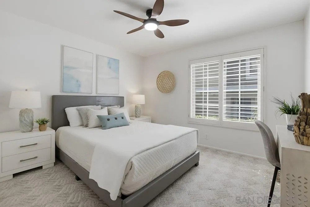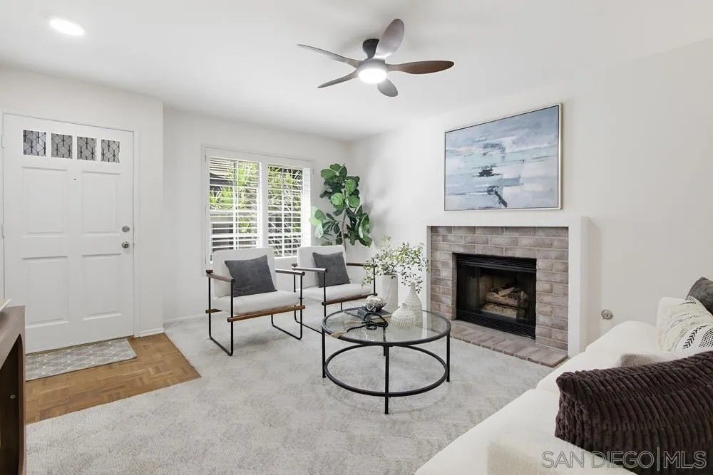 Tucked away in the sought-after Groves community, this light-filled corner townhome offers the perfect blend of comfort, privacy, and convenience. The single-level layout features 2 bedrooms, 2 baths, and 1,066 sq. ft. of thoughtfully designed living space. Recently refreshed with smooth ceilings, fresh interior paint, and updated fixtures, the home feels modern and move-in ready. Enjoy a welcoming living room with a cozy fireplace, dual-pane windows throughout, and a private enclosed patio-perfect for morning coffee or evening gatherings. The updated kitchen combines style and functionality with stainless steel appliances and smart storage solutions. A dedicated laundry area, whole home water filtration and energy-efficient tankless water heater add everyday convenience. Additional highlights include a detached one-car garage with extra storage, the privacy of being an end-unit and beautiful community pool and tennis courts. Set within one of Carmel Valley's most desirable communities, this home offers easy access to top-rated schools, beautiful parks, shopping, dining, and everything that makes coastal San Diego living so exceptional.