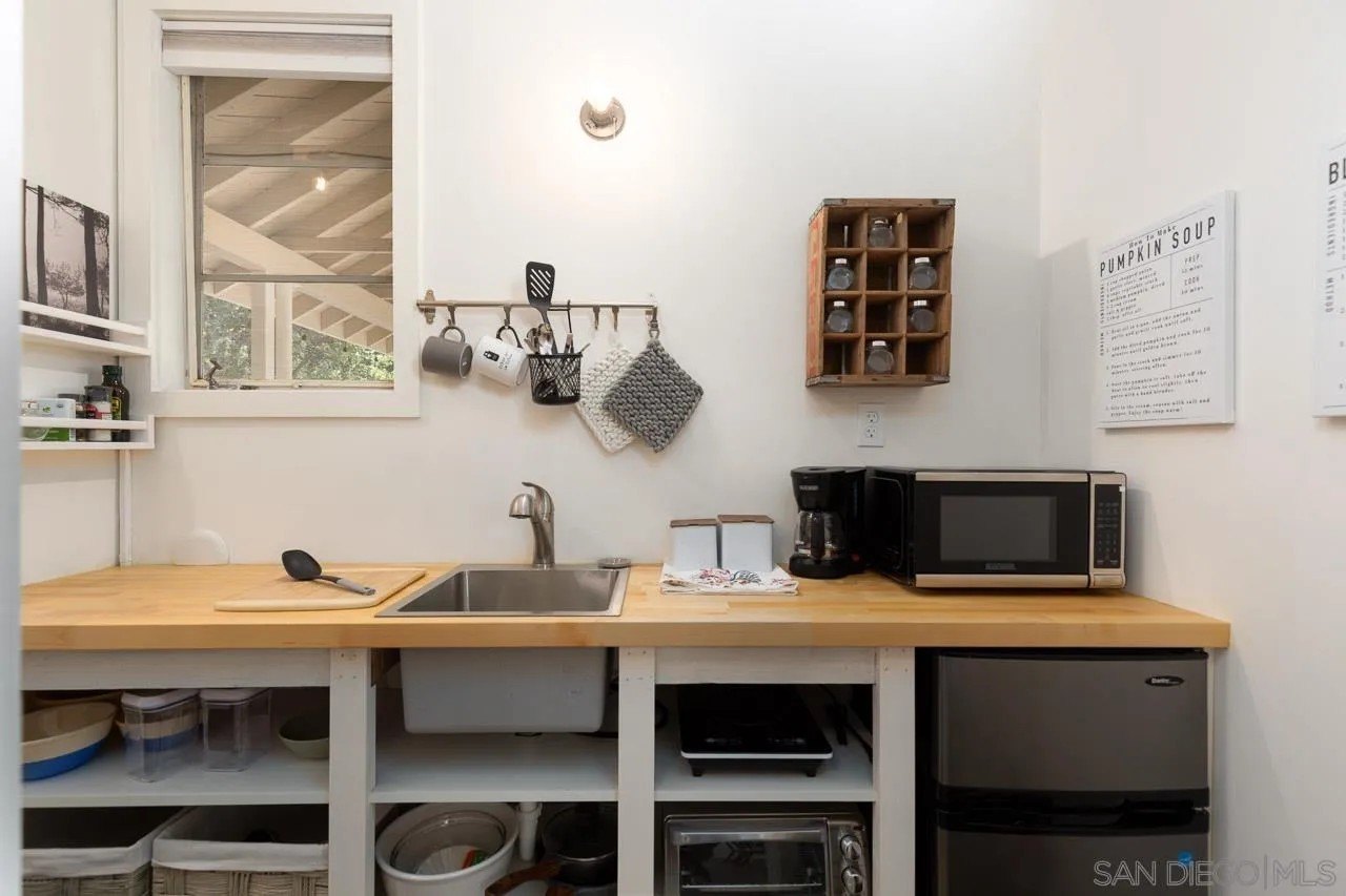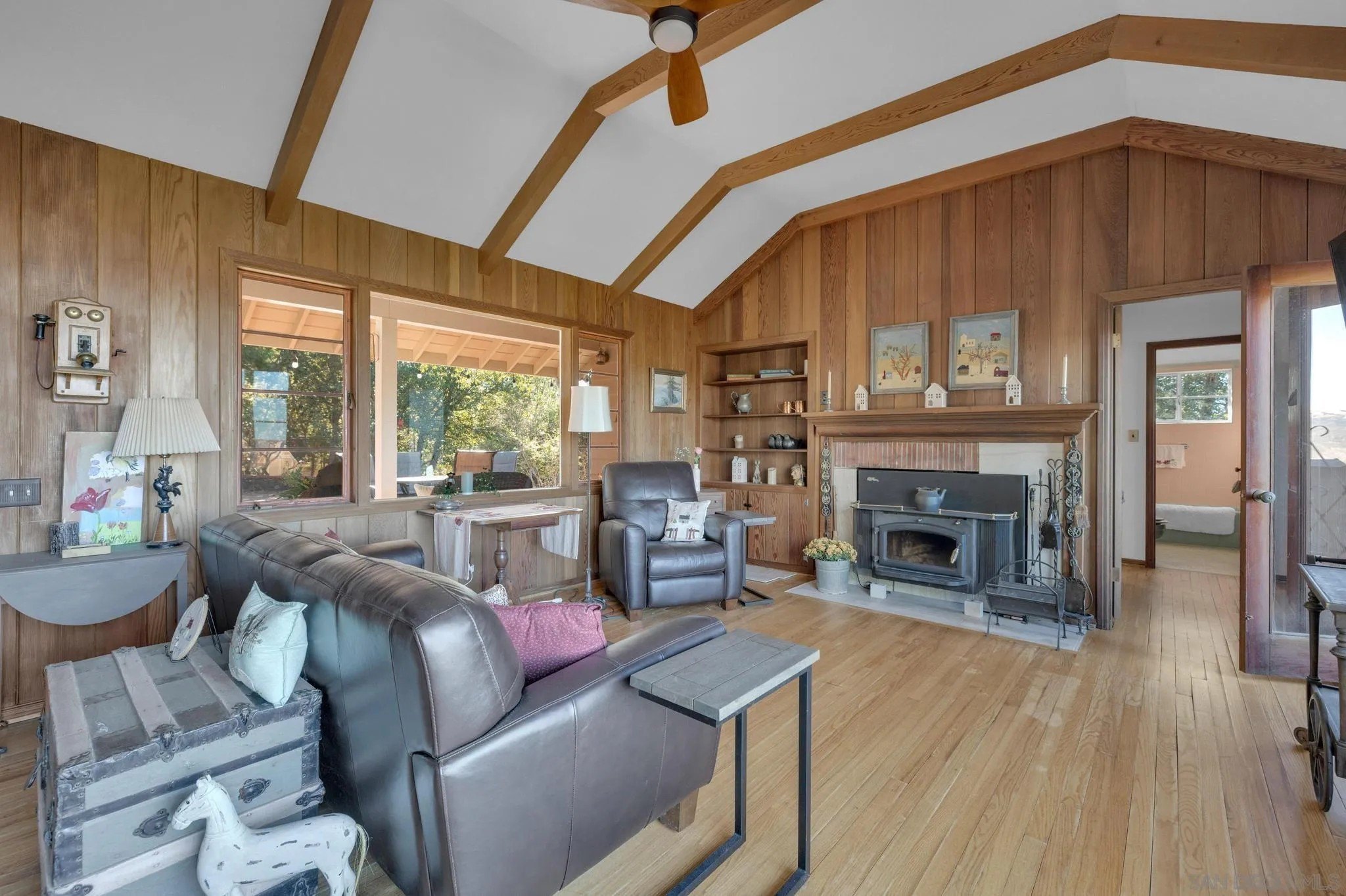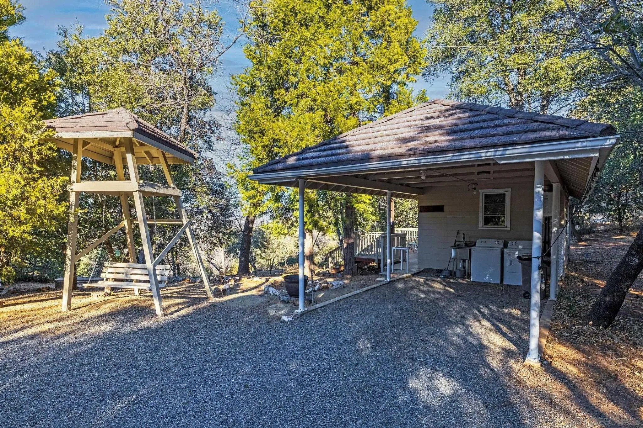 AMAZING VIEWS! Nestled at the top of a scenic hill in Julian's highly sought-after Pine Hills neighborhood, this captivating 1949 home exudes timeless mountain charm and privacy. With only three part-time owners, this remarkable property offers 1.16 acres of serene natural beauty, with old oaks, towering pines, and manzanita. A highlight of the property is the detached guest studio with a deck, and the flagstone courtyard, with its natural stone-lined pathways, providing a tranquil escape for relaxation and outdoor enjoyment. The panoramic views of the Volcan Mountain range will take your breath away. This is an ideal setting for birdwatching and observing the local wildlife, including herds of deer, turkeys, and the occasional fox. The home is in charming original condition, reflecting the thoughtful design of its first owner-an engineer and designer. The classic vintage tile, fixtures, fireplace, and wood floors create a nostalgic allure. The exterior is crafted with hard old-grove redwood siding, known for durability and beauty. The home features zoned area heating and air conditioning mini-splits for efficient performance, two water heaters (including one for the separate studio), and a large Elvira wood-burning insert for cozy warmth on cooler days. This home blends comfort with character. The property includes an attached and detached garage, a carport, and ample parking for guests. The land is cleared and meticulously maintained, ensuring easy access and usability. With a metal-tiled roof and pest-resistant old grove redwood siding.Move in ready!