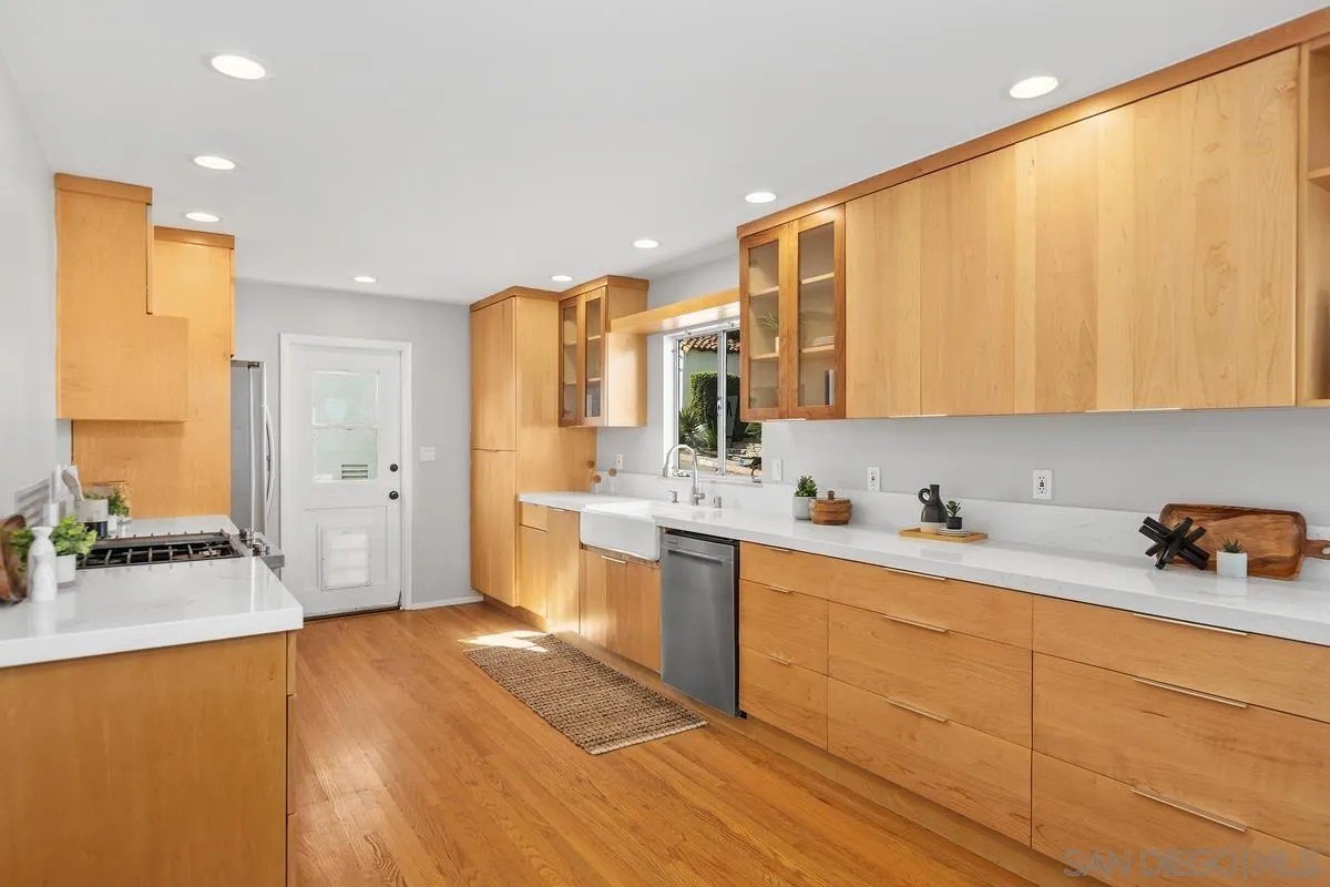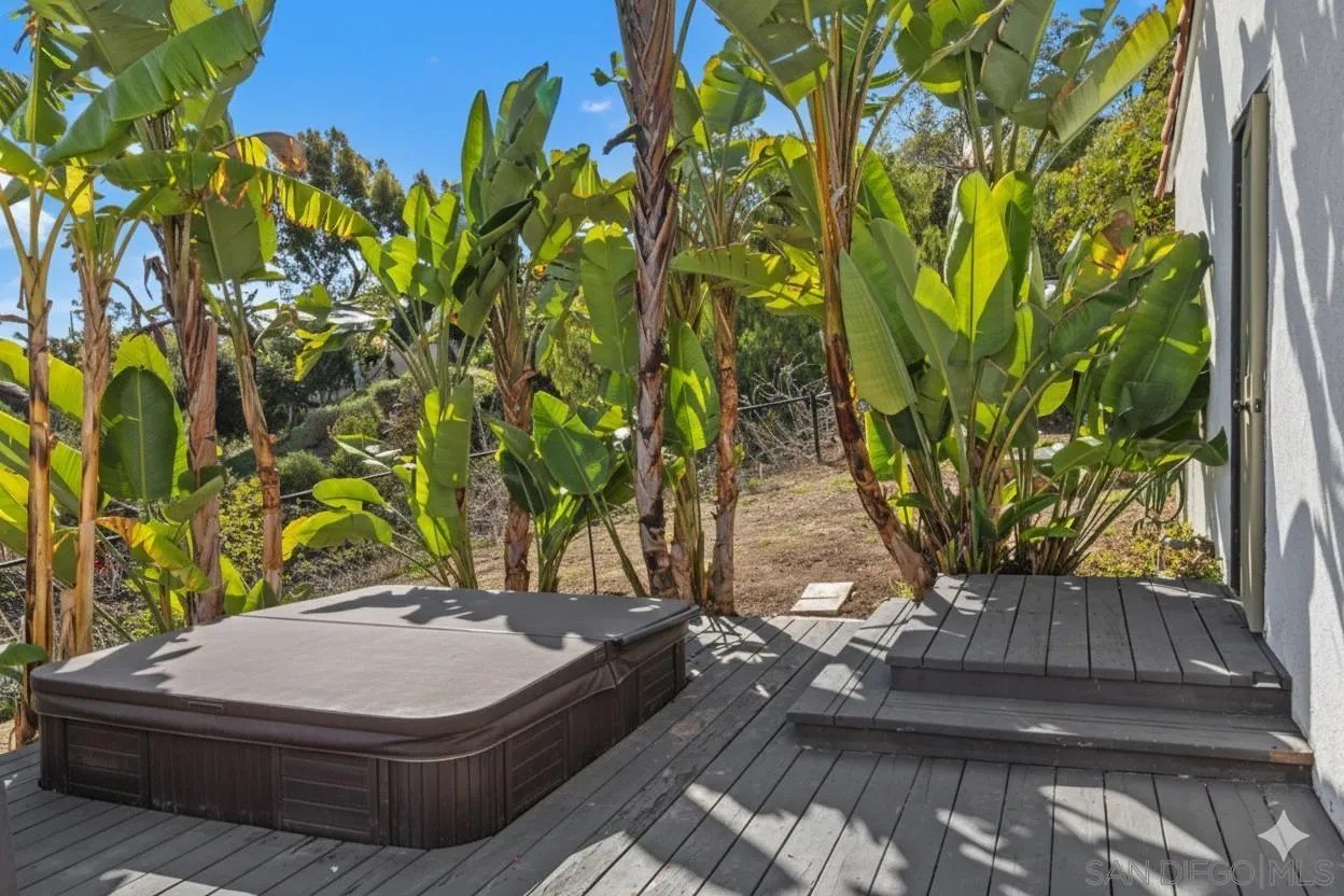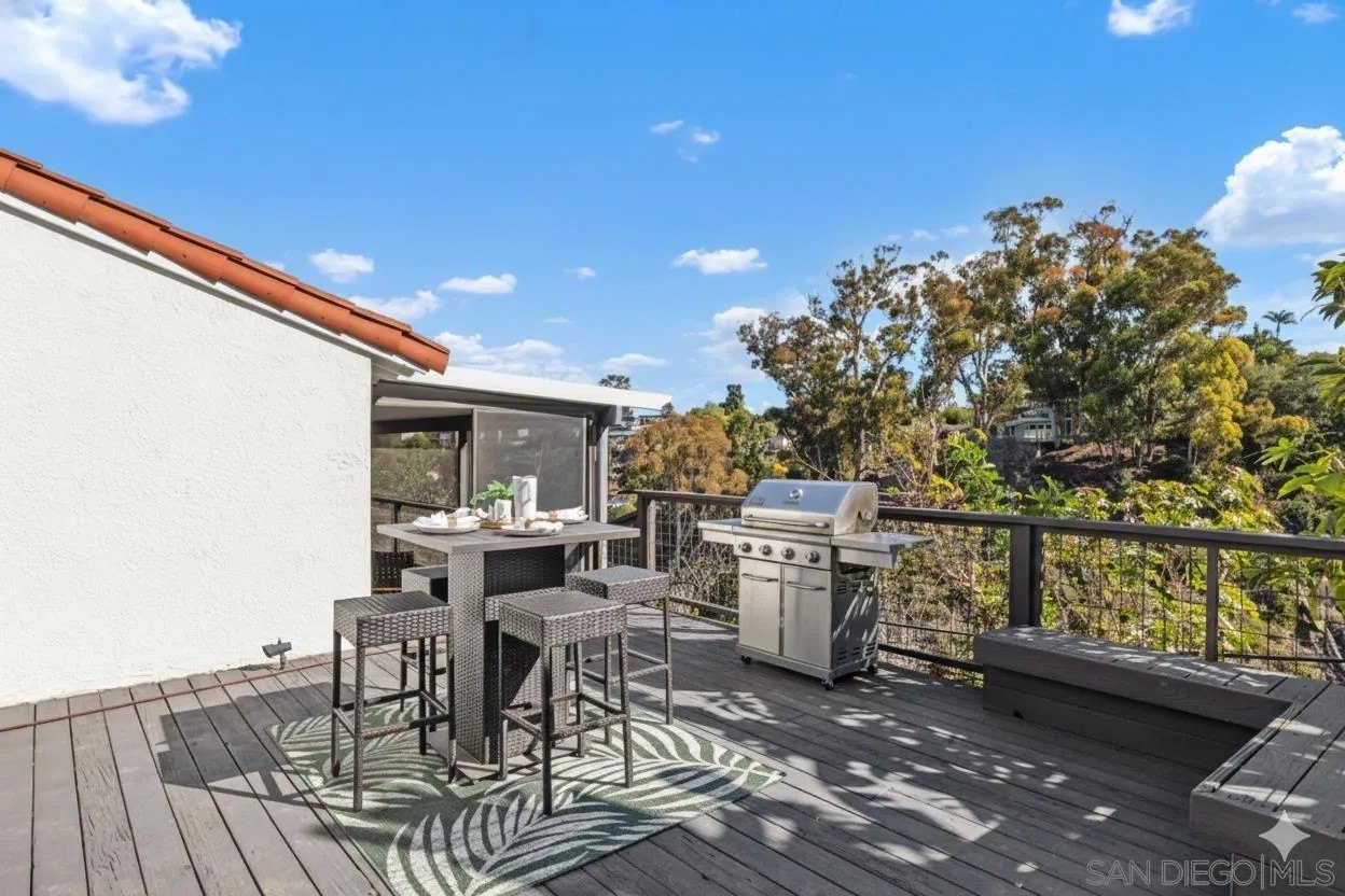 Discover this hidden gem in the highly coveted Randolph Terraces of Mission Hills, perfectly perched on a serene canyon with peaceful, tree-filled views. This beautifully maintained home lives like a single-level, with an additional lower-level family room / flex space, complete with its own private entrance, ideal for guests, multigenerational living, or possible conversion to a small studio ADU. Inside, relish the original hardwood floors, soft grey walls, and crisp white baseboards creating a calm calming and inviting atmosphere. Large windows and glass doors fill the open living space with natural light, framing stunning canyon vistas and providing easy access onto the oversized view deck. The large kitchen is the gathering place, with easy access to the backyard and fit with modern updates; featuring custom cabinetry, stainless steel appliances, sleek white countertops, pull-out drawers, and a built-in bar nook finished with a beverage cooler and custom shelving. Bathrooms shine with beautifully crafted custom tile work and brushed gold hardware. The private deck, complete with a built-in hot-tub, expands thoughtfully between the living room, primary bedroom, courtyard and detached garage with multiple access points, perfectly blending indoor and outdoor California living. The spacious backyard, filled with fruit trees, is ideal for entertaining or enjoying your own peaceful garden oasis.