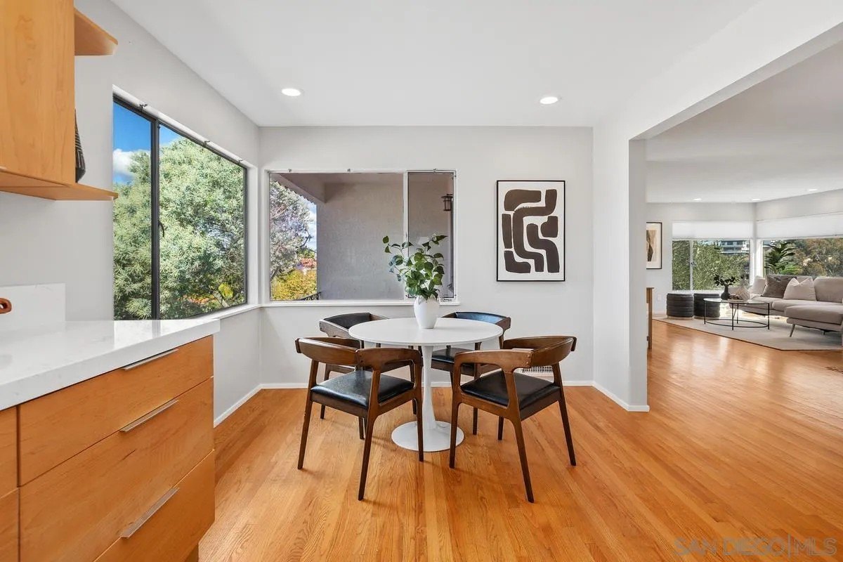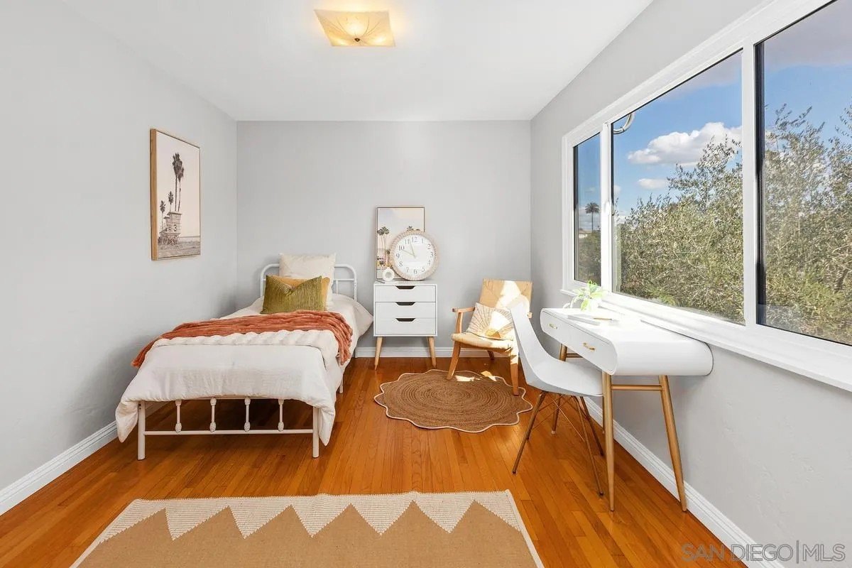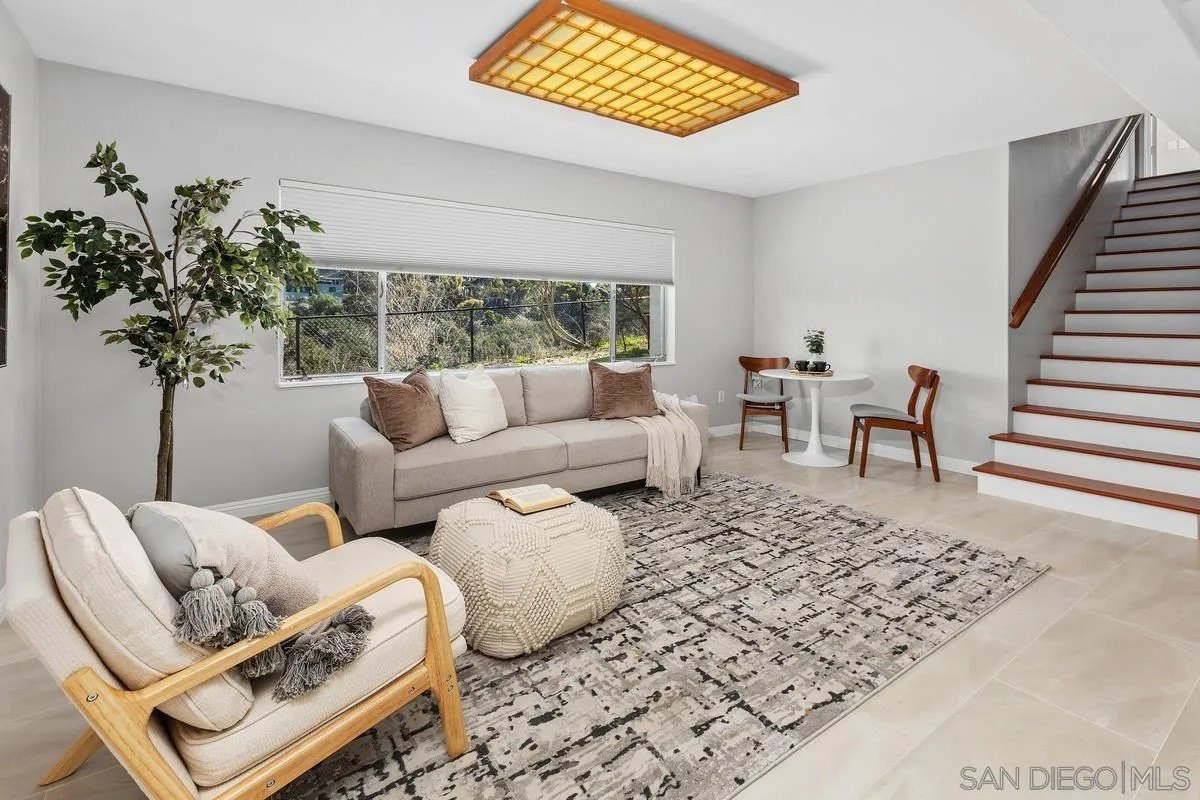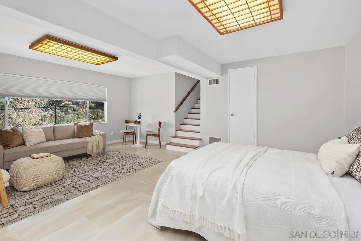 Discover this hidden gem in the highly coveted Randolph Terraces of Mission Hills, perfectly perched on a serene canyon with peaceful, tree-filled views. This beautifully maintained home lives like a single-level, with an additional lower-level family room / flex space, complete with its own private entrance, ideal for guests, multigenerational living, or possible conversion to a small studio ADU. Inside, relish the original hardwood floors, soft grey walls, and crisp white baseboards creating a calm calming and inviting atmosphere. Large windows and glass doors fill the open living space with natural light, framing stunning canyon vistas and providing easy access onto the oversized view deck. The large kitchen is the gathering place, with easy access to the backyard and fit with modern updates; featuring custom cabinetry, stainless steel appliances, sleek white countertops, pull-out drawers, and a built-in bar nook finished with a beverage cooler and custom shelving. Bathrooms shine with beautifully crafted custom tile work and brushed gold hardware. The private deck, complete with a built-in hot-tub, expands thoughtfully between the living room, primary bedroom, courtyard and detached garage with multiple access points, perfectly blending indoor and outdoor California living. The spacious backyard, filled with fruit trees, is ideal for entertaining or enjoying your own peaceful garden oasis.