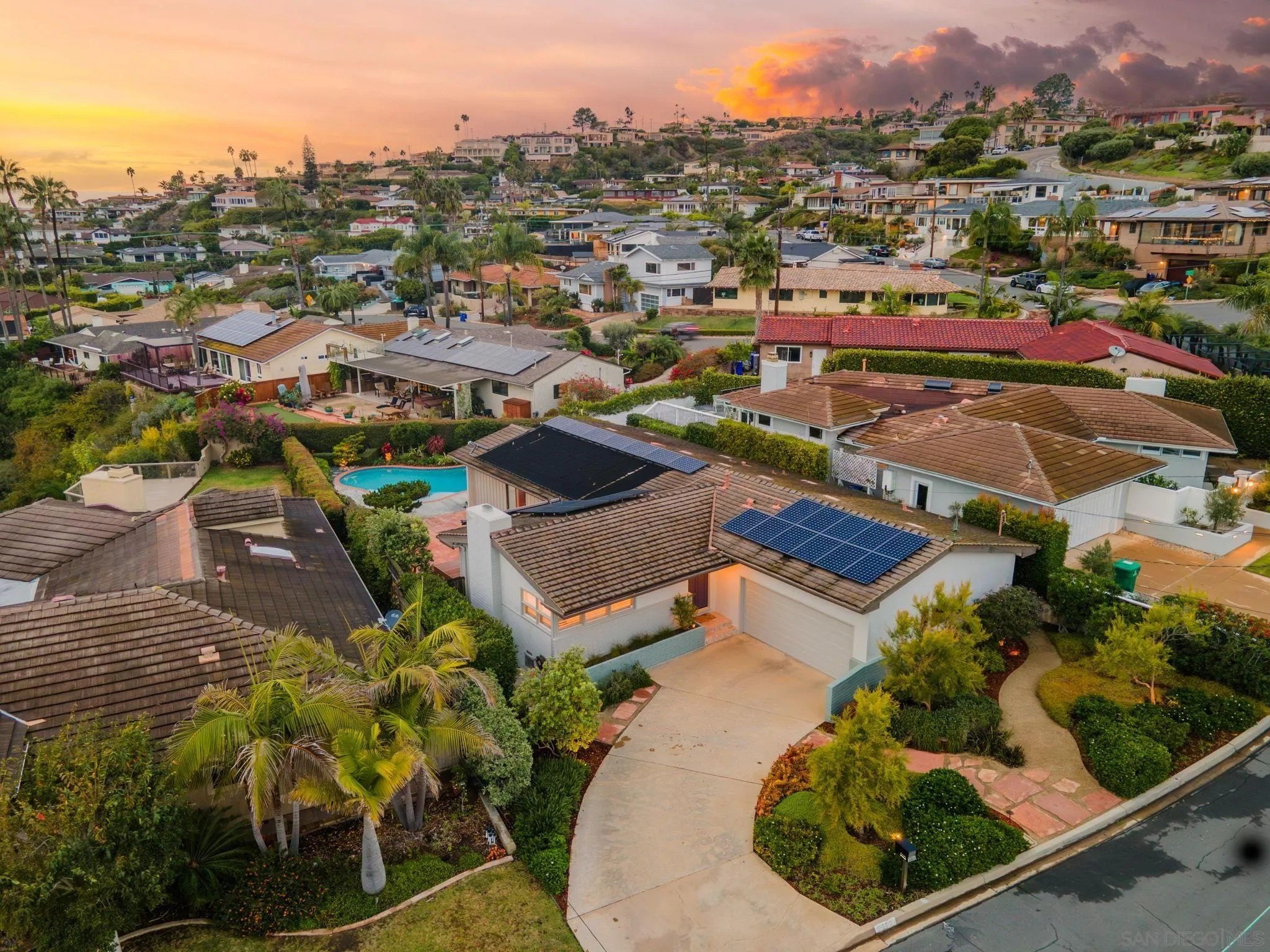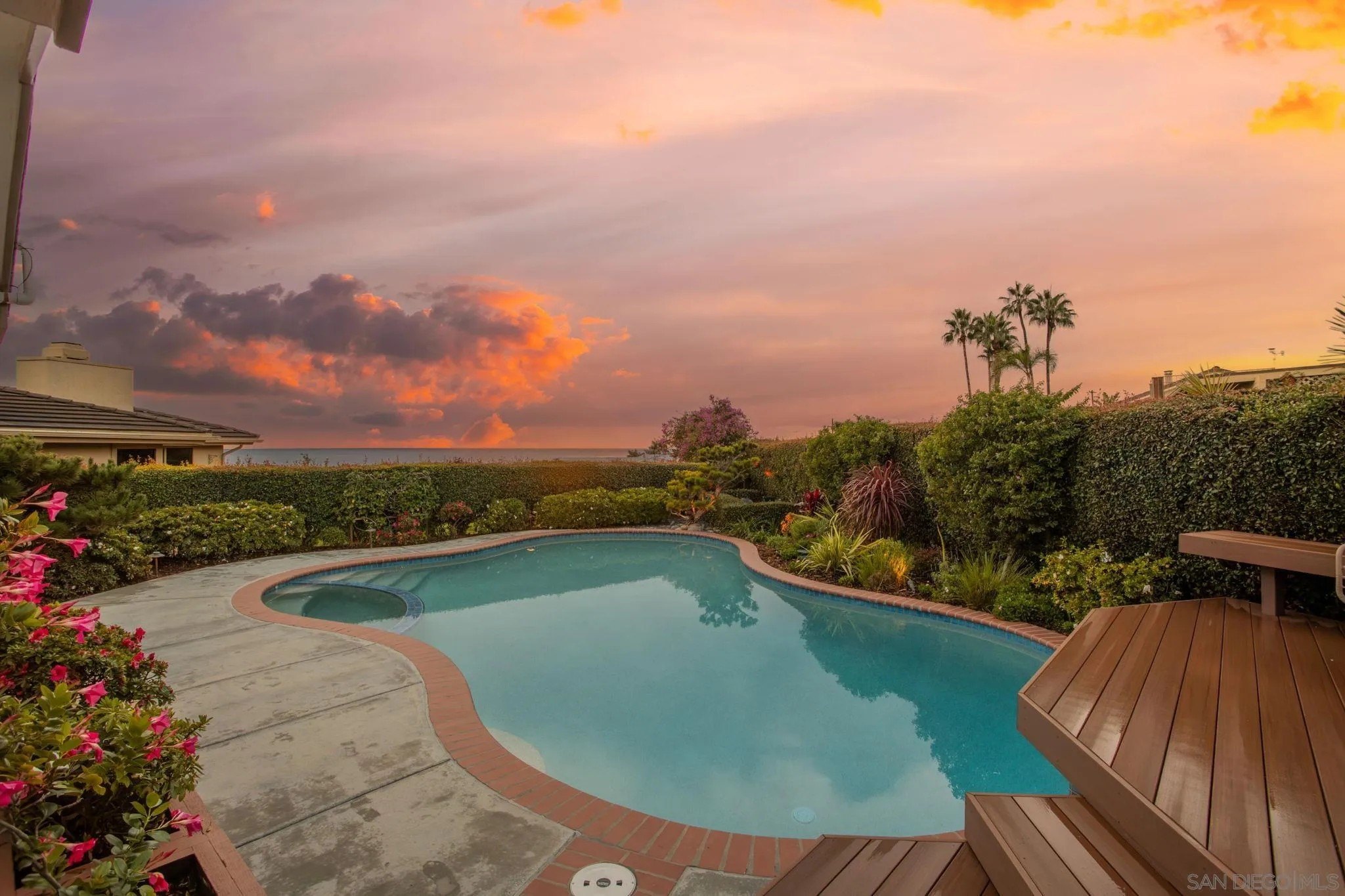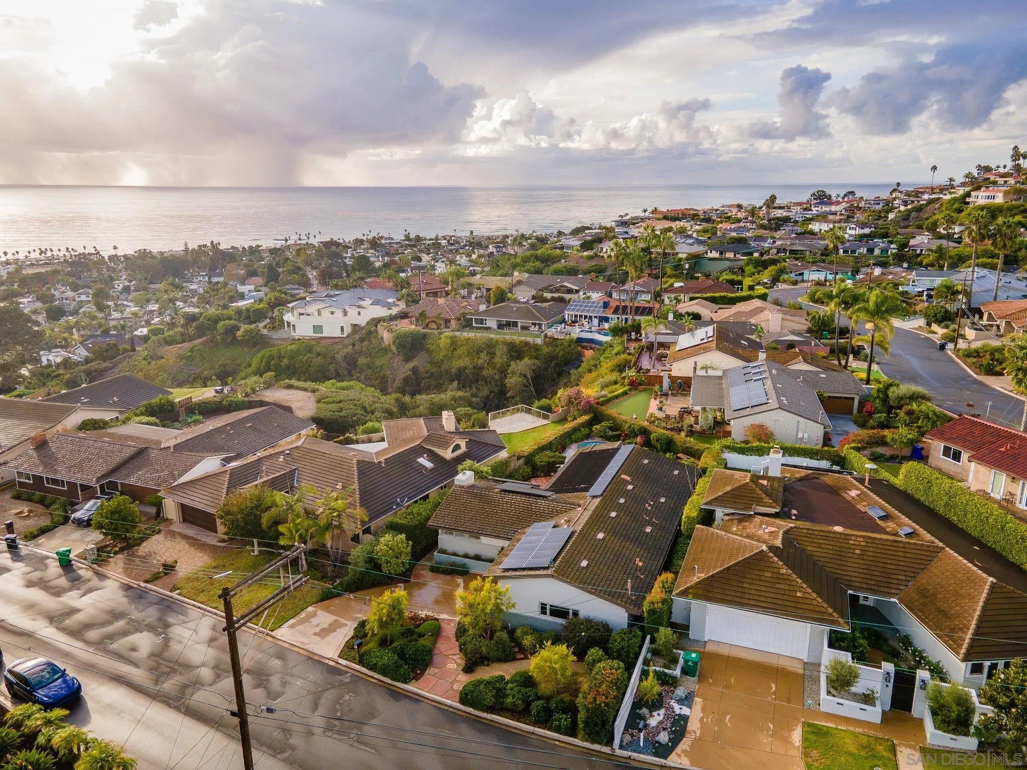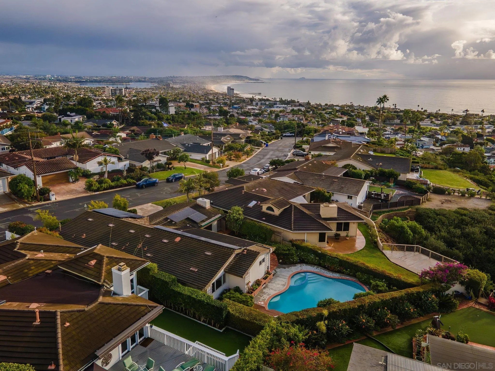 It doesn't get better than this single-level La Jolla home, ideally situated at the top of a quiet cul-de-sac above Bird Rock! On the market for the first time in over 40 years, this residence offers a rare combination of prime location, thoughtful updates, abundant natural light, and ocean views. Inside, a spacious living room welcomes you with hardwood floors, vaulted ceilings, plantation shutters, and large sliding doors that create seamless indoor-outdoor living. The well-appointed kitchen features custom solid cherry cabinetry, granite countertops, premium stainless steel appliances, a built-in Sub-Zero refrigerator, recessed lighting, and a gas cooktop. A cozy adjoining family room-also showcasing custom cherry cabinetry-opens directly to the home's private backyard retreat. The front and backyard create a beautifully designed oasis ideal for year-round enjoyment. Relax by the newly resurfaced pool and attached spa or on the updated deck, surrounded by mature landscaping designed by Todd Fry. A poolside waterfall and landscape lighting in both the front and back enhances the resort-style ambiance and sense of privacy. Additional upgrades include owned solar panels, dedicated solar pool heating, updated windows throughout, a replaced and insulated roof (2009), and a newer A/C system with upgraded air ducts. Don't miss this rare opportunity to make this beautifully maintained La Jolla property your own.