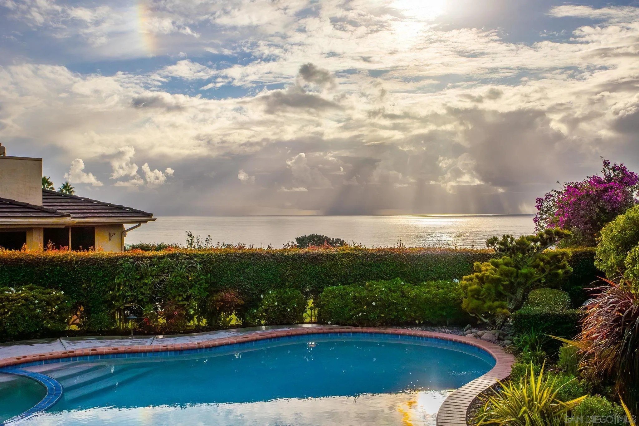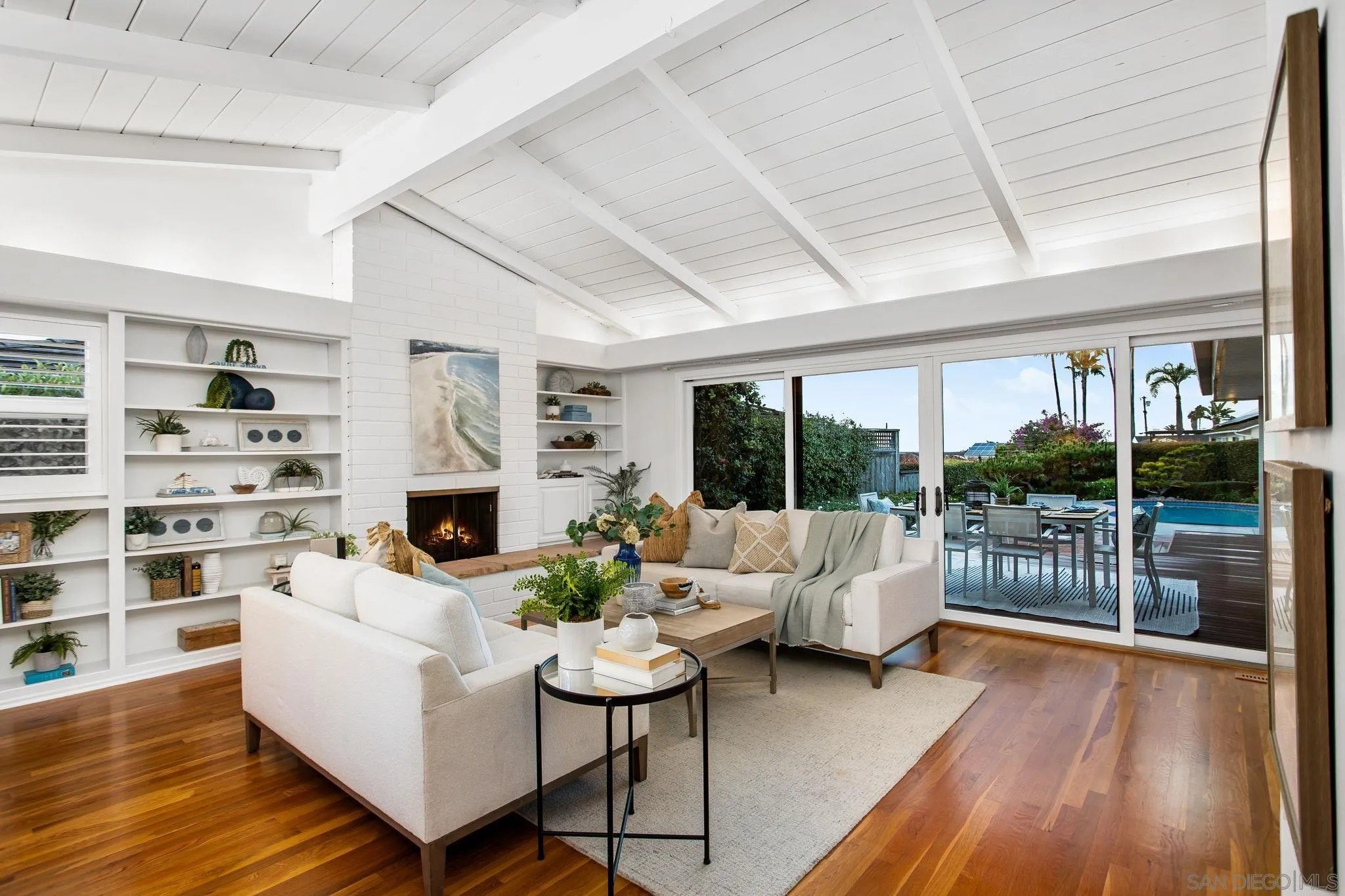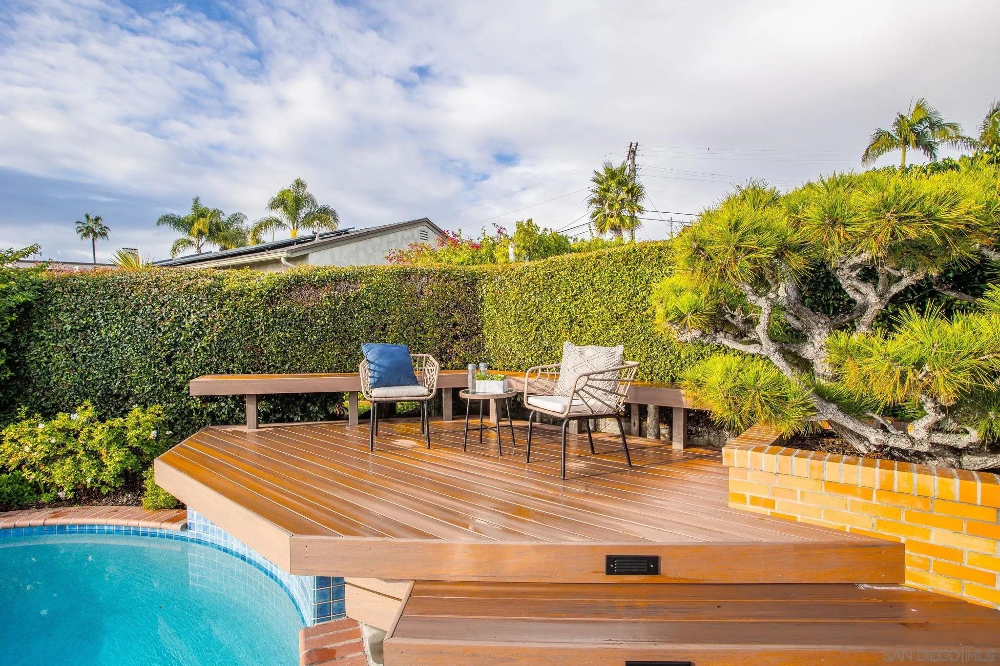 It doesn't get better than this single-level La Jolla home, ideally situated at the top of a quiet cul-de-sac above Bird Rock! On the market for the first time in over 40 years, this residence offers a rare combination of prime location, thoughtful updates, abundant natural light, and ocean views. Inside, a spacious living room welcomes you with hardwood floors, vaulted ceilings, plantation shutters, and large sliding doors that create seamless indoor-outdoor living. The well-appointed kitchen features custom solid cherry cabinetry, granite countertops, premium stainless steel appliances, a built-in Sub-Zero refrigerator, recessed lighting, and a gas cooktop. A cozy adjoining family room-also showcasing custom cherry cabinetry-opens directly to the home's private backyard retreat. The front and backyard create a beautifully designed oasis ideal for year-round enjoyment. Relax by the newly resurfaced pool and attached spa or on the updated deck, surrounded by mature landscaping designed by Todd Fry. A poolside waterfall and landscape lighting in both the front and back enhances the resort-style ambiance and sense of privacy. Additional upgrades include owned solar panels, dedicated solar pool heating, updated windows throughout, a replaced and insulated roof (2009), and a newer A/C system with upgraded air ducts. Don't miss this rare opportunity to make this beautifully maintained La Jolla property your own.