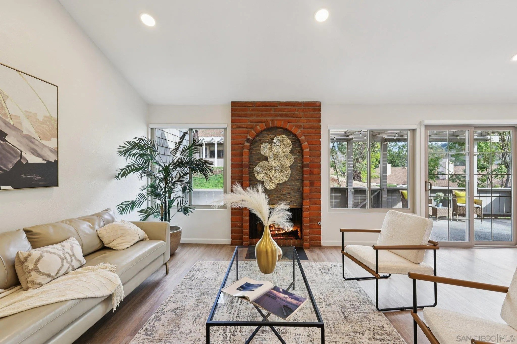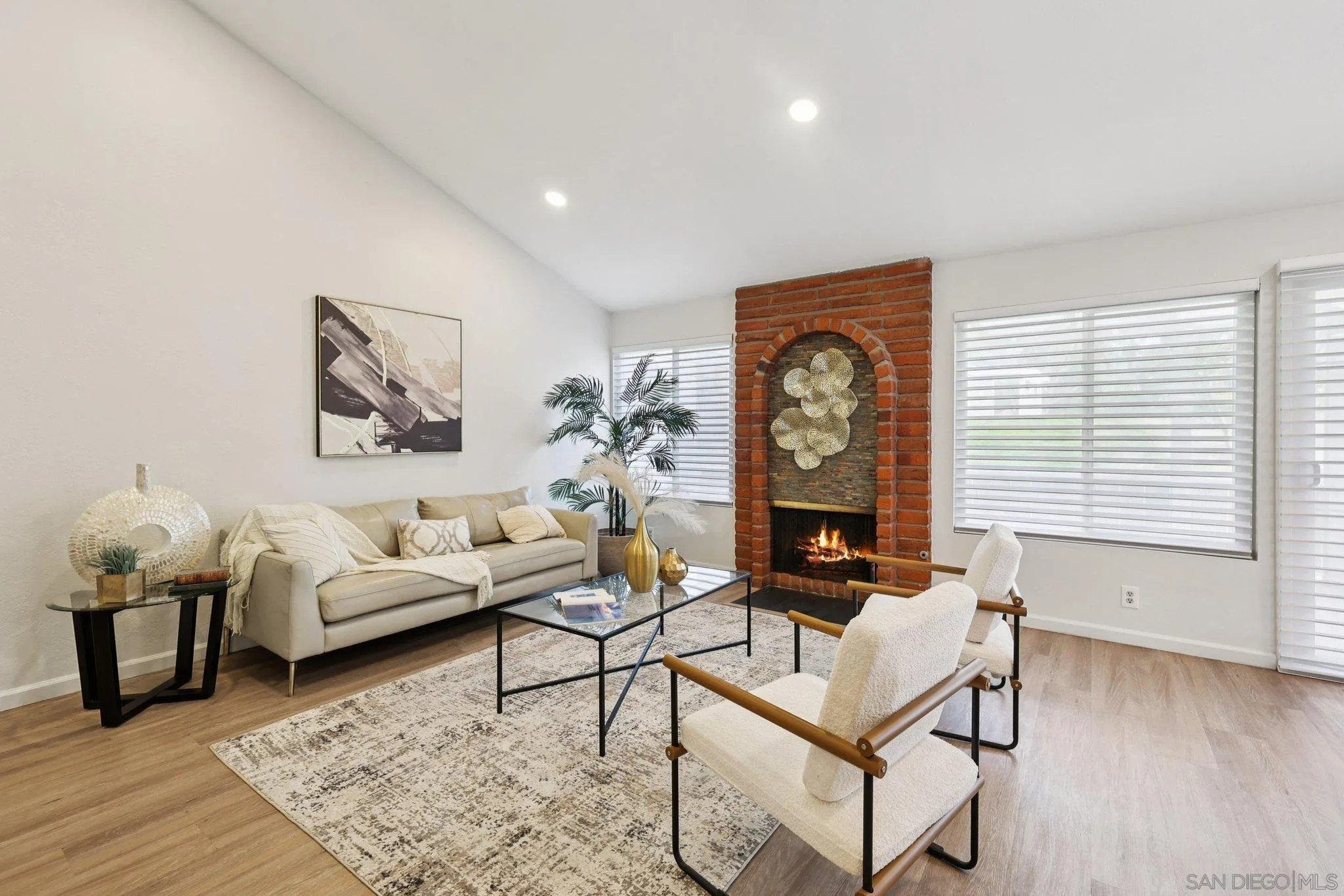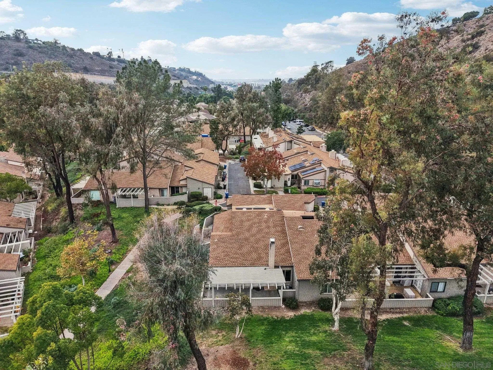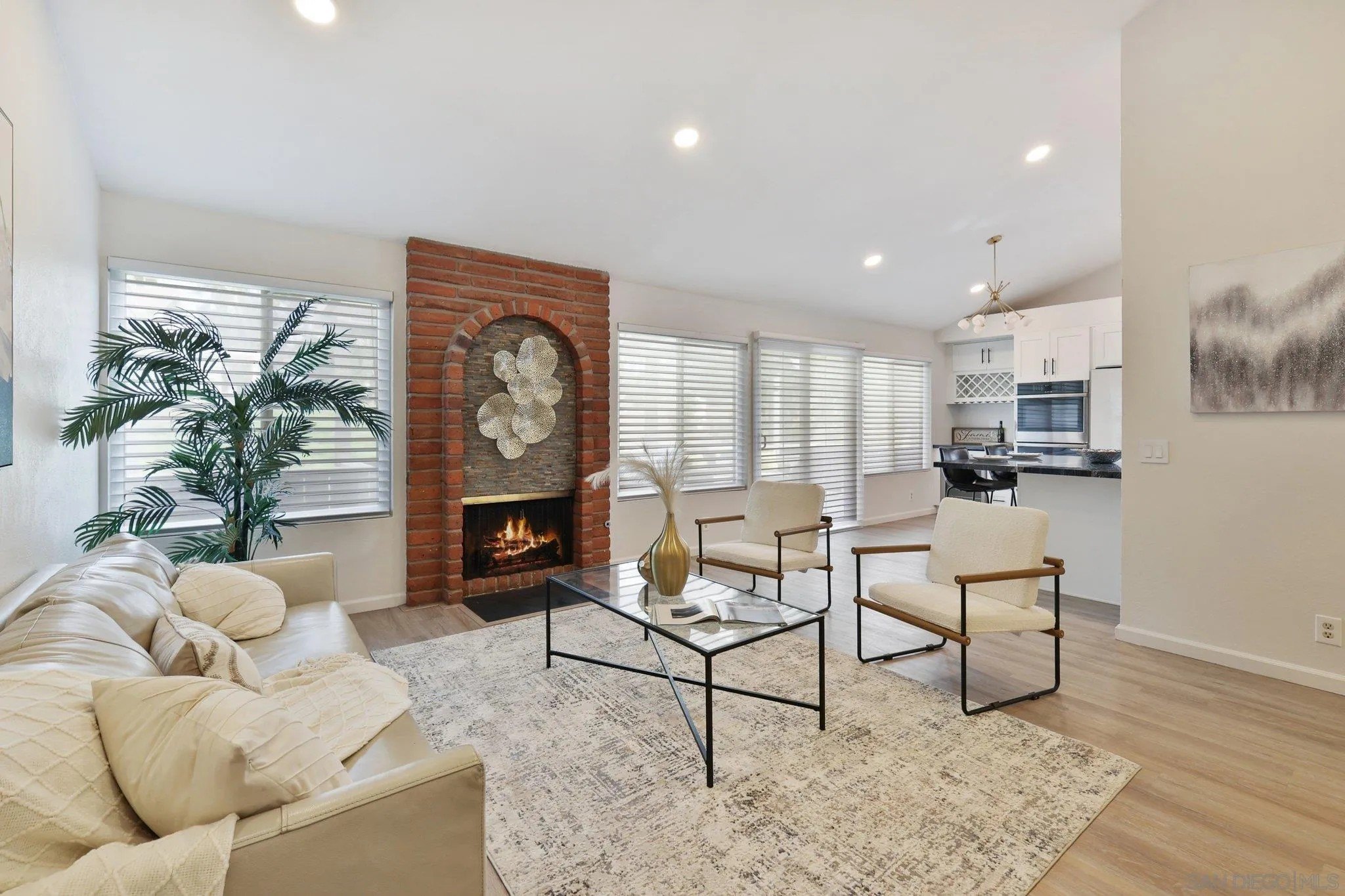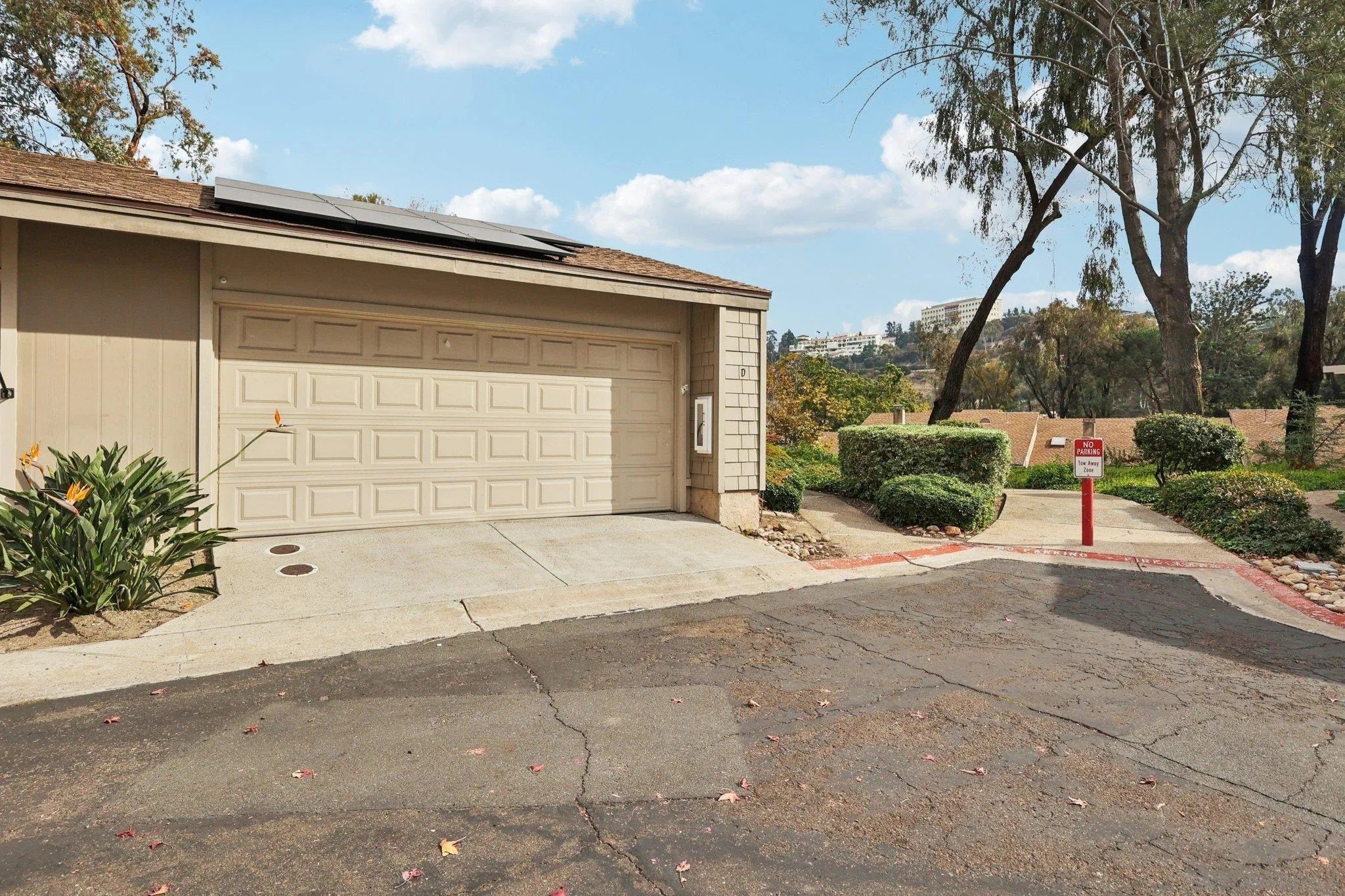 RARE CORNER UNIT SINGLE STORY HOME IN SMOKE TREE COMMUNITY * BEAUTIFULLY UPGRADED * MOUNTAIN AND SDSU VIEW * PAID OFF 15 PANEL SOLAR SYSTEM EV READY * 3 PATIOS AREA * 2 CAR GARAGE! Welcome to this rare single-story corner unit in the highly desirable Smoke Tree community, offering privacy, style, and effortless indoor-outdoor living. This beautifully updated three-bedroom, two-bath home features three separate patio areas, perfect for relaxing, gardening, or entertaining while enjoying a park-like setting with open mountain and SDSU views. The house is equipped with a paid-off 15-panel Baker Electric solar system and an EV-ready outlet, ensuring low energy costs and high convenience. Step inside to a bright, open layout with vaulted ceilings, recessed LED lighting, and custom motorized LEVOLOR window treatments in the living room. The living room features a cozy fireplace and seamless flow to the large patio with amazing views. The kitchen is a true showstopper, designed for the home chef, with a large center island, white shaker cabinetry, luxurious natural quartzite countertops, deep stainless steel sink, pull-out storage, and high-end stainless steel smart appliances, including a touchscreen LG refrigerator, induction cooktop, wine fridge, double ovens, and built-in microwave.