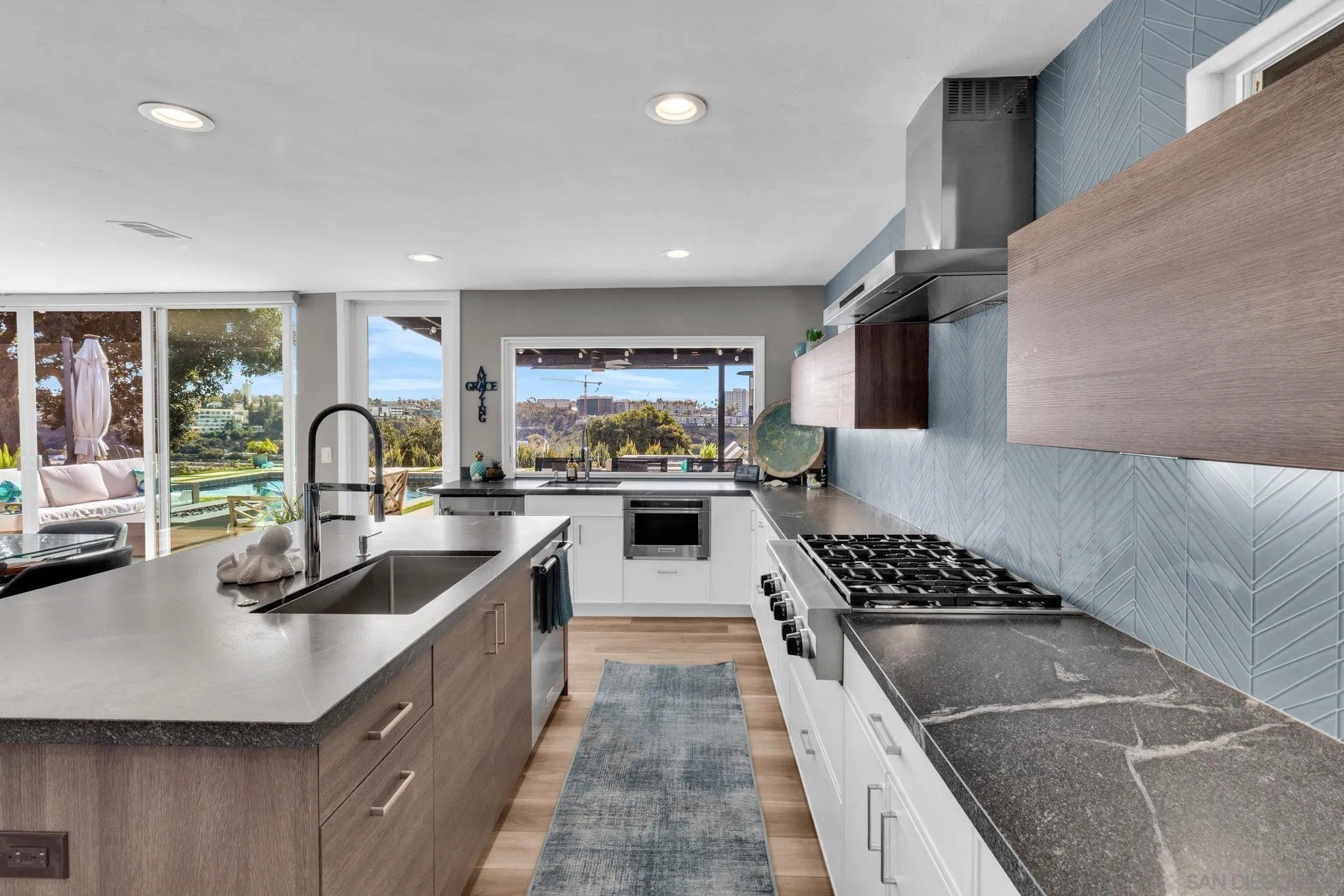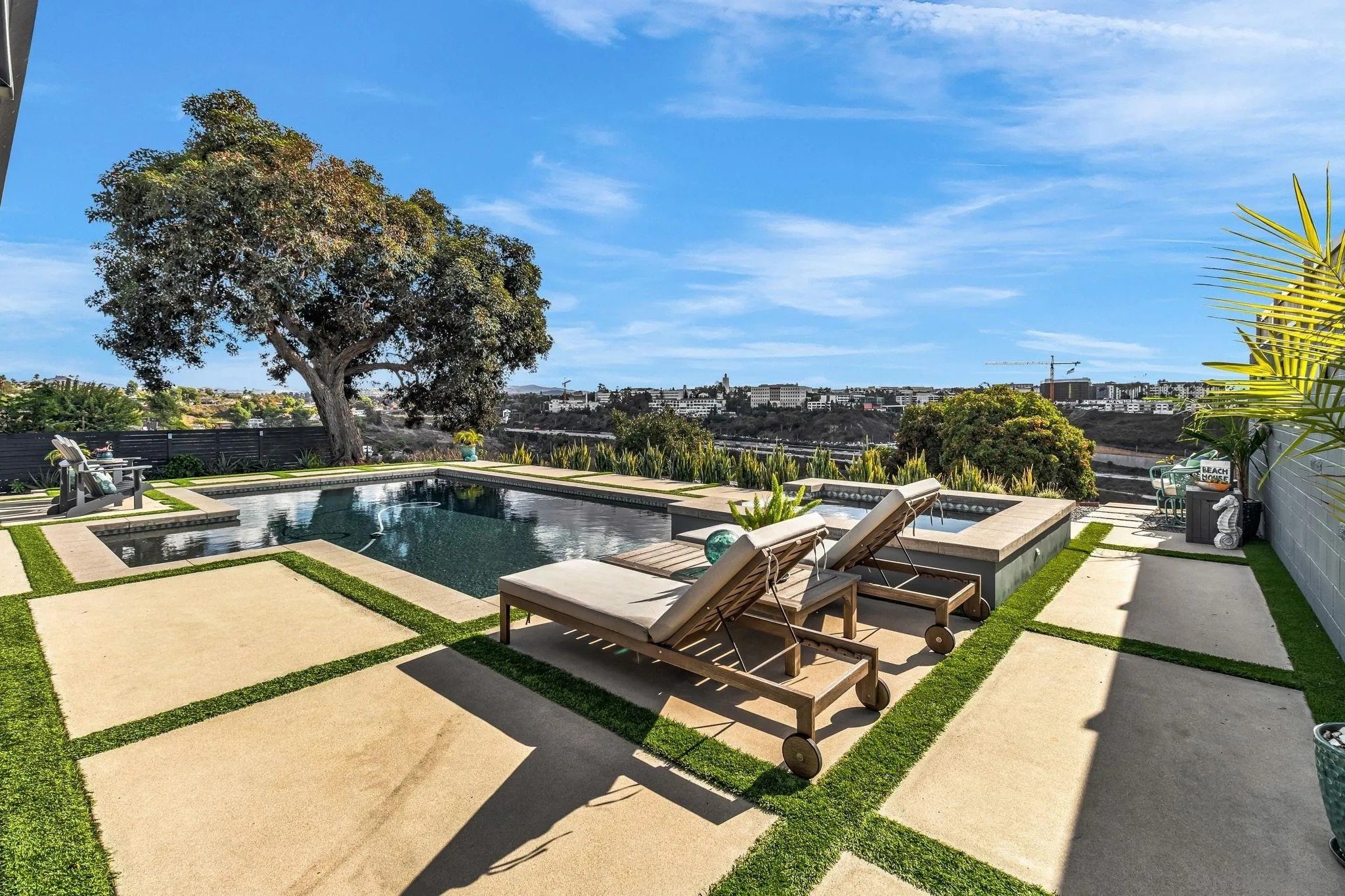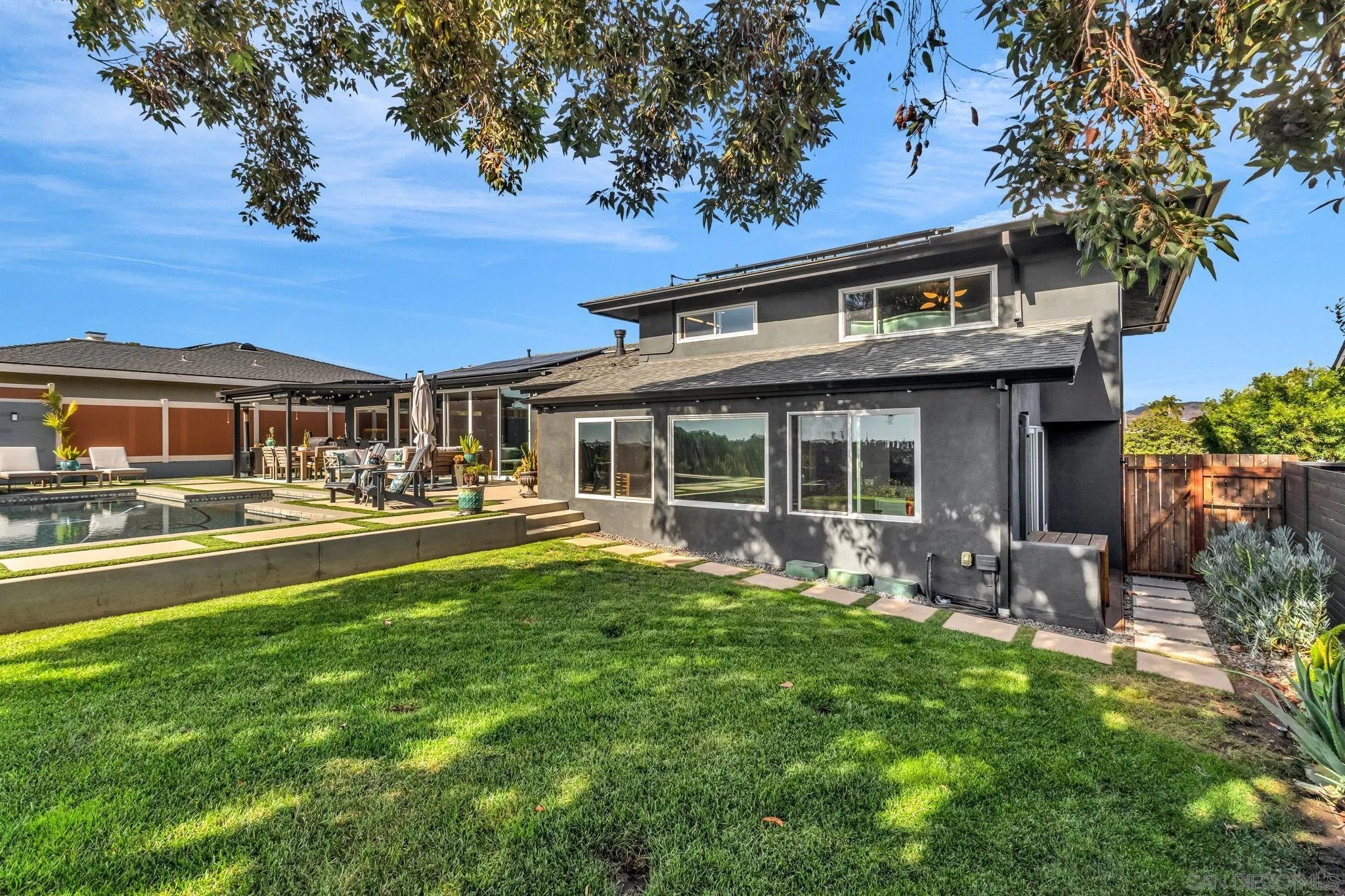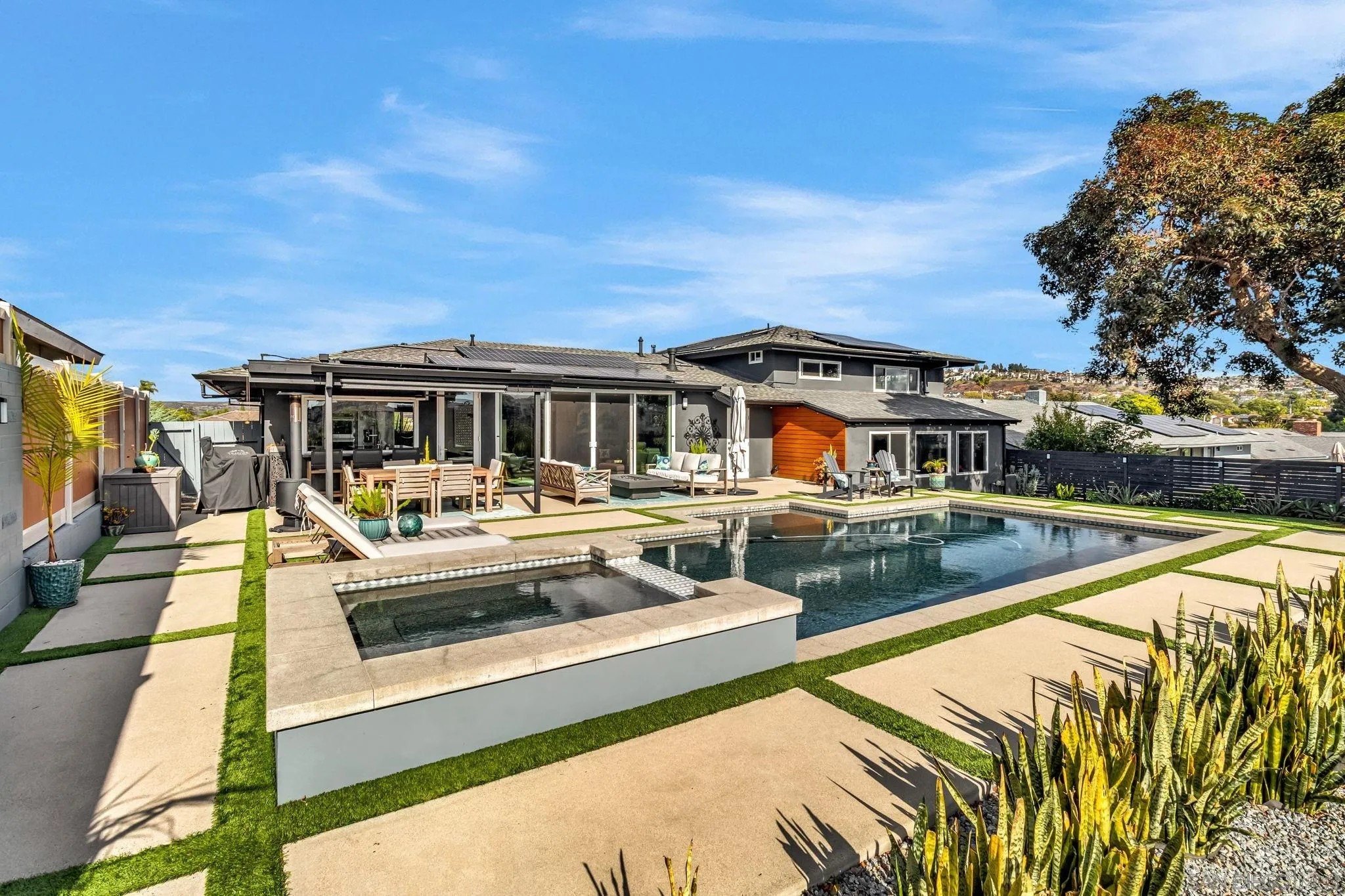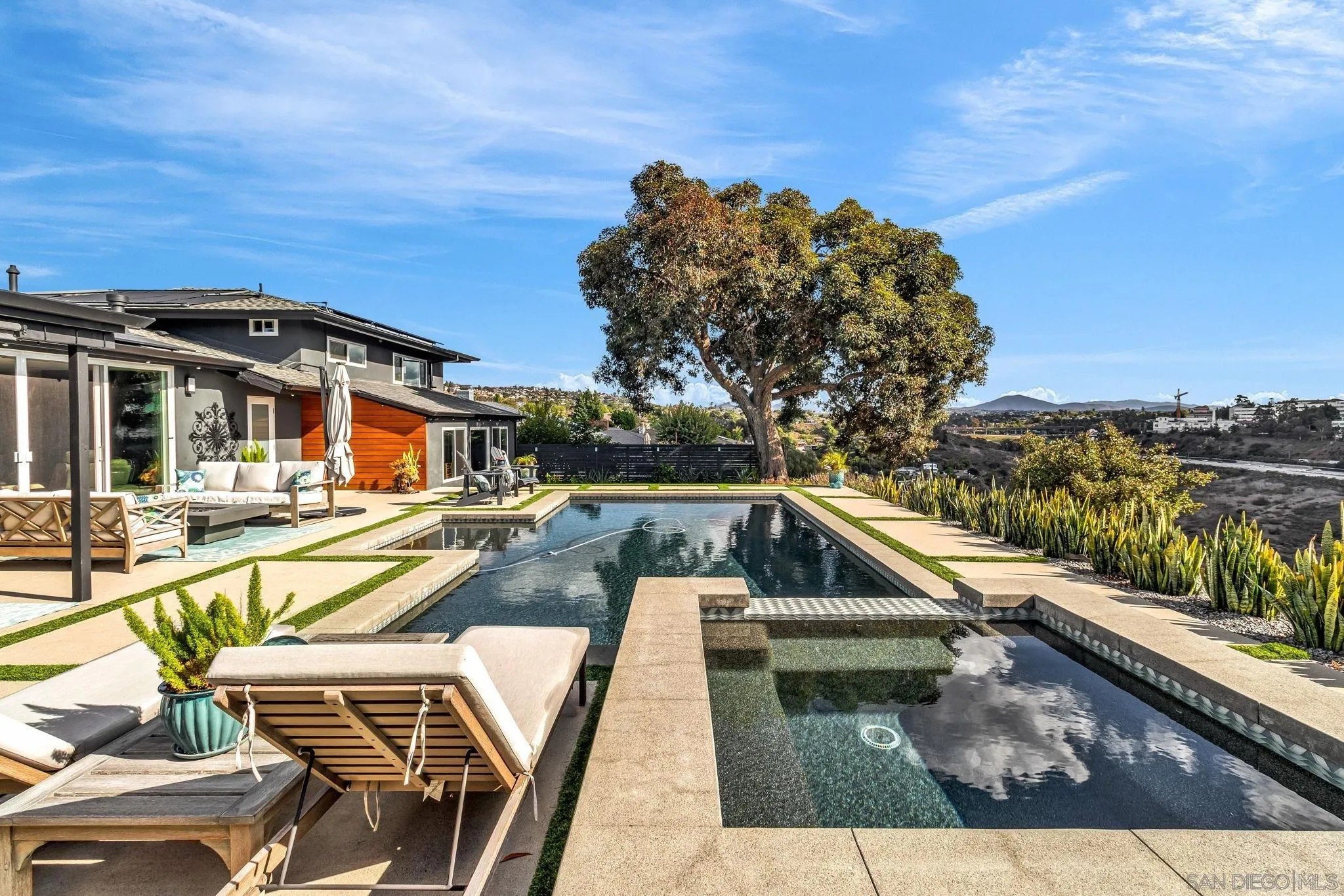 This split-level stunner is the one you've been waiting for! Located in the highly coveted Del Cerro neighborhood, this home offers everything you could possibly want and more. From the moment you arrive, the home's sleek modern design, minimalist landscaping, and tiled walkway leading to a custom pivot entry door set the tone for what's inside. Step through the front door and you're immediately welcomed by sweeping views and a beautifully tiled foyer. The open-concept main level features a spacious living room with a modern fireplace, a renovated chef's kitchen with an island, and an expansive 4-panel sliding door that seamlessly blends indoor and outdoor living. A custom pop-out kitchen window opens to an outdoor bar, perfect for year-round entertaining. The primary suite includes a remodeled en-suite bathroom and a generous walk-in closet. Additional bedrooms feature LVP flooring, custom closet doors, and upgraded light fixtures. All bathrooms have been tastefully remodeled. The newly renovated lower-level addition, currently used as an exercise room, offers a versatile flex space for a home office, studio, or secondary living area. The backyard is an entertainer's dream, with a sparkling saltwater pool and spa, covered patio, grassy area, views, and no immediate rear neighbor. Modern concrete hardscaping with turf infill adds a clean, contemporary finish. The home also includes owned solar, and the garage features epoxy flooring and EV-charging capability. Ideally positioned near freeways, shopping, and within walking distance of highly rated Hearst Elementary.