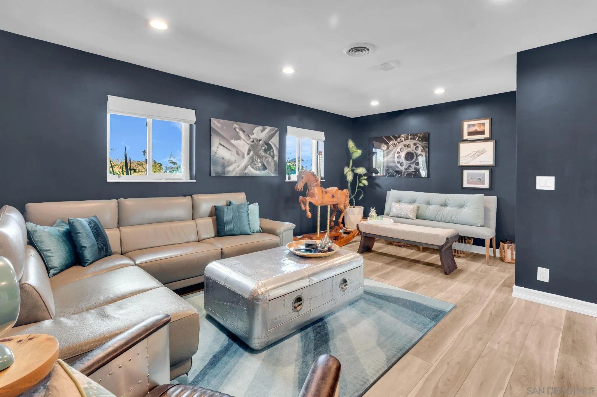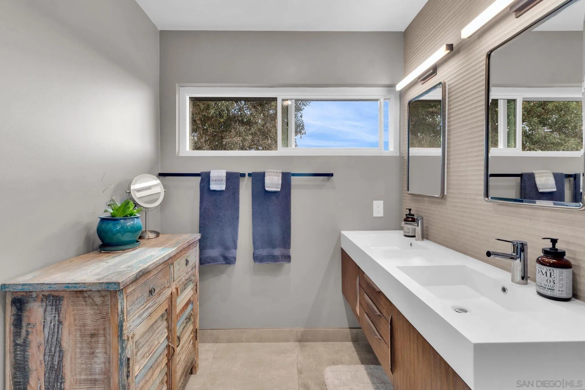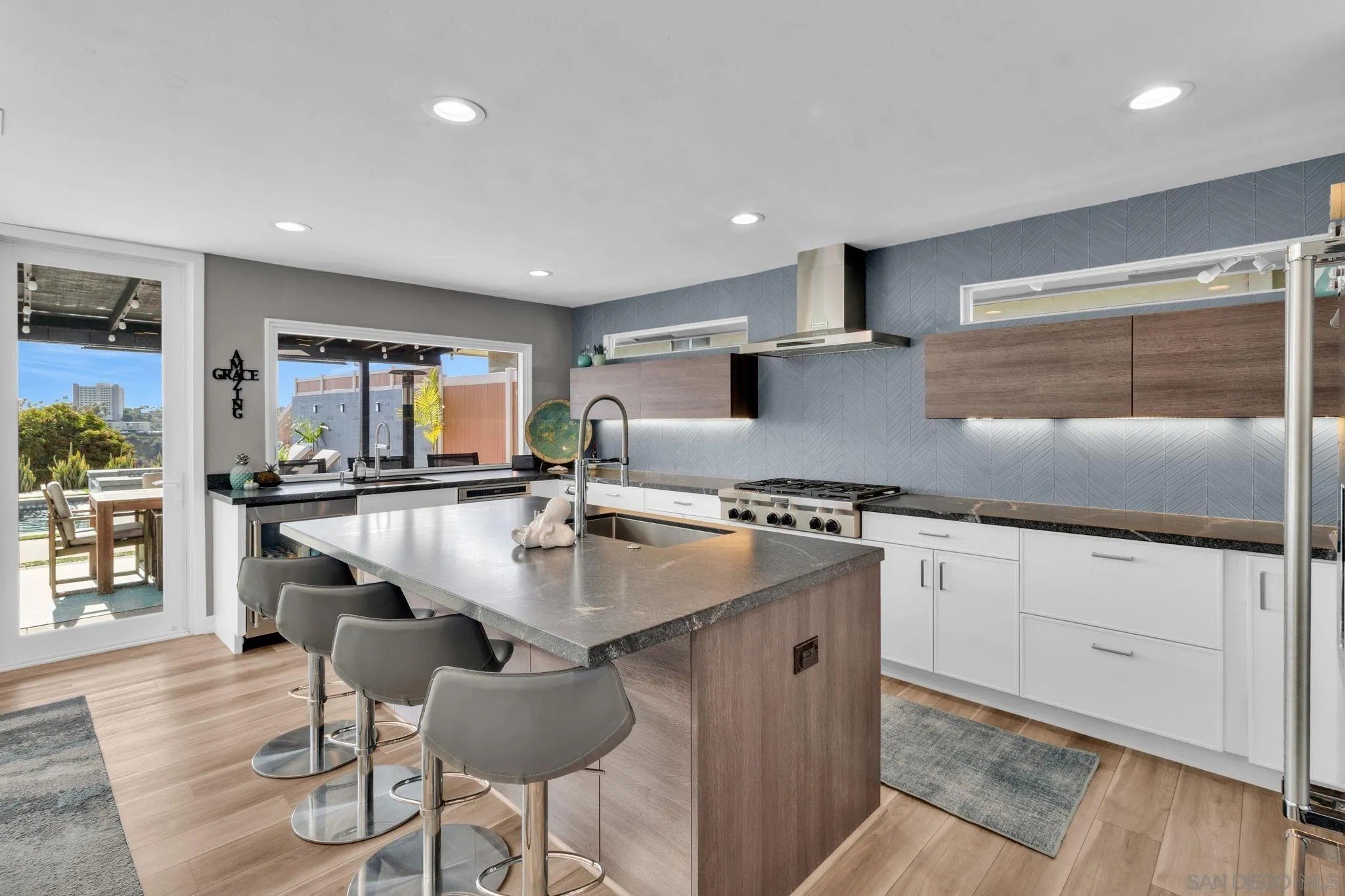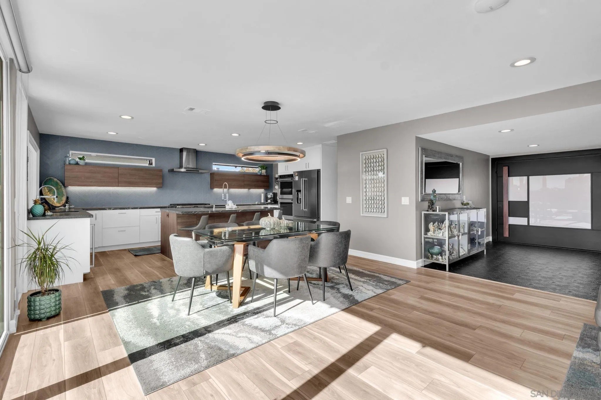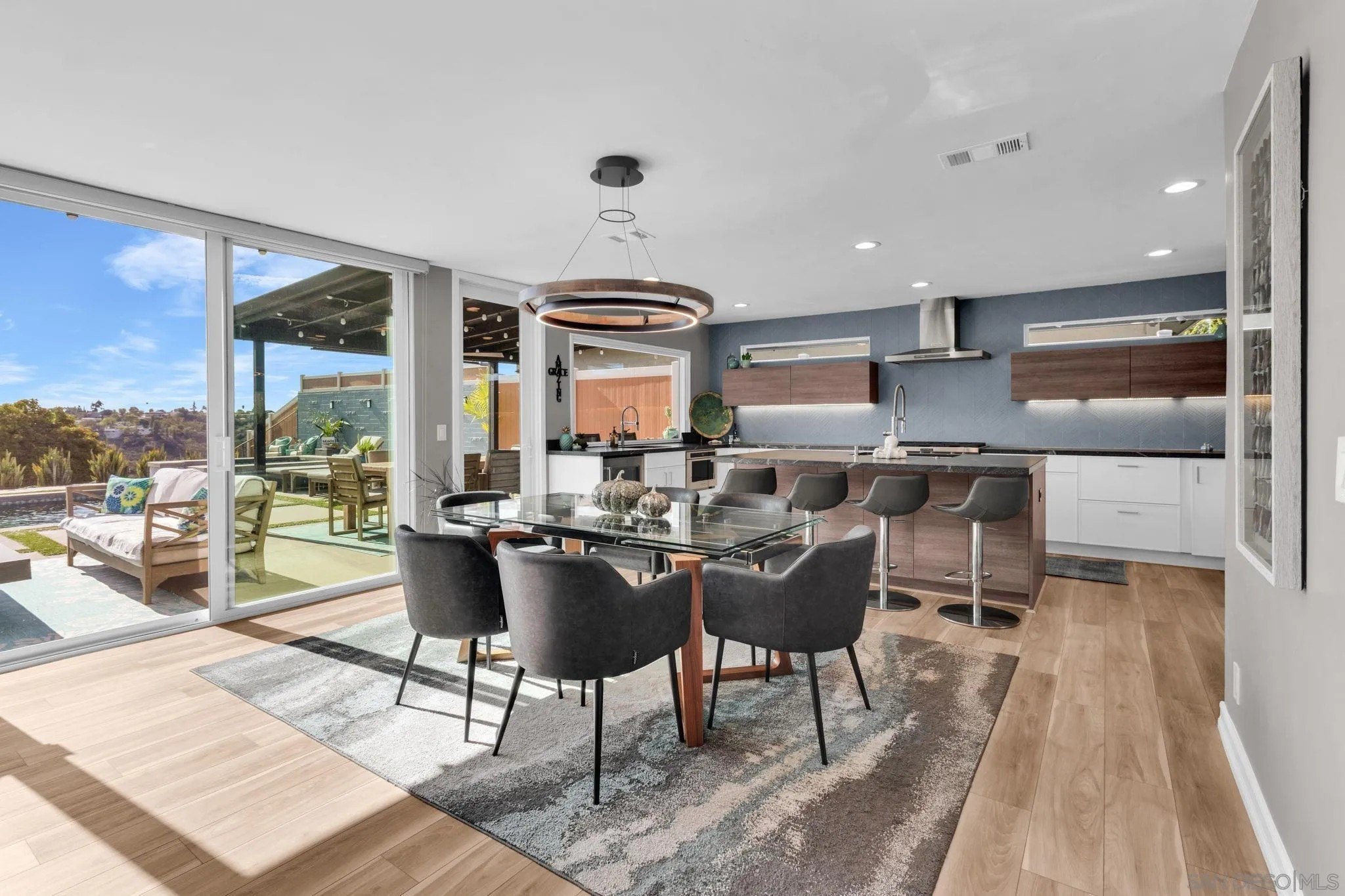 This split-level stunner is the one you've been waiting for! Located in the highly coveted Del Cerro neighborhood, this home offers everything you could possibly want and more. From the moment you arrive, the home's sleek modern design, minimalist landscaping, and tiled walkway leading to a custom pivot entry door set the tone for what's inside. Step through the front door and you're immediately welcomed by sweeping views and a beautifully tiled foyer. The open-concept main level features a spacious living room with a modern fireplace, a renovated chef's kitchen with an island, and an expansive 4-panel sliding door that seamlessly blends indoor and outdoor living. A custom pop-out kitchen window opens to an outdoor bar, perfect for year-round entertaining. The primary suite includes a remodeled en-suite bathroom and a generous walk-in closet. Additional bedrooms feature LVP flooring, custom closet doors, and upgraded light fixtures. All bathrooms have been tastefully remodeled. The newly renovated lower-level addition, currently used as an exercise room, offers a versatile flex space for a home office, studio, or secondary living area. The backyard is an entertainer's dream, with a sparkling saltwater pool and spa, covered patio, grassy area, views, and no immediate rear neighbor. Modern concrete hardscaping with turf infill adds a clean, contemporary finish. The home also includes owned solar, and the garage features epoxy flooring and EV-charging capability. Ideally positioned near freeways, shopping, and within walking distance of highly rated Hearst Elementary.
