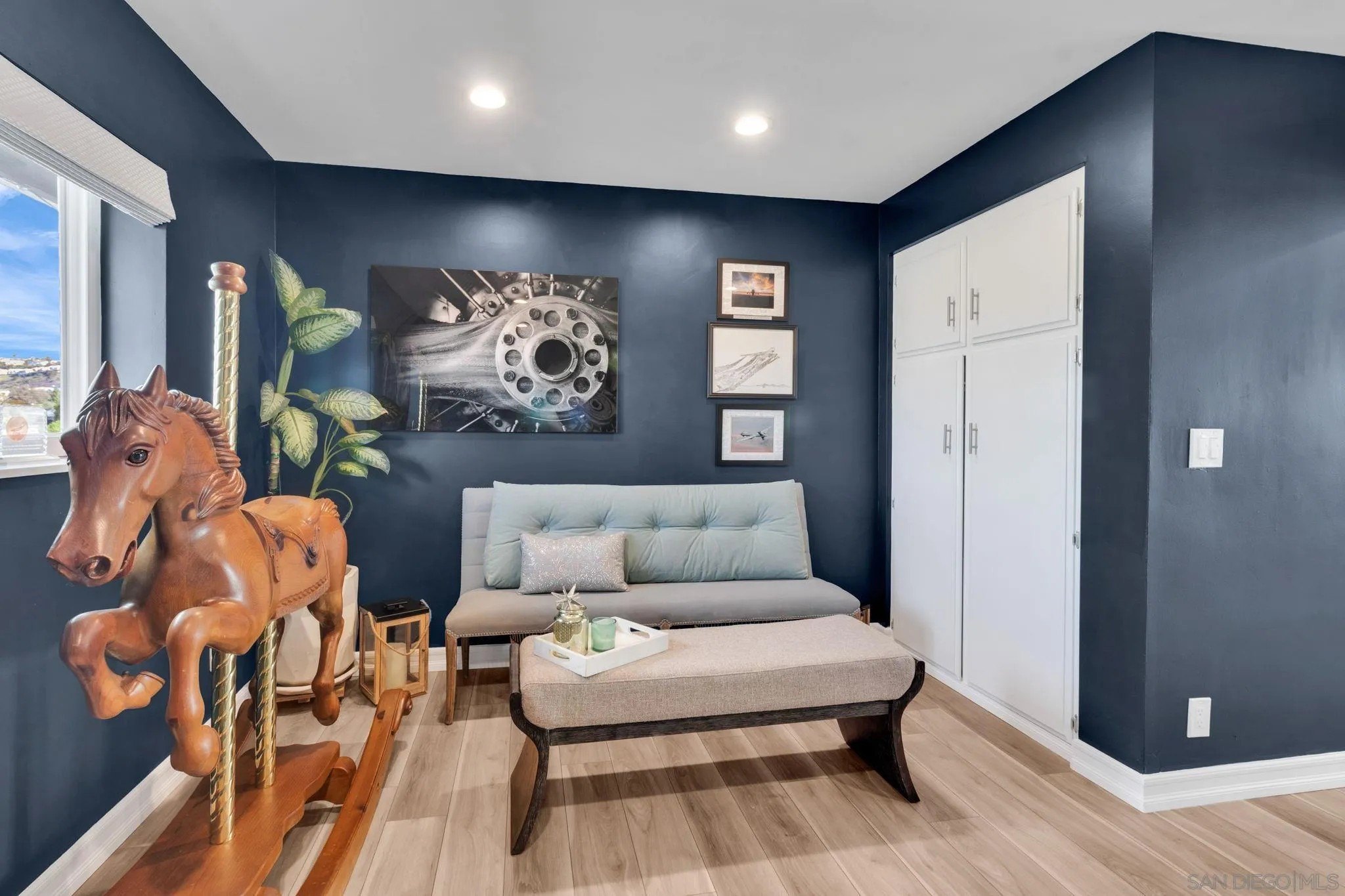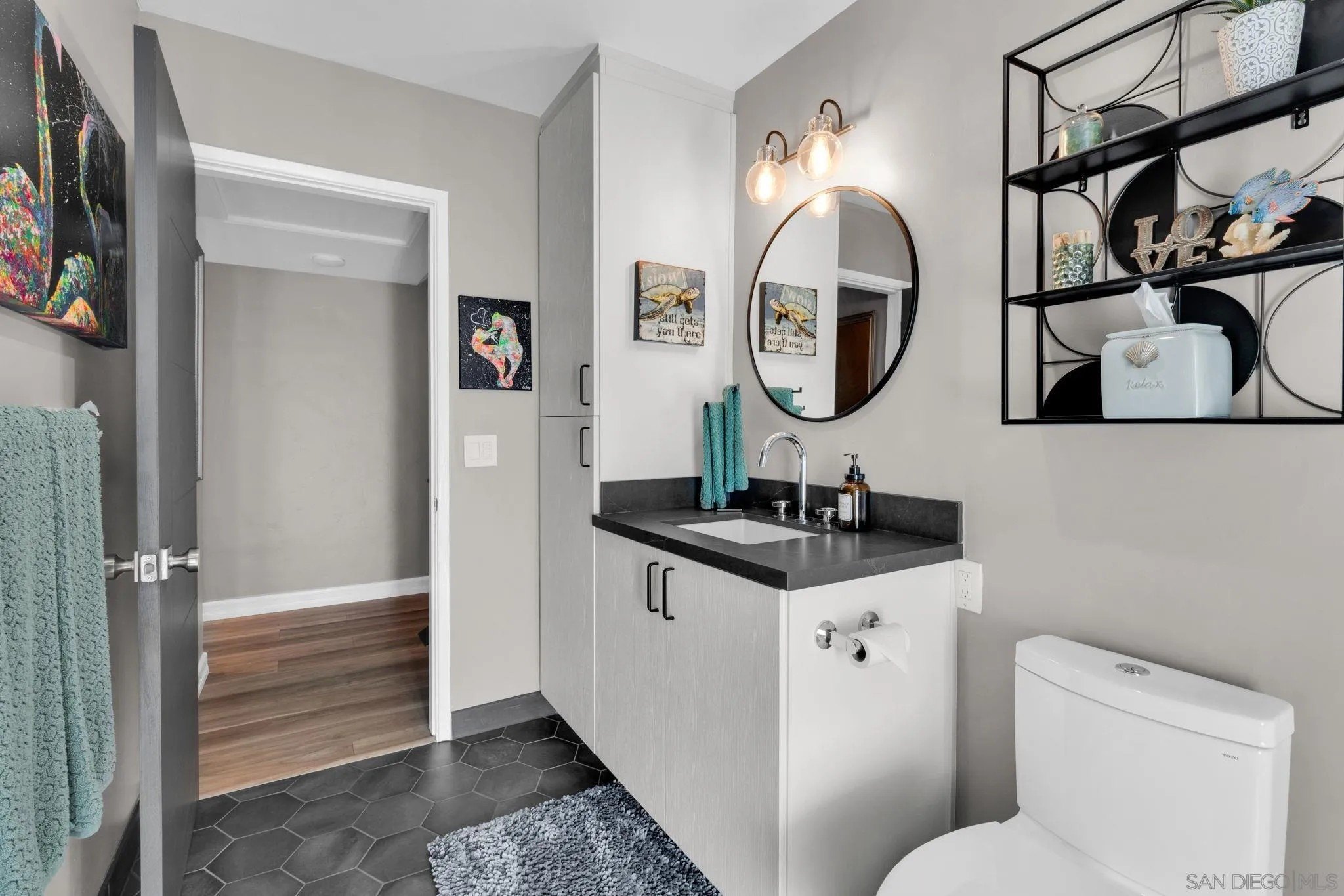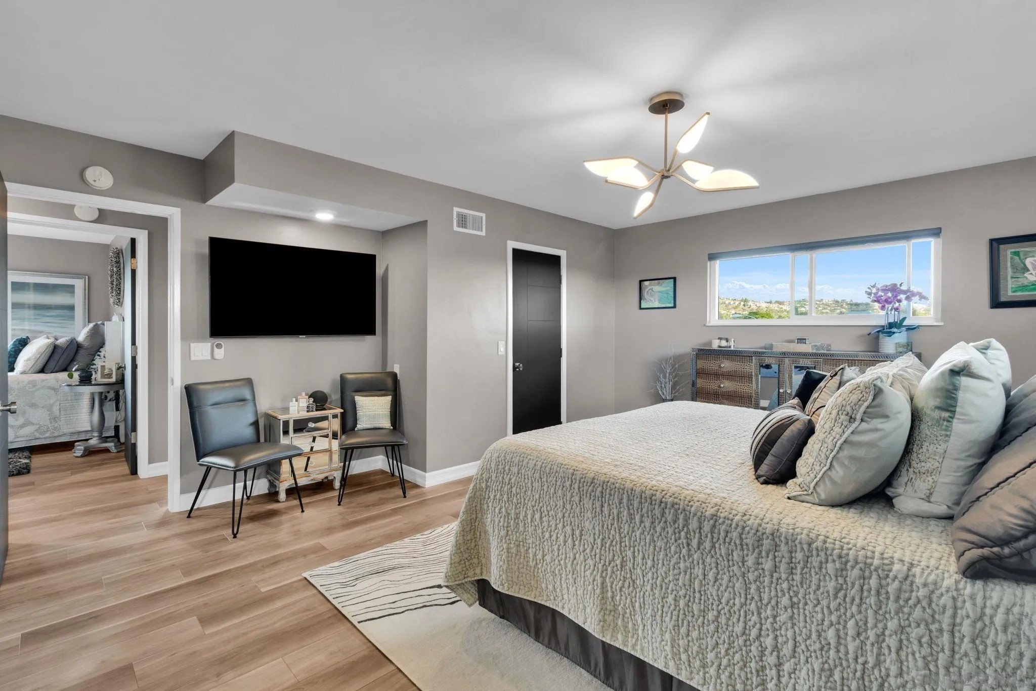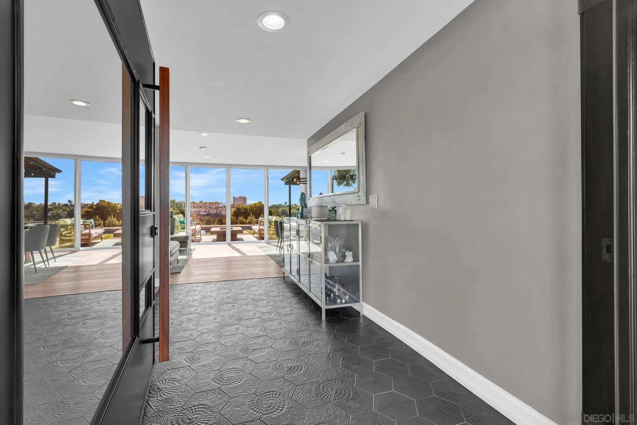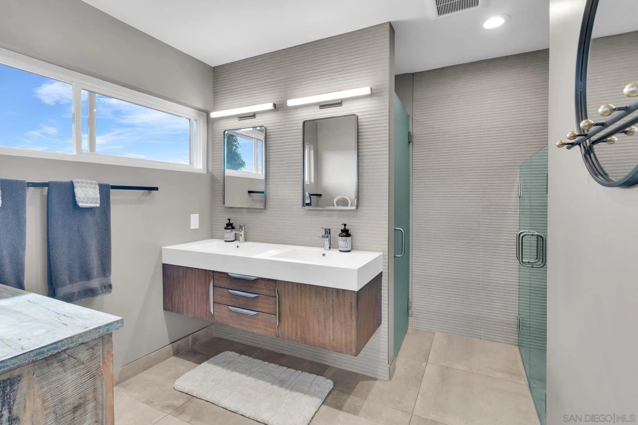 This split-level stunner is the one you've been waiting for! Located in the highly coveted Del Cerro neighborhood, this home offers everything you could possibly want and more. From the moment you arrive, the home's sleek modern design, minimalist landscaping, and tiled walkway leading to a custom pivot entry door set the tone for what's inside. Step through the front door and you're immediately welcomed by sweeping views and a beautifully tiled foyer. The open-concept main level features a spacious living room with a modern fireplace, a renovated chef's kitchen with an island, and an expansive 4-panel sliding door that seamlessly blends indoor and outdoor living. A custom pop-out kitchen window opens to an outdoor bar, perfect for year-round entertaining. The primary suite includes a remodeled en-suite bathroom and a generous walk-in closet. Additional bedrooms feature LVP flooring, custom closet doors, and upgraded light fixtures. All bathrooms have been tastefully remodeled. The newly renovated lower-level addition, currently used as an exercise room, offers a versatile flex space for a home office, studio, or secondary living area. The backyard is an entertainer's dream, with a sparkling saltwater pool and spa, covered patio, grassy area, views, and no immediate rear neighbor. Modern concrete hardscaping with turf infill adds a clean, contemporary finish. The home also includes owned solar, and the garage features epoxy flooring and EV-charging capability. Ideally positioned near freeways, shopping, and within walking distance of highly rated Hearst Elementary.