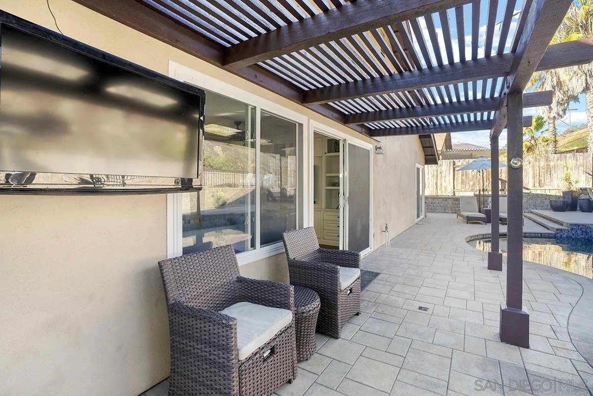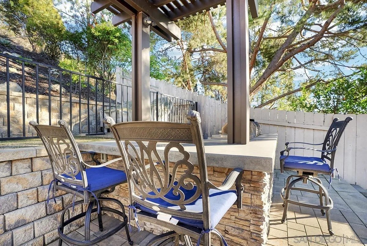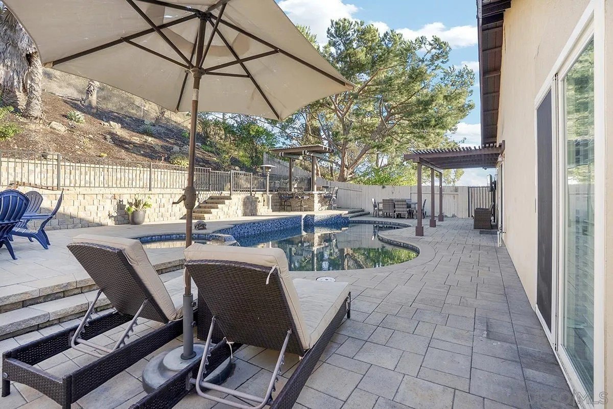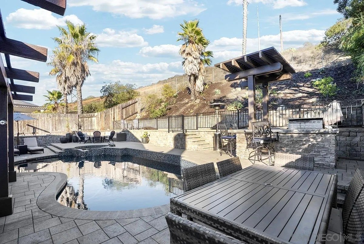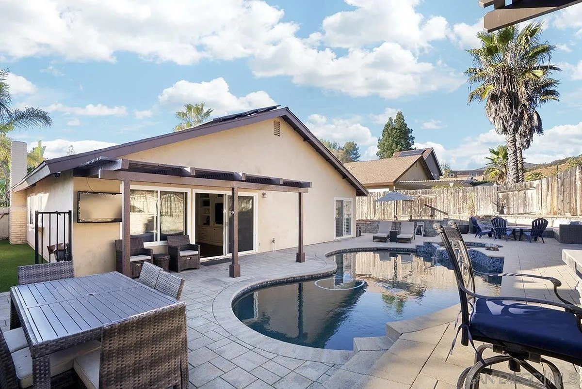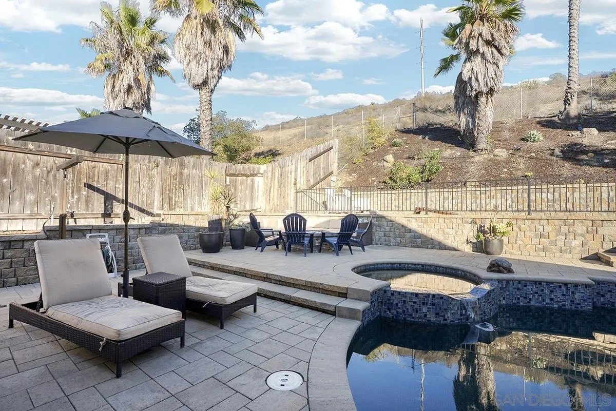Discover a rare single-story home on a half-acre lot in the heart of Rancho Penasquitos with gorgeous mountain views as a backdrop. This home welcomes you with updated curb appeal. Inside, the flexible 4-bedroom layout offers wide appeal: perfect for working from home, multi-generational living, guests, or creating dedicated spaces for hobbies and fitness. Vaulted ceilings upon entry and open concept living room/dining room with fireplace. Updated kitchen overlooks family room with sleek custom built-in for additional storage or display. 4 bedrooms, one of which currently used as office/gym. The backyard is perfect for entertaining or escaping from it all: A sparkling pool with beautiful blue tile work & updated pebbletech and spa for warm San Diego days. Expansive patio areas for dining and lounging, including elegant firepit for great conversations and covered BBQ area with seating. Terraced area provides additional fun for corn hole or bocce ball. Maintained slope provides privacy and a serene natural backdrop. Other details include: Hardwood flooring, solar panels, shiplap wall in family room, chair rail in living room. This is one of the few lots in the neighborhood that offers space, privacy, and lifestyle potential at this scale. Poway Unified School District. No HOA and no Mello-Roos. Quick access to shopping, dining, grocery stores, Pitchers, the new Better Buzz Coffee, parks, and freeways. A quiet single-level floor plan with great indoor-outdoor flow. Opportunities like this: single story, half-acre, pool, privacy, location, rarely come available.