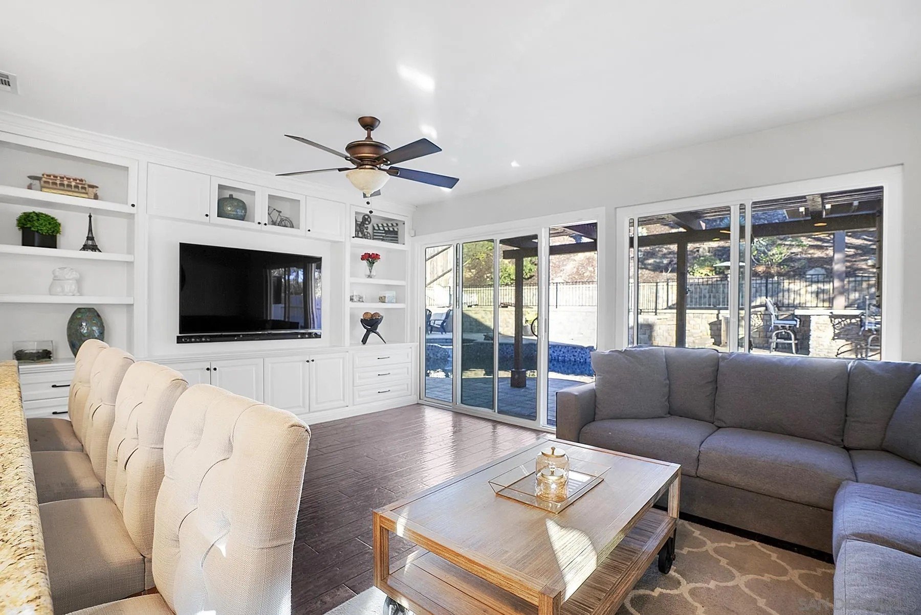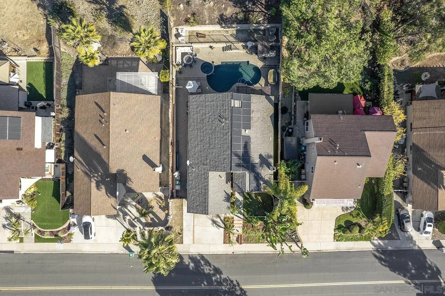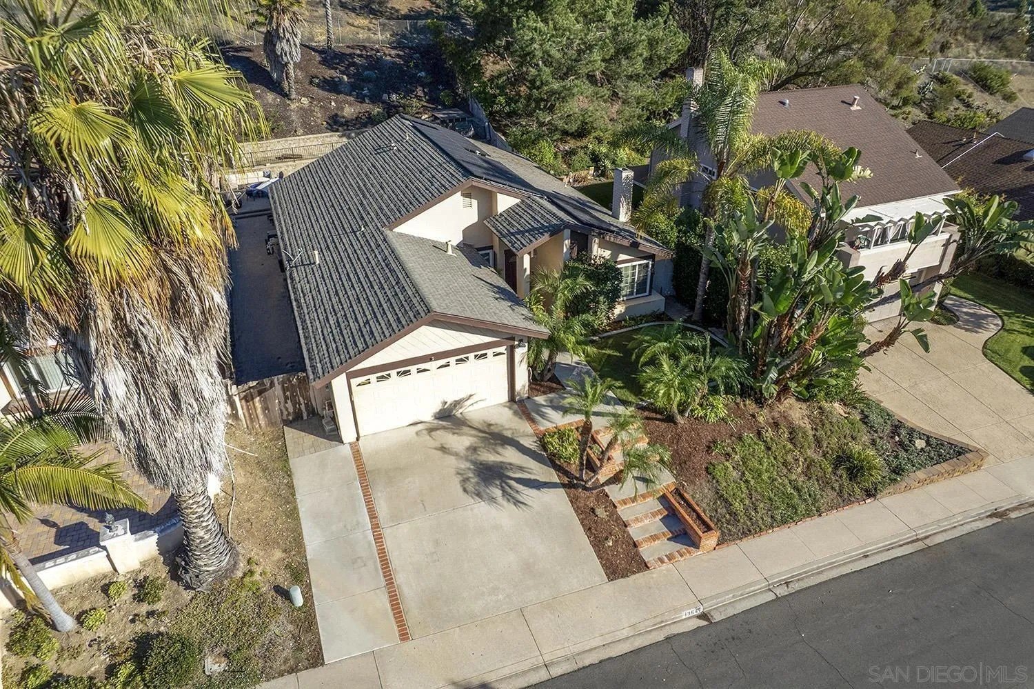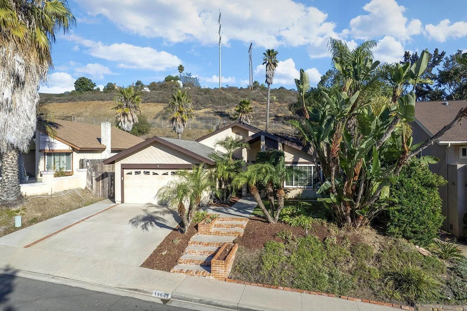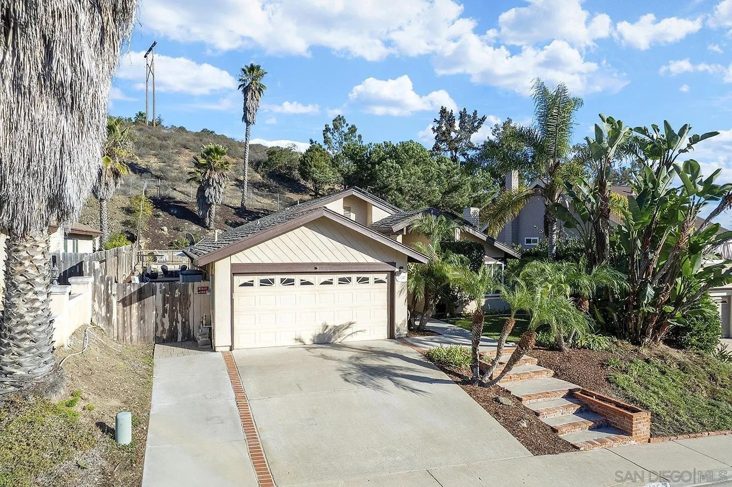 Discover a rare single-story home on a half-acre lot in the heart of Rancho Penasquitos with gorgeous mountain views as a backdrop. This home welcomes you with updated curb appeal. Inside, the flexible 4-bedroom layout offers wide appeal: perfect for working from home, multi-generational living, guests, or creating dedicated spaces for hobbies and fitness. Vaulted ceilings upon entry and open concept living room/dining room with fireplace. Updated kitchen overlooks family room with sleek custom built-in for additional storage or display. 4 bedrooms, one of which currently used as office/gym. The backyard is perfect for entertaining or escaping from it all: A sparkling pool with beautiful blue tile work & updated pebbletech and spa for warm San Diego days. Expansive patio areas for dining and lounging, including elegant firepit for great conversations and covered BBQ area with seating. Terraced area provides additional fun for corn hole or bocce ball. Maintained slope provides privacy and a serene natural backdrop. Other details include: Hardwood flooring, solar panels, shiplap wall in family room, chair rail in living room. This is one of the few lots in the neighborhood that offers space, privacy, and lifestyle potential at this scale. Poway Unified School District. No HOA and no Mello-Roos. Quick access to shopping, dining, grocery stores, Pitchers, the new Better Buzz Coffee, parks, and freeways. A quiet single-level floor plan with great indoor-outdoor flow. Opportunities like this: single story, half-acre, pool, privacy, location, rarely come available.