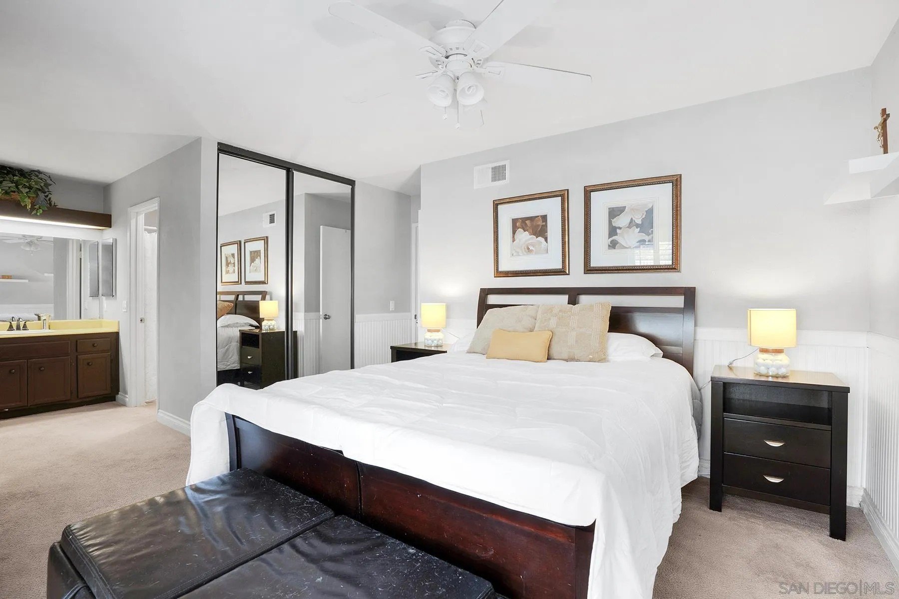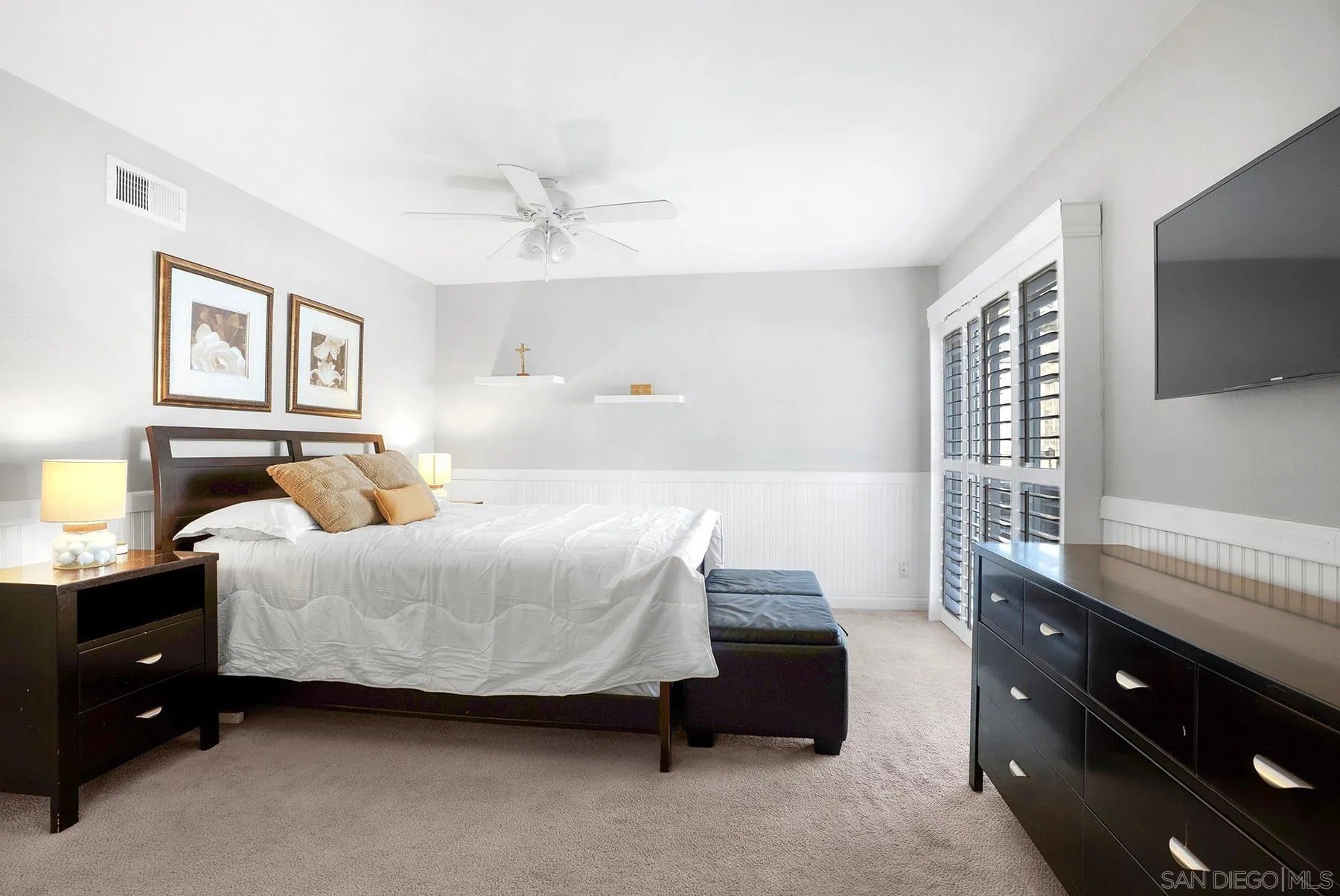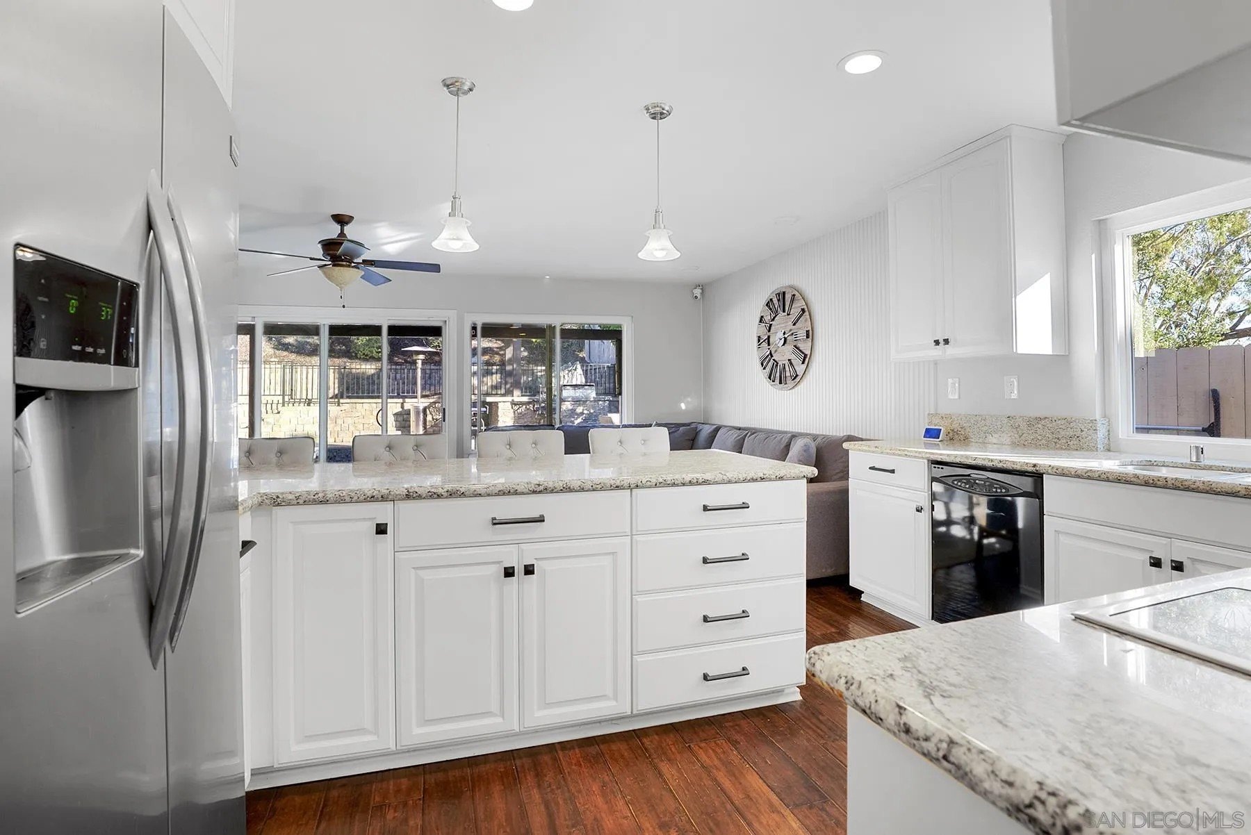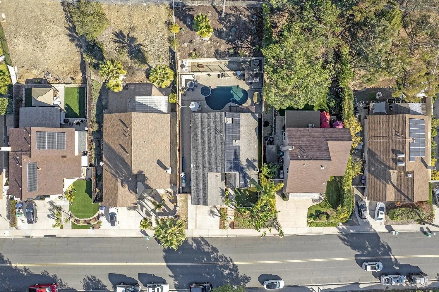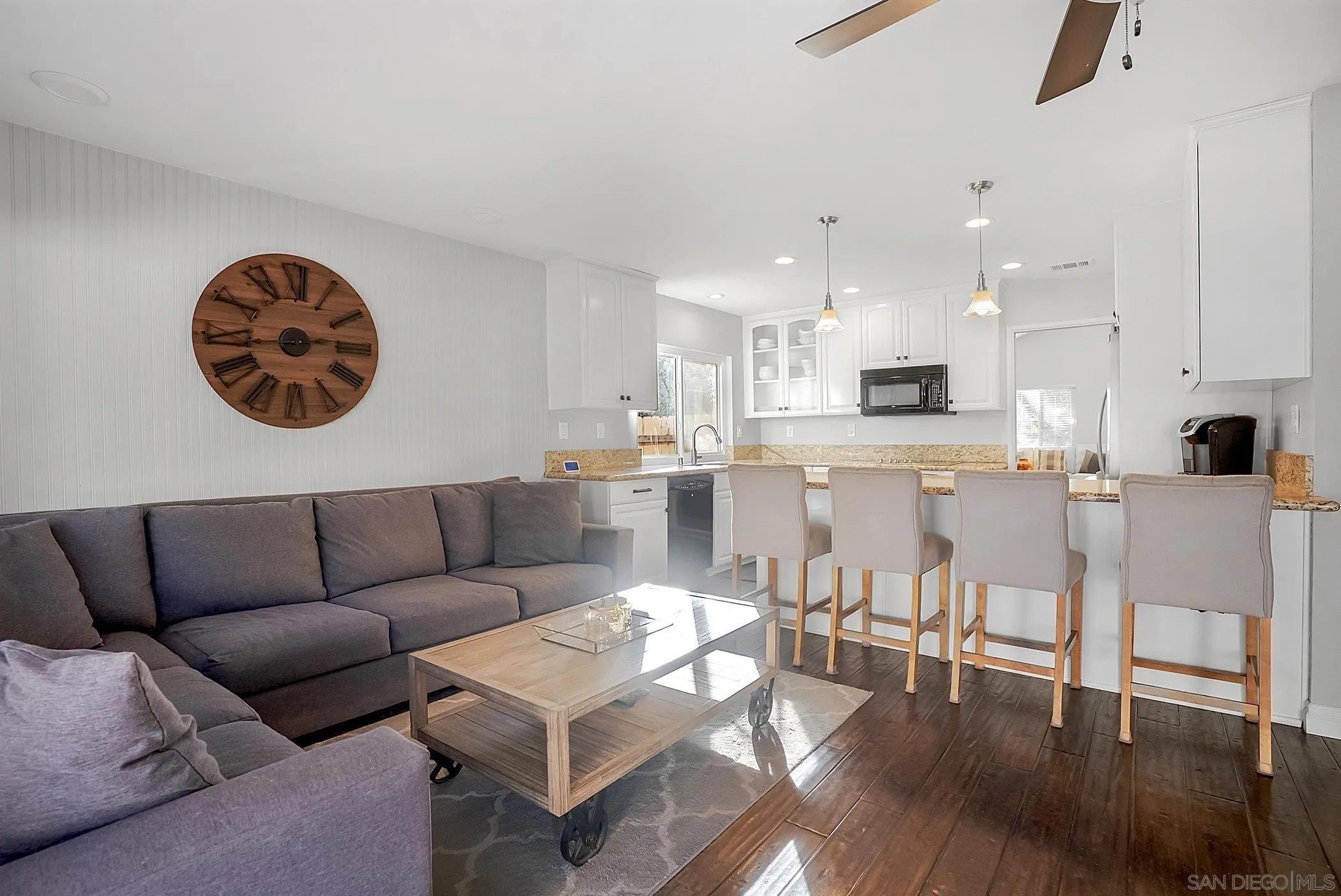 Discover a rare single-story home on a half-acre lot in the heart of Rancho Penasquitos with gorgeous mountain views as a backdrop. This home welcomes you with updated curb appeal. Inside, the flexible 4-bedroom layout offers wide appeal: perfect for working from home, multi-generational living, guests, or creating dedicated spaces for hobbies and fitness. Vaulted ceilings upon entry and open concept living room/dining room with fireplace. Updated kitchen overlooks family room with sleek custom built-in for additional storage or display. 4 bedrooms, one of which currently used as office/gym. The backyard is perfect for entertaining or escaping from it all: A sparkling pool with beautiful blue tile work & updated pebbletech and spa for warm San Diego days. Expansive patio areas for dining and lounging, including elegant firepit for great conversations and covered BBQ area with seating. Terraced area provides additional fun for corn hole or bocce ball. Maintained slope provides privacy and a serene natural backdrop. Other details include: Hardwood flooring, solar panels, shiplap wall in family room, chair rail in living room. This is one of the few lots in the neighborhood that offers space, privacy, and lifestyle potential at this scale. Poway Unified School District. No HOA and no Mello-Roos. Quick access to shopping, dining, grocery stores, Pitchers, the new Better Buzz Coffee, parks, and freeways. A quiet single-level floor plan with great indoor-outdoor flow. Opportunities like this: single story, half-acre, pool, privacy, location, rarely come available.