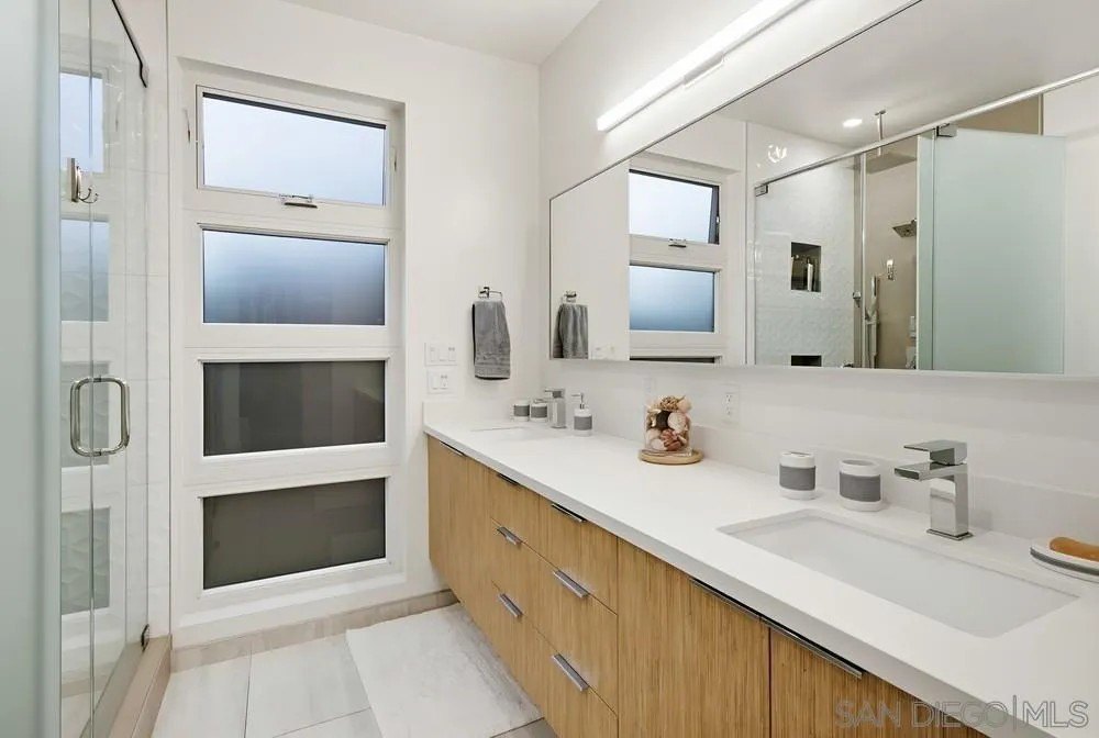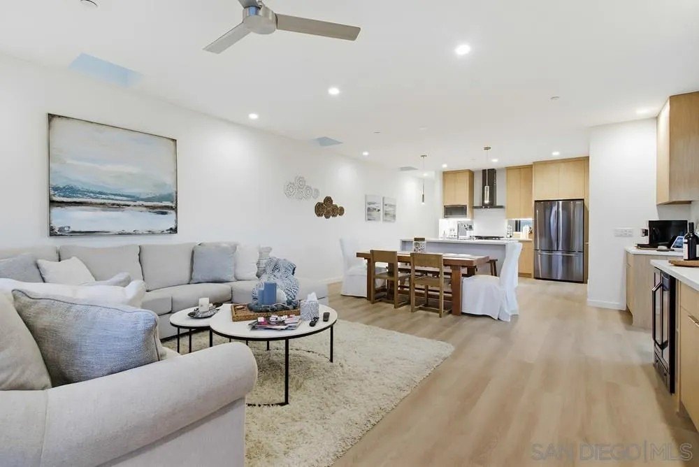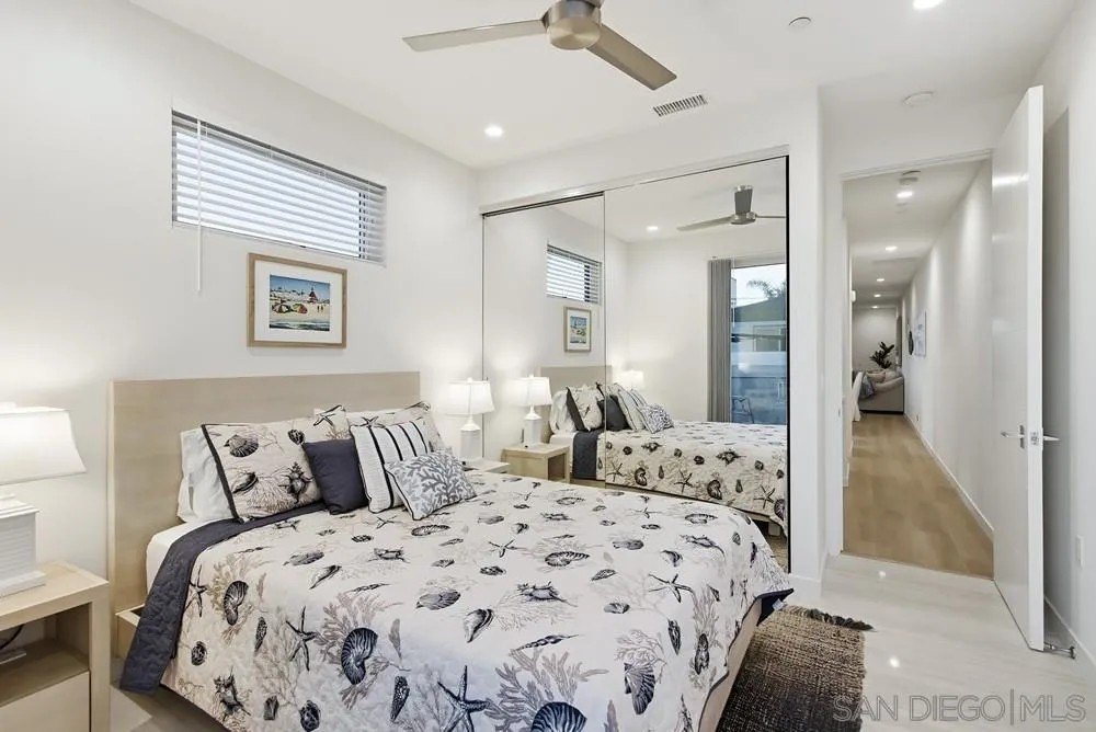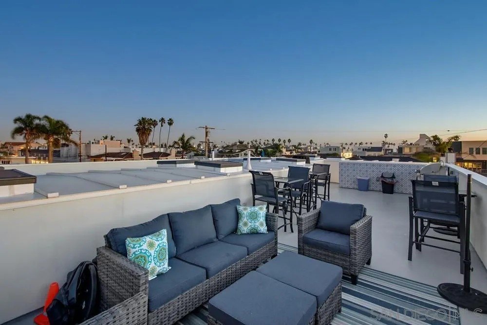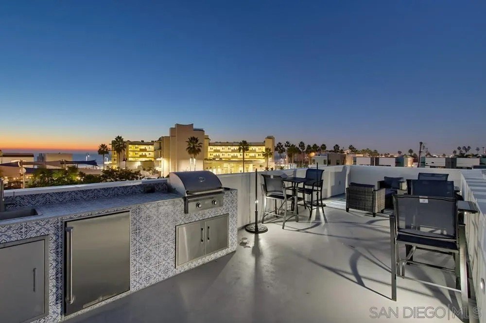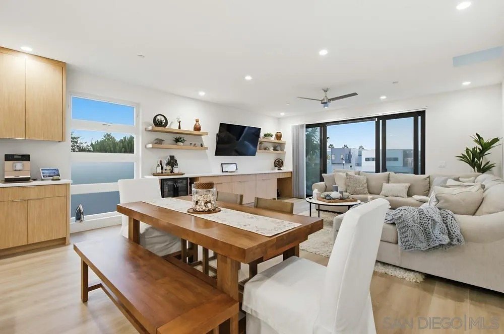 Discover the epitome of modern coastal living with this stunning 3-bedroom, 3-bathroom home, offering 1,789 square feet of finely crafted space near the Sunny Shores of Imperial Beach. This property ensures privacy with a unique 3-foot airspace separation from the neighboring unit, each resting on its own foundation. Step inside to find a contemporary interior adorned with expansive porcelain tile flooring on the ground level and elegant Mohawk flooring upstairs. The home is wired for the future with CAT-6 cables in every room, conveniently connected to a media closet. Culinary enthusiasts will appreciate the custom bamboo cabinetry and Corian countertops in the efficiently organized kitchen, while Delta shower fixtures and custom glass enclosures add a touch of luxury to the bathrooms. Current owners added a wine/beverage fridge and custom cabinetry to the living room, creating ample storage space. Natural light floods the living space through skylights, while the sleek frameless glass railings enhance the home's modern aesthetic. Outdoors, the oversized parking area accommodates large vehicles, and the exterior landscape lighting with an automatic drip system elevates the ambiance. The crowning jewel is the large rooftop deck, perfect for entertaining with a built-in BBQ area and breathtaking ocean views, promising unforgettable moments under the stars. This property blends convenience with sophistication, making it an ideal retreat for those seeking a luxurious beachside lifestyle. Offered mostly furnished.