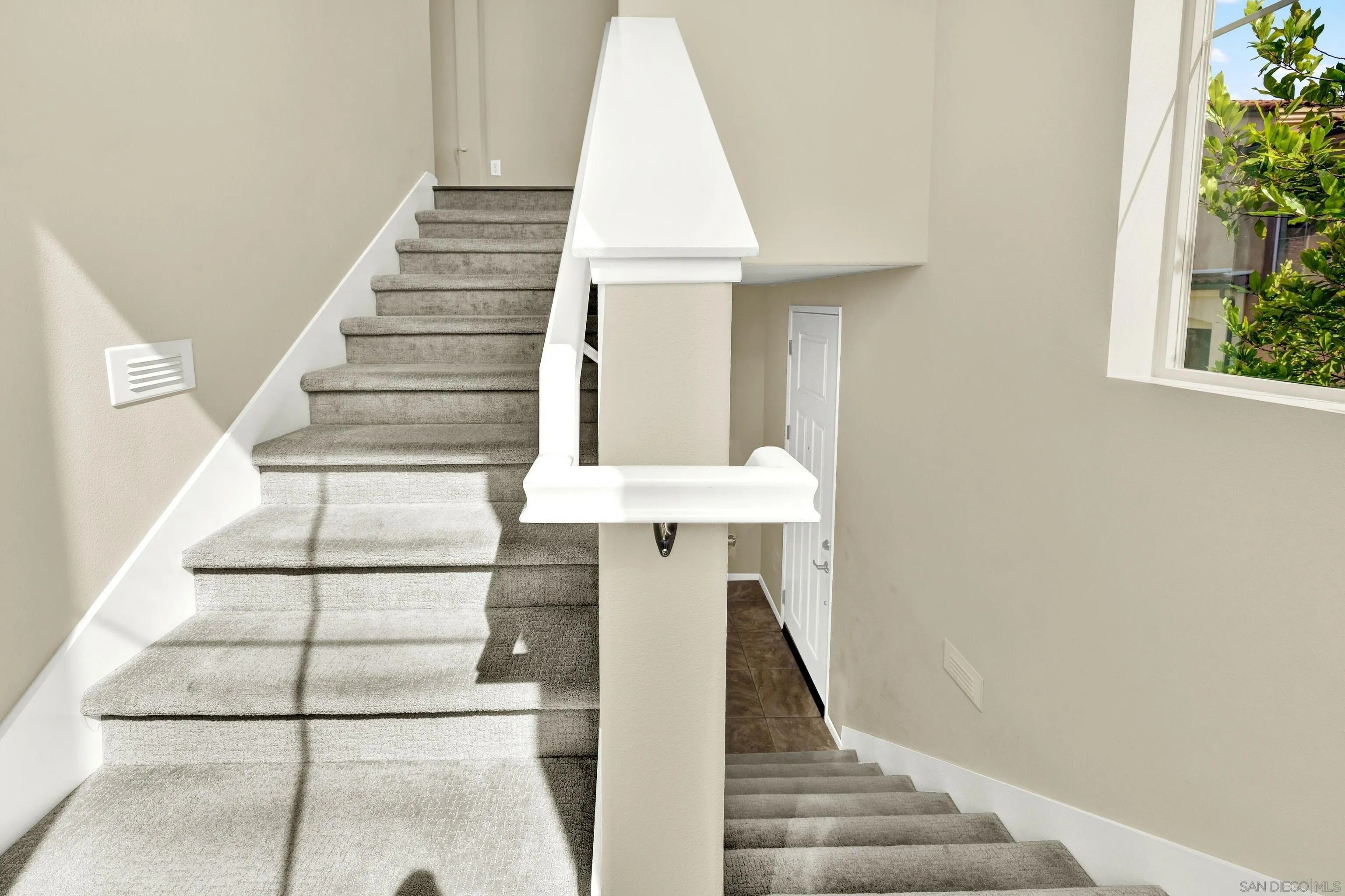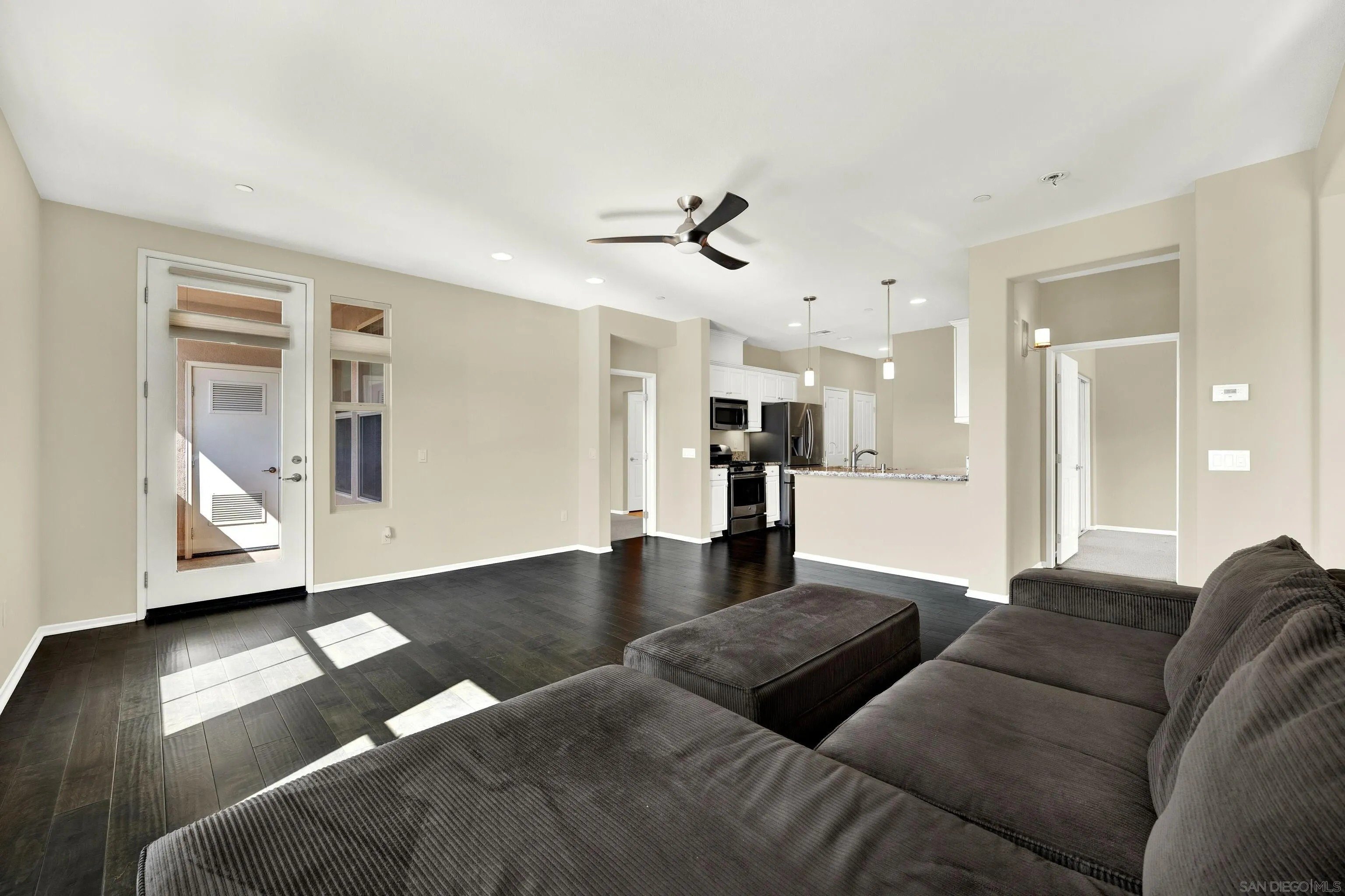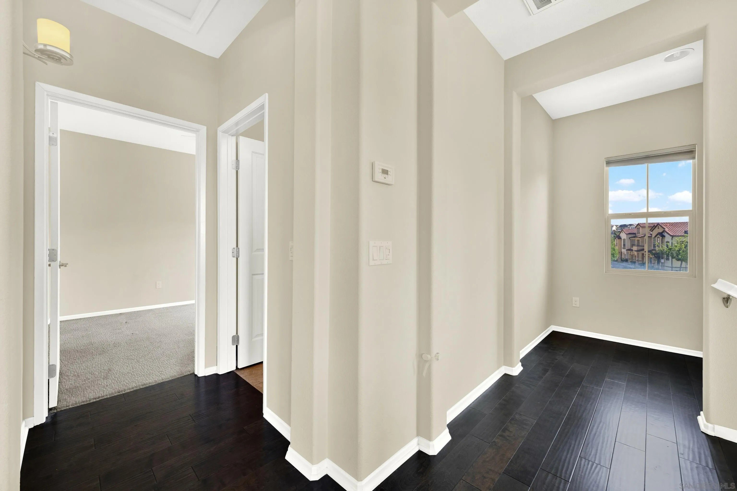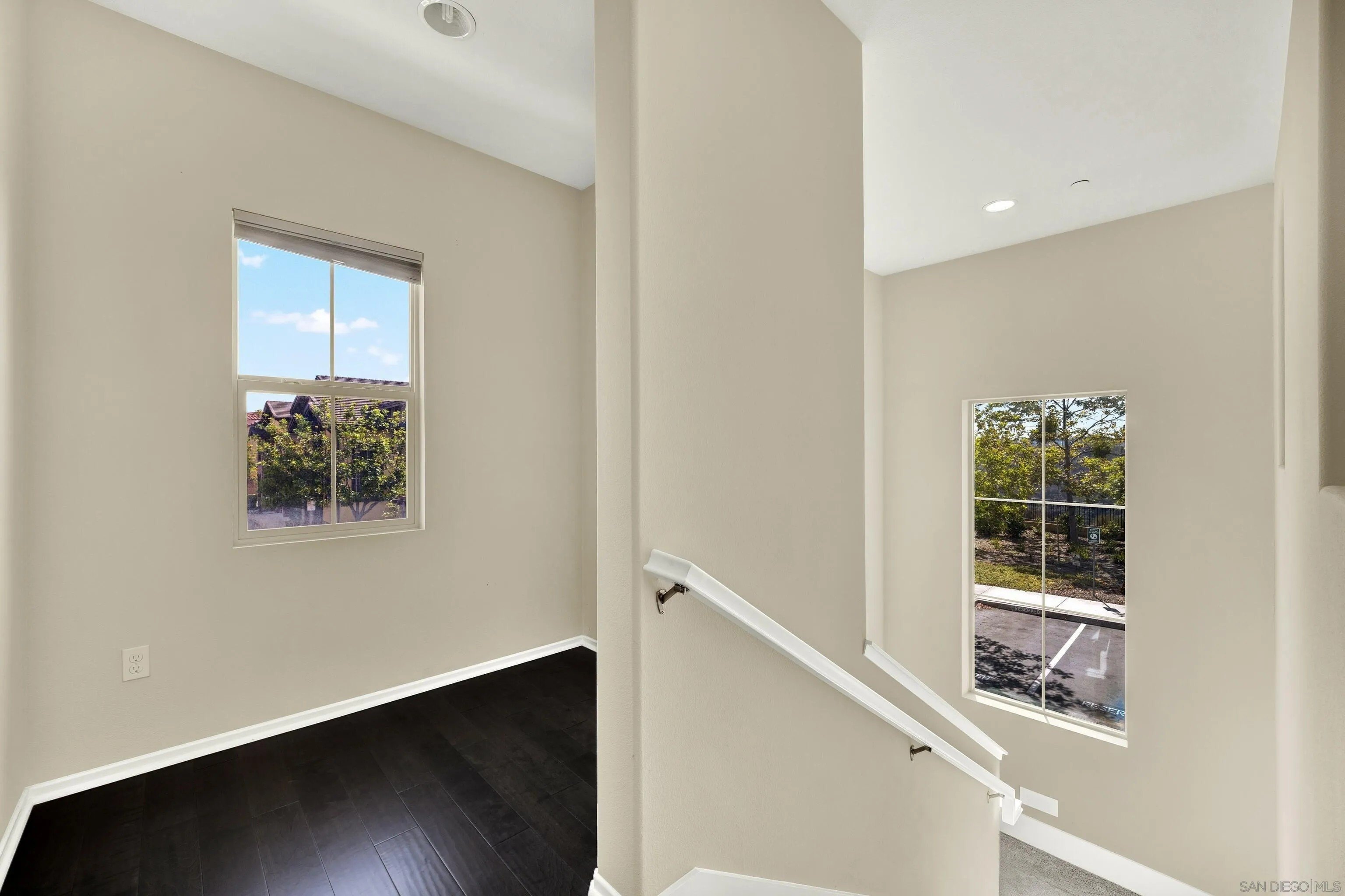 Nestled in the desirable Sorrento Ridge community, this corner lot, light-filled 2-bedroom, 2-bath condo offers an ideal blend of comfort, privacy, and convenience. The upper-level layout welcomes you into an inviting living space featuring vaulted ceilings, abundant natural light, and beautifully maintained hardwood floors throughout the kitchen, dining, and living area, offering a seamless flow and warmth through the property. A southwest-facing balcony, with panoramic views is the perfect spot to unwind while taking in serene canyon and greenbelt views. The primary suite enjoys complete privacy with its own attached full bath, while the second bedroom and additional full bath provide flexibility for guests or family. A bonus nook offers an ideal space for a home office, reading area, or creative studio, perfectly suited to modern living needs. An attached garage provides convenience and secure parking with direct access, with an additional reserved parking spot steps away. Residents enjoy access to a range of community amenities including a pool, playground, and beautifully maintained grounds managed by the HOA. Located just minutes from Sorrento Valley's biotech and tech hubs, this home offers quick access to hiking trails, shopping, dining, major transit routes, and the coast-making it a peaceful retreat that remains close to everything. This is your opportunity to own a low-maintenance, contemporary sanctuary in a prime San Diego setting.