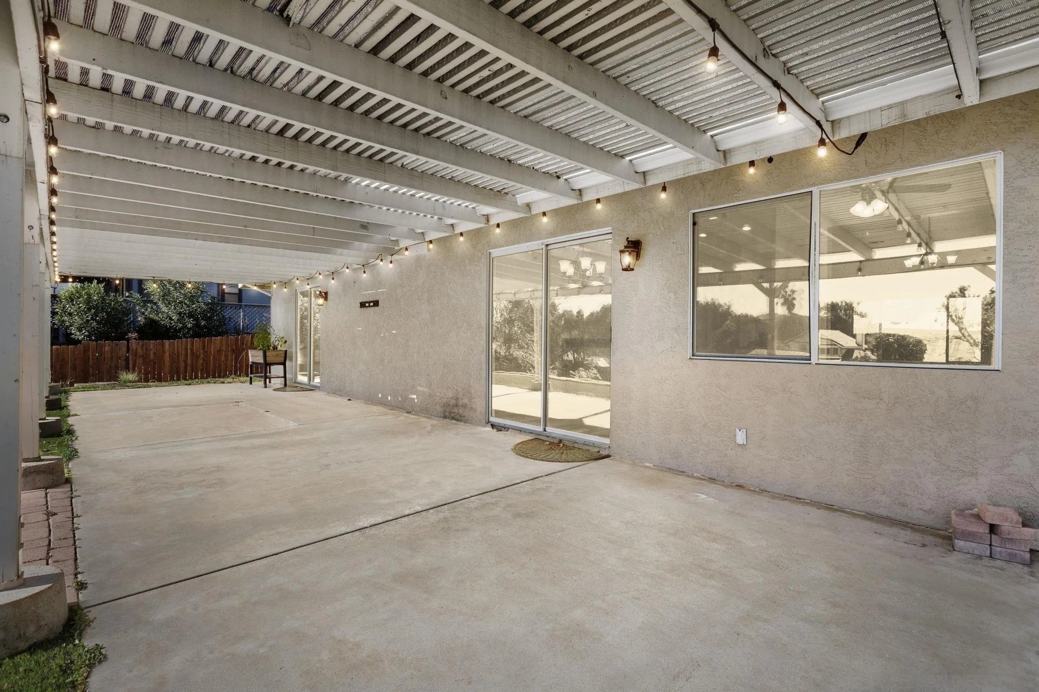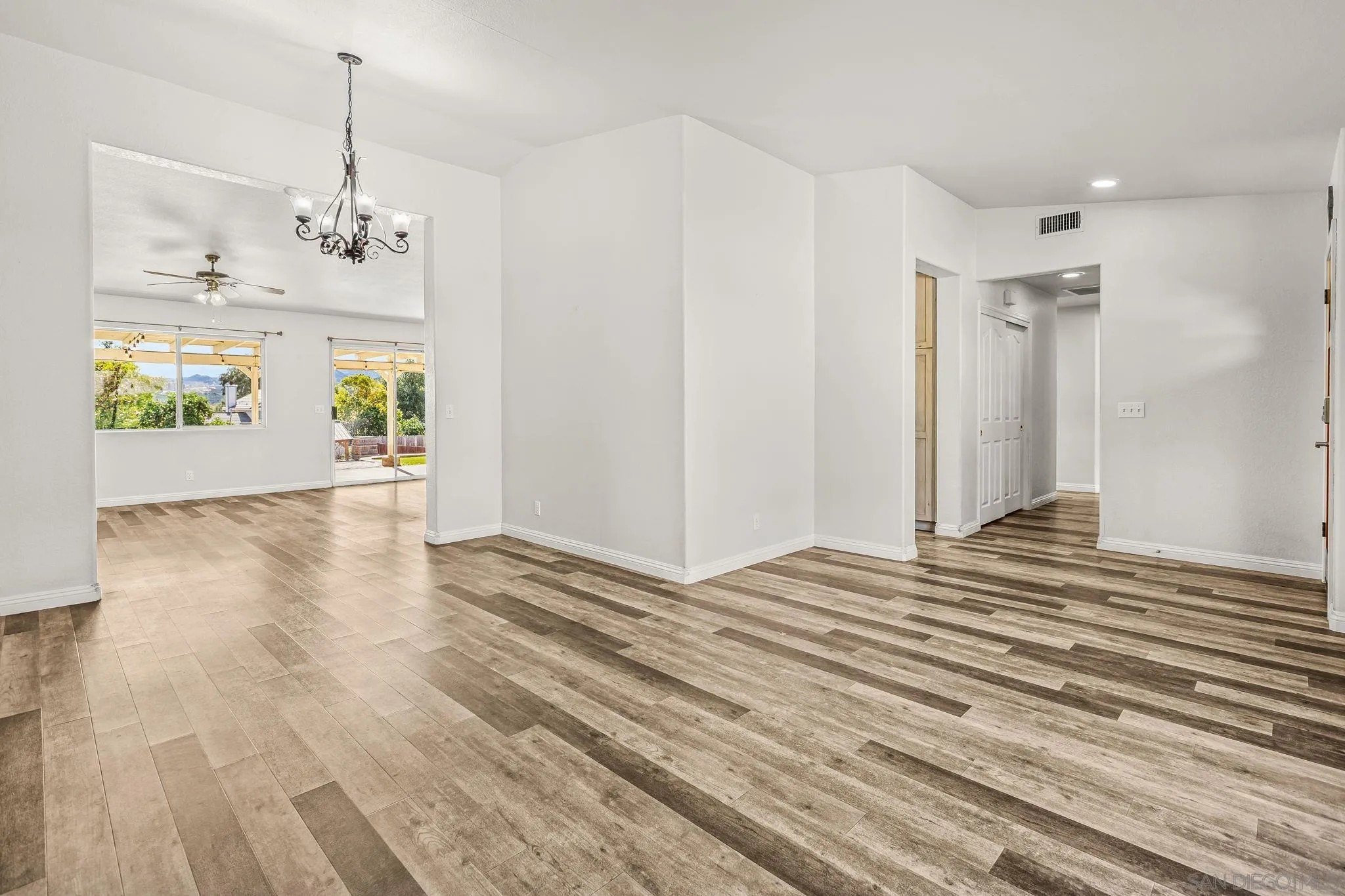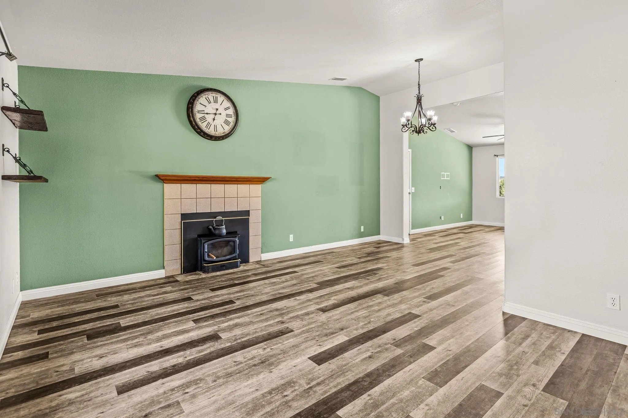 Welcome home! Appealing 4 bedroom /2 bath ranch home in Ramona's San Diego Country Estates! High ceilings & open floorplan greet you in this single level home. Vinyl plank flooring throughout the entire common areas & primary bedroom. Off the entry the living room features a large picture window and wood burning stove. Remodeled kitchen includes stainless steel appliances/solid surface counters which open to the family room and breakfast area and backyard. Hallway leads back to the primary bedroom and bathroom with a walk in closet. The three additional bedrooms share the hall bathroom. Laundry is located conveniently in a hallway closet. Extra deep 2 car garage has plenty of room for storage in addition to a pull down ladder for more attic storage. Front and back yards are massive with artificial turf and mature trees and landscaping. A large covered patio off the back has great southern views is a great area for entertaining.The terraced garden beds and stairs lead down to the lower yard featuring dog run, fruit trees, tough shed for storage and a large covered patio with wood burning fireplace. Zoned for horses with easement and vehicle access through the double back gates. Walking distance to James Dukes Elementary and 13 minutes to downtown Ramona. Experience all the Country Estates has to offer including the clubhouse w/a restaurant, sports bar, event space, boutique hotel, 18 hole golf course, tennis and pickleball courts, and a community pool and spa. The community also provides a vast trail system for horse riding, biking, or hiking. Some photos virtually staged.