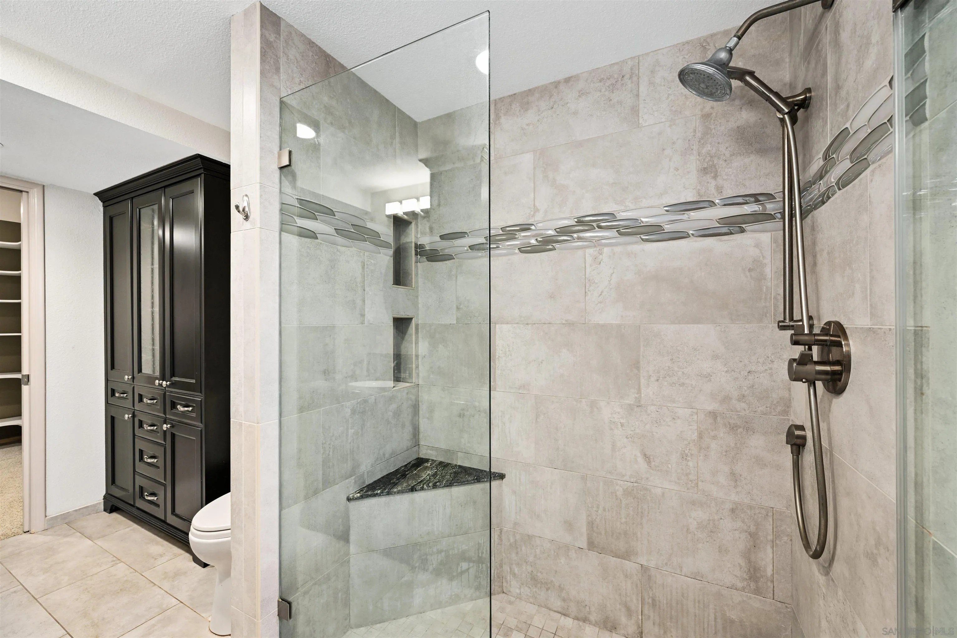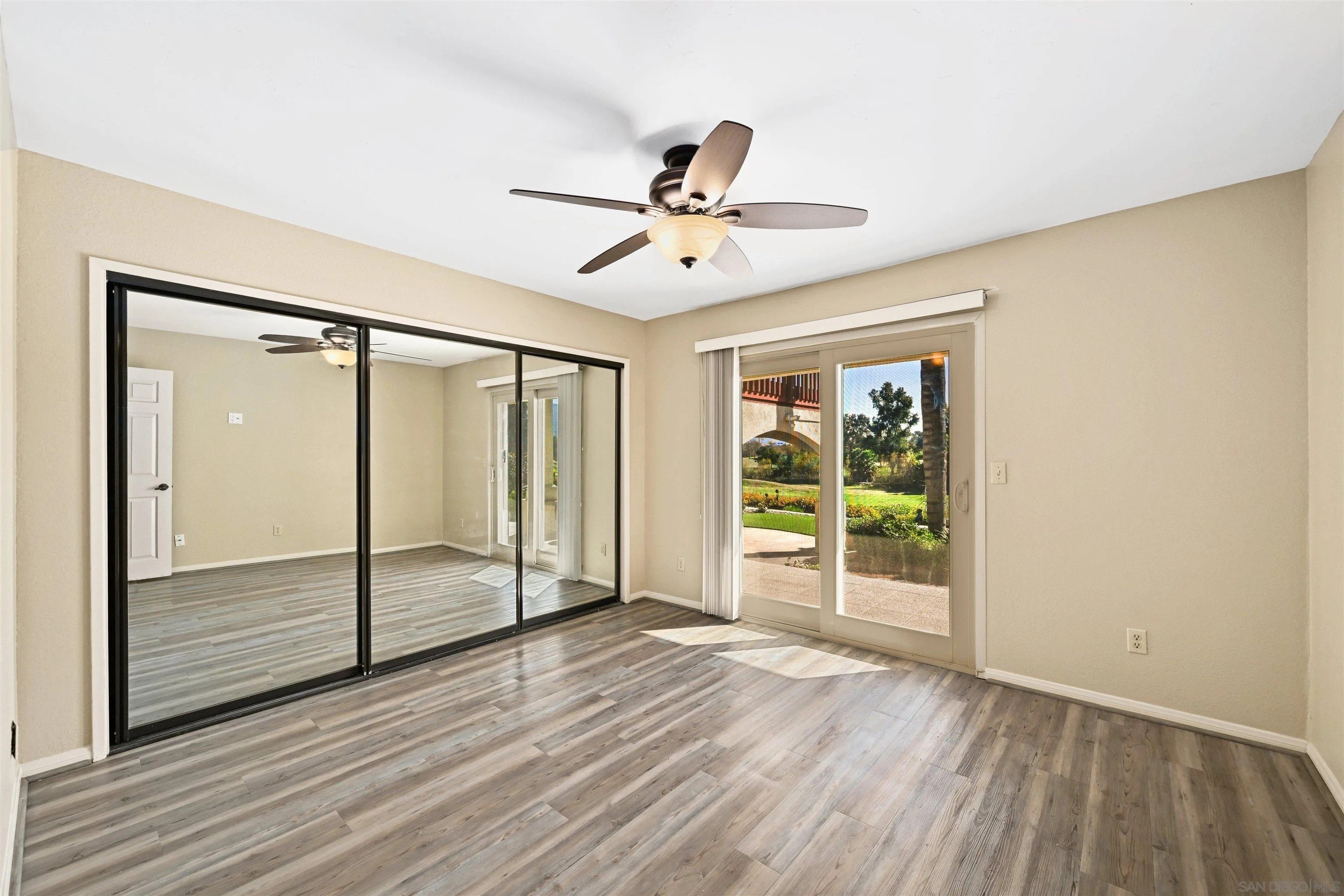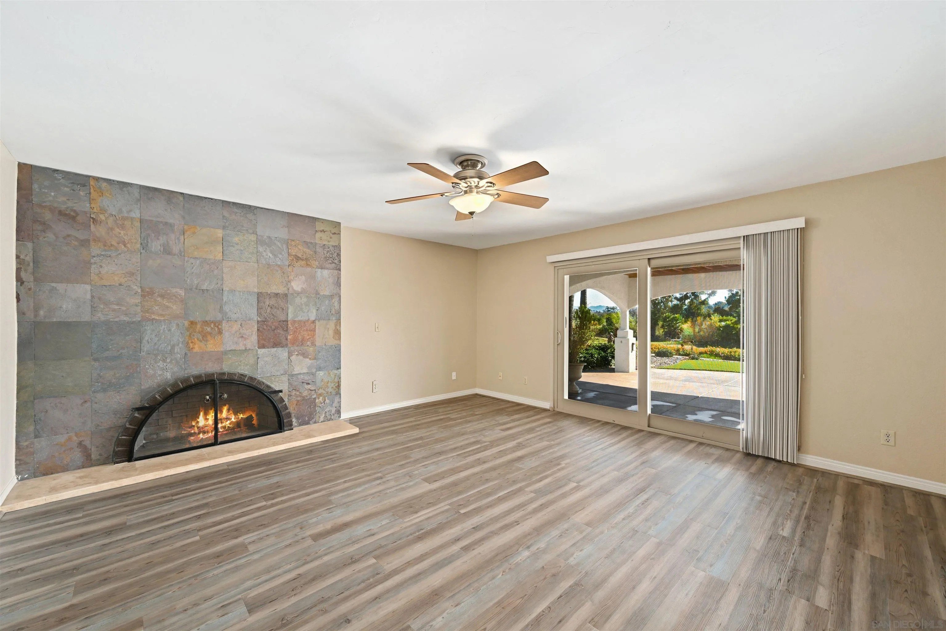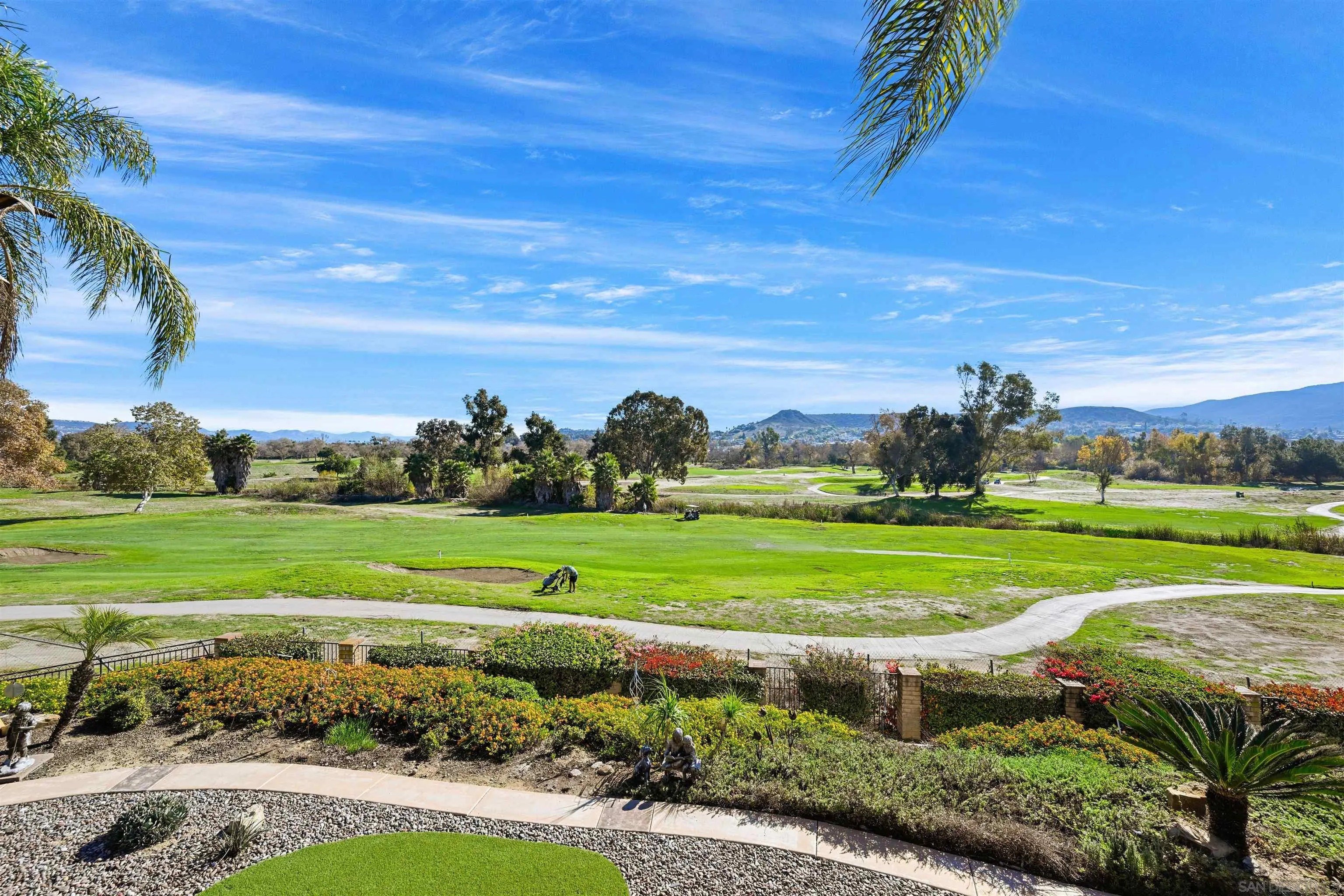 Set on a rare .39-acre lot in San Diego and perfectly positioned on the golf course, this custom-built residence captures sweeping fairway views from every room. Thoughtfully designed and meticulously upgraded, the home features sliding glass doors in every bedroom, a dramatic spiral staircase crowned by a skylight, and expansive indoor-outdoor living with a large second-story deck, veranda, and custom stone patios shaded by the deck above. The interior showcases travertine tile through the kitchen, family room, and hallways, complemented by vinyl plank flooring in the bedrooms, living, and dining areas (installed 2021). The kitchen, primary bath, and guest bath have been beautifully remodeled, blending style with modern functionality. All rooms are hard-wired for Ethernet with a dedicated access point connection on the lower level-ideal for today's connected lifestyle. Energy efficiency is exceptional with owned solar installed in 2020 (no electric bill since installation), a solar battery and inverter replaced in 2025 under warranty, and a 2023 heat pump and AC system featuring a smart thermostat and filterless ionized air cleaner. The only gas appliance is the water heater. The property includes approved, paid-for permits and engineer-approved architectural plans to convert the additional living and dining rooms into a studio ADU-already assigned its own address (9221) and ready to build. Outdoors, enjoy mature front and back gardens with fruit trees, water-efficient