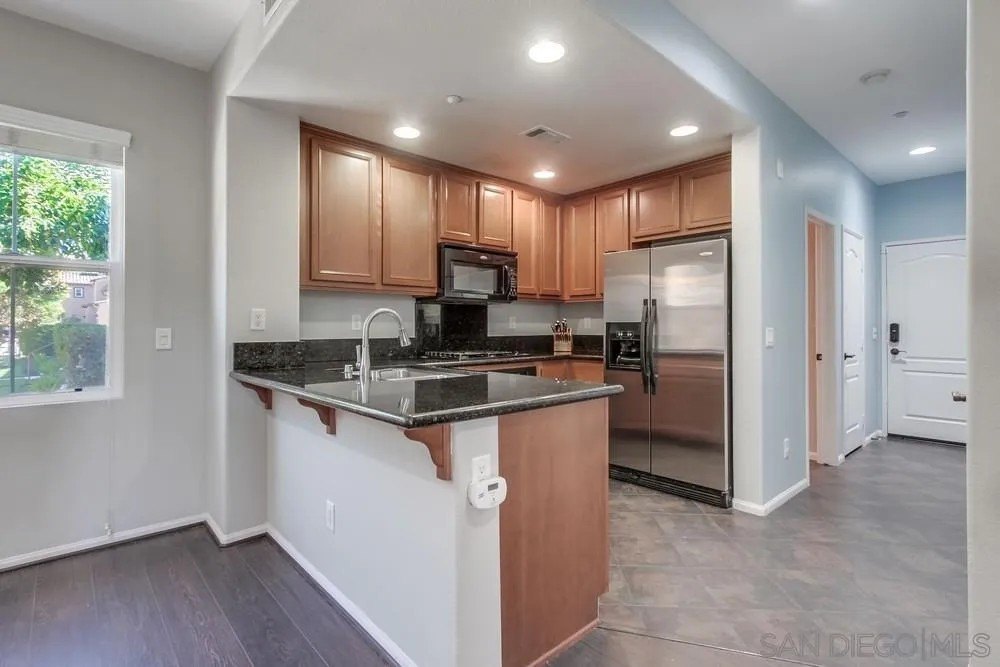 This desirable townhome in the Gianni community offers a well-designed floor plan with 2 bedrooms and 2.5 bathrooms. The main level features a spacious kitchen with sleek granite countertops and ample cabinetry, perfect for cooking and entertaining. The entry level showcases durable laminate flooring, adding a touch of elegance and easy maintenance. A custom-built media cabinet provides a stylish focal point in the living area, ideal for organizing electronics and decor. The primary bedroom includes amazing views of the mountains, recessed lighting with a remote control for added convenience and ambiance, along with a large walk-in closet offering generous storage space. The laundry room makes chores a breeze, while the attached garage features epoxy flooring for a clean, polished look and overhead storage for extra organization. Residents can enjoy the community's beautiful pool and spa, perfect for relaxation. The townhome is located within the highly regarded Poway Unified School District and is just steps away from community parks, a vibrant town center, shopping, restaurants, and numerous amenities. With scenic views of nearby parks and mountains, this home combines comfort, convenience, and a prime location, all within walking distance.