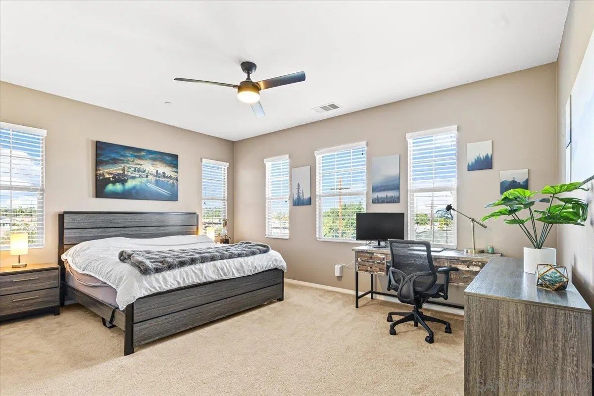 Beautiful 3BR/2.5BA home blending luxury, comfort, and views! Spacious bedrooms, rich wood floors, and a stunning kitchen with granite counters, sit-down bar seating at the center island, stainless appliances, and crisp white cabinetry. Solar, dual-pane windows, lighted fans, and neutral tones throughout. Upstairs laundry, epoxy garage floor, and low-maintenance yards. HOA maintains the front yard + offers a small park in this exclusive 23-home enclave. The rear yard offers a covered patio, artificial lawn, raised planter boxes with 5 grape vines and a plum tree too. A sophisticated lifestyle awaits, while being city close!