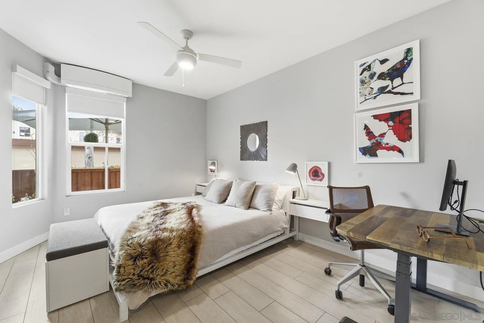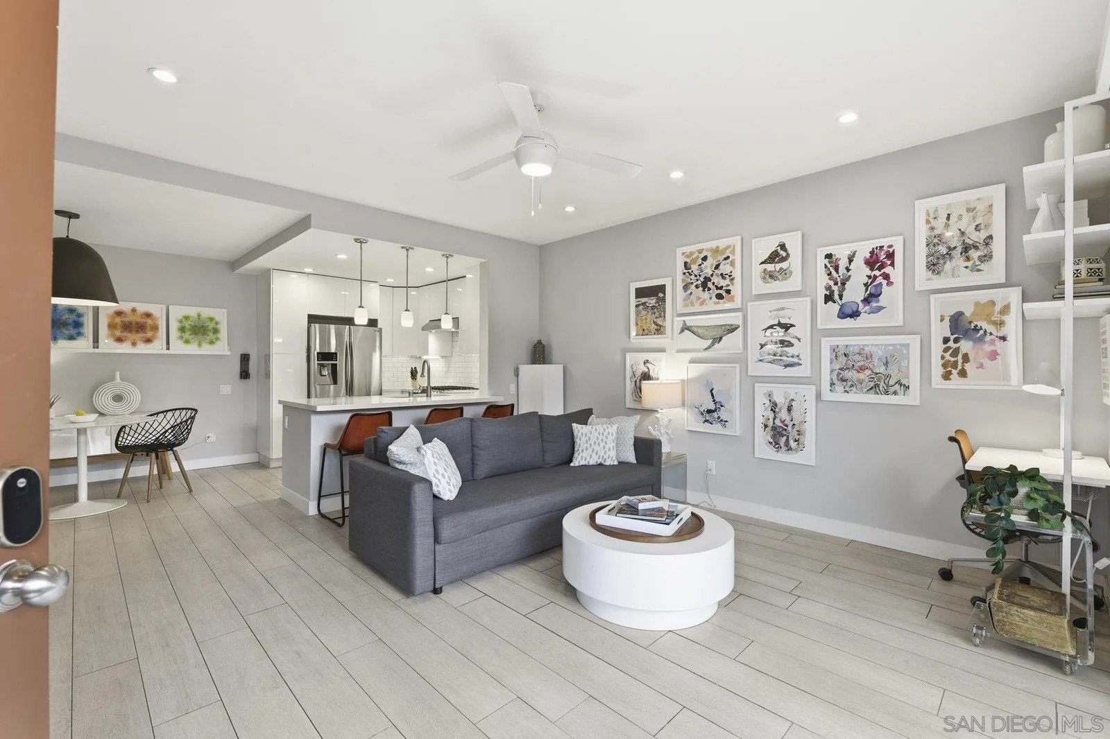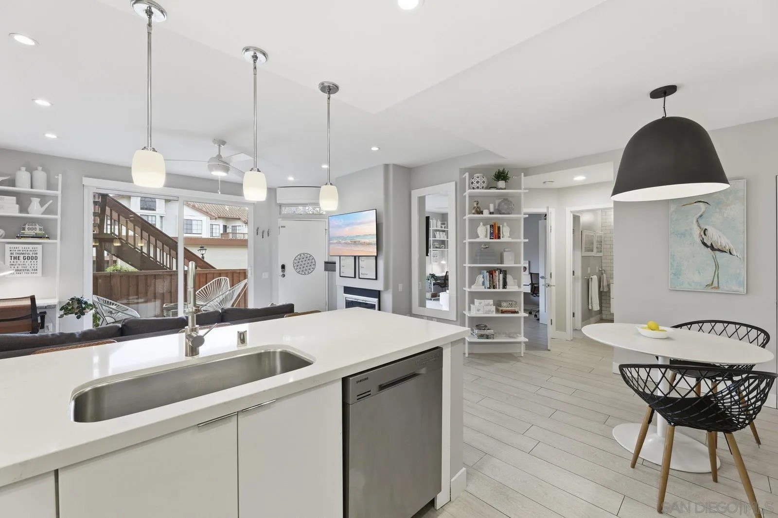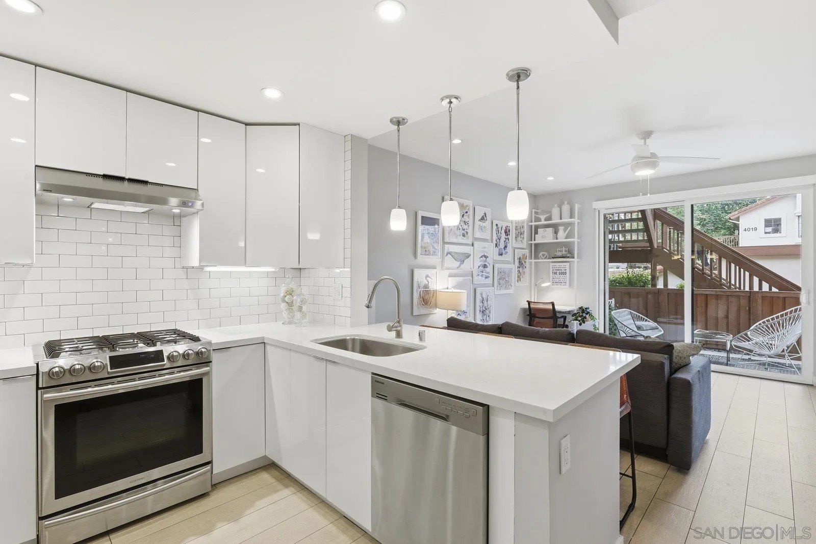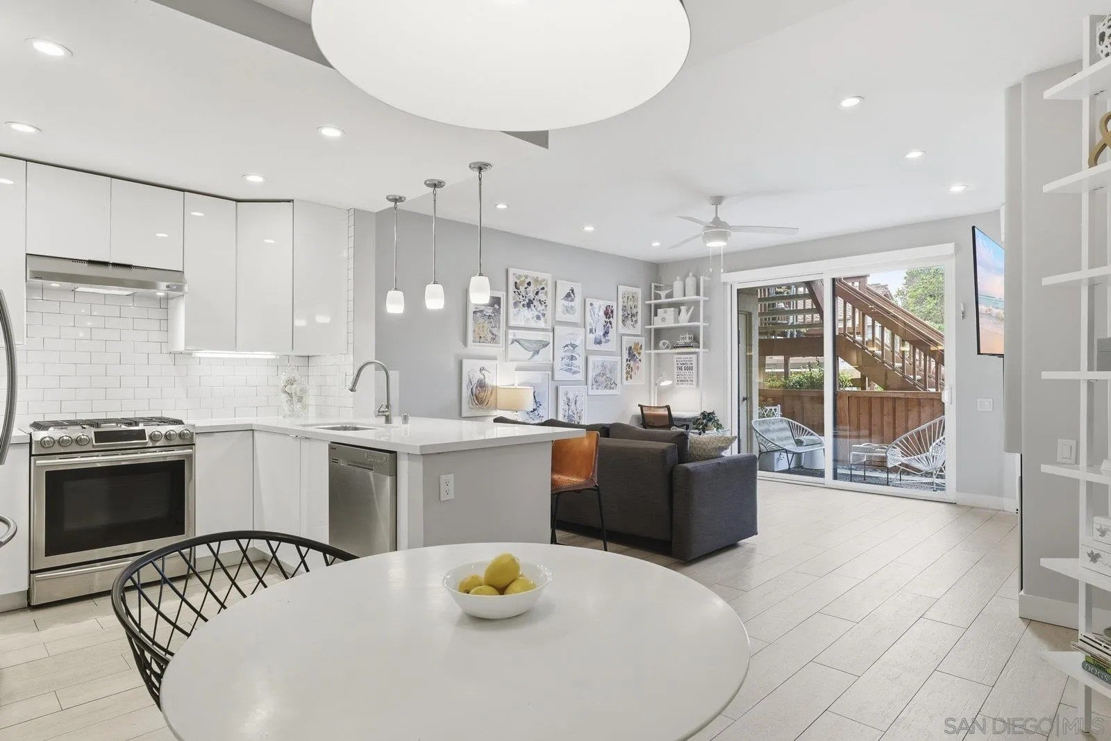 Look no further - this extensively remodeled and highly stylish 1 bedroom condo is finished to the highest standard. Thoughtfully upgraded throughout, featuring a newly installed zoned A/C system and a spacious, private fenced in patio ideal for indoor-outdoor living. Tiled flooring spans the entire residence, complemented by a cozy gas fireplace and an open concept living, dining, and kitchen layout with optional counter seating. Designer kitchen showcases stunning quartz countertops with newly designed counter-height sitting area and added counter space, modern pendant lighting, classic subway tile backsplash, stainless steel appliances, and sleek contemporary cabinetry.