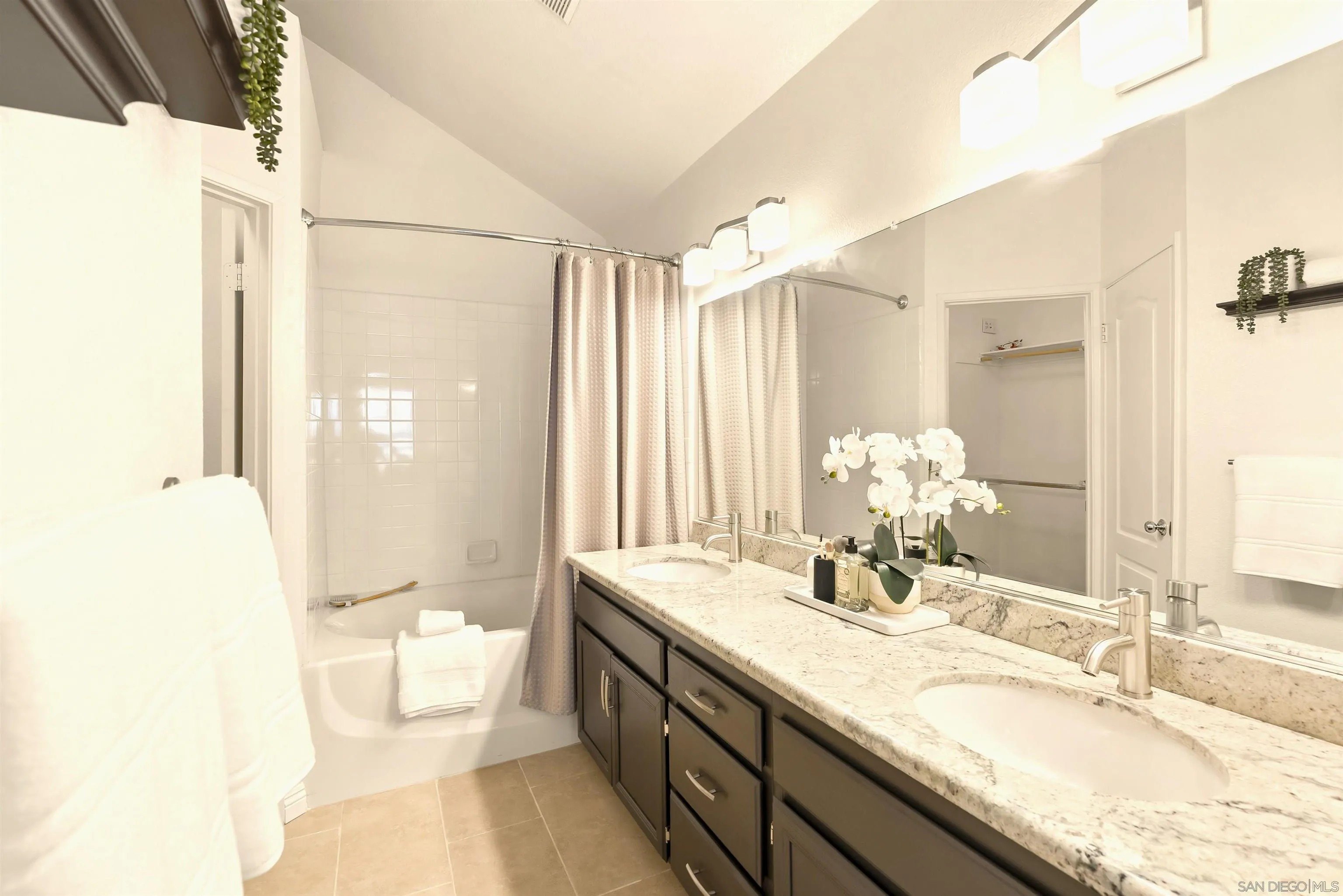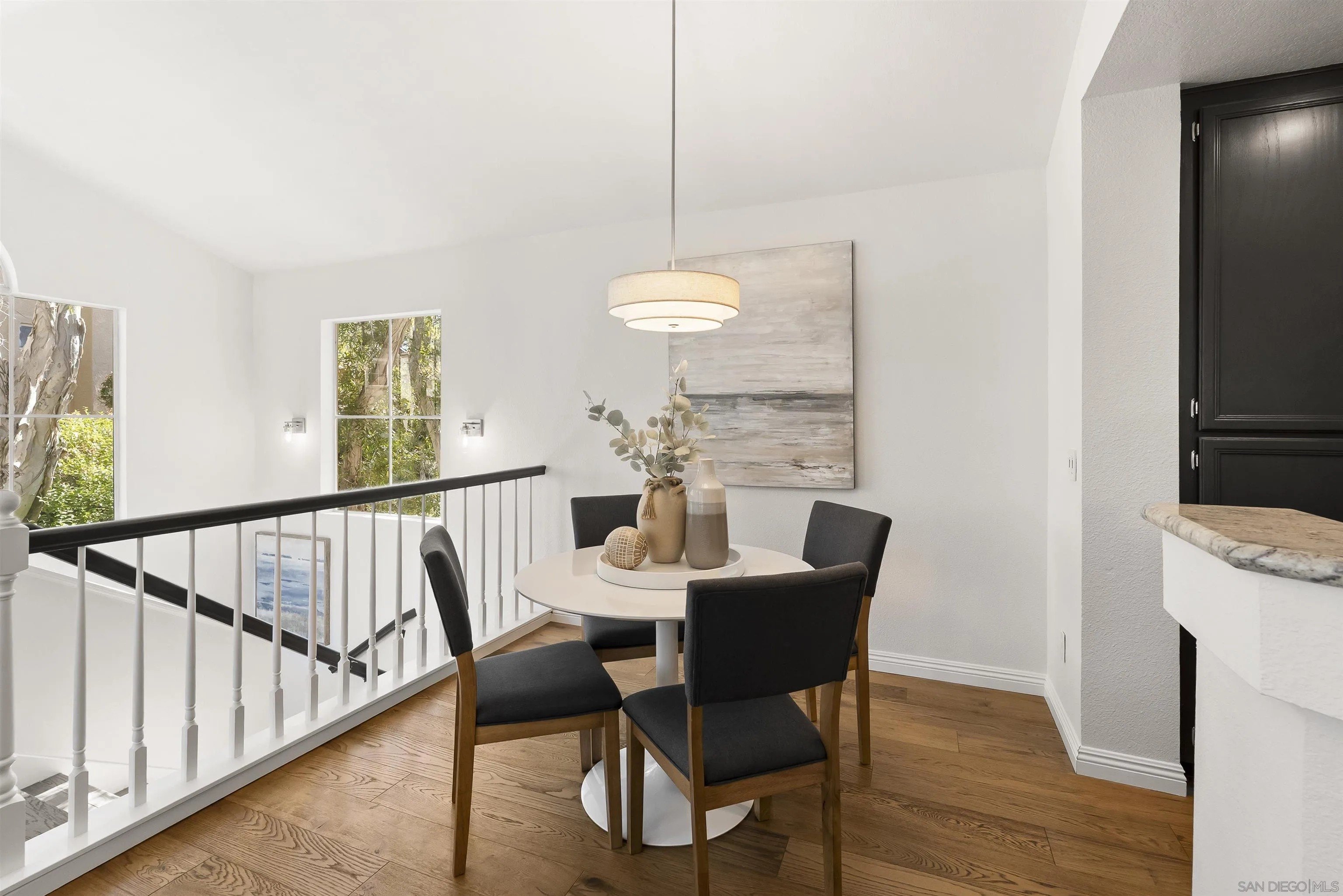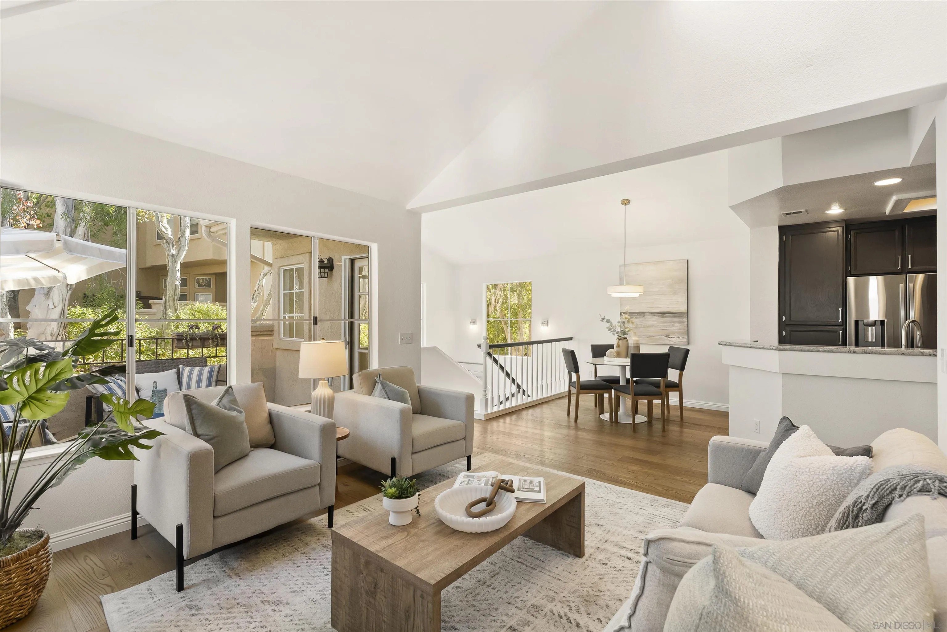 Stunning Upper-Level, 2-Bedroom, 2-Bath Condominium with a Private Corner Location! Features include a bright open floor plan, vaulted ceilings, rich engineered-wood flooring, beautiful kitchen remodel with granite counters and premium stainless steel appliances, large outdoor patio balcony, spacious bedrooms with classic wood shutters, walk-in closet, central heat and air conditioning, one-car attached garage with full-size laundry plus additional covered carport. Enjoy the beautiful Belsera community with sparkling pools, spa, recreation area with volleyball sand court, adjoining Mission Trails Park with endless hiking and biking trails and more!