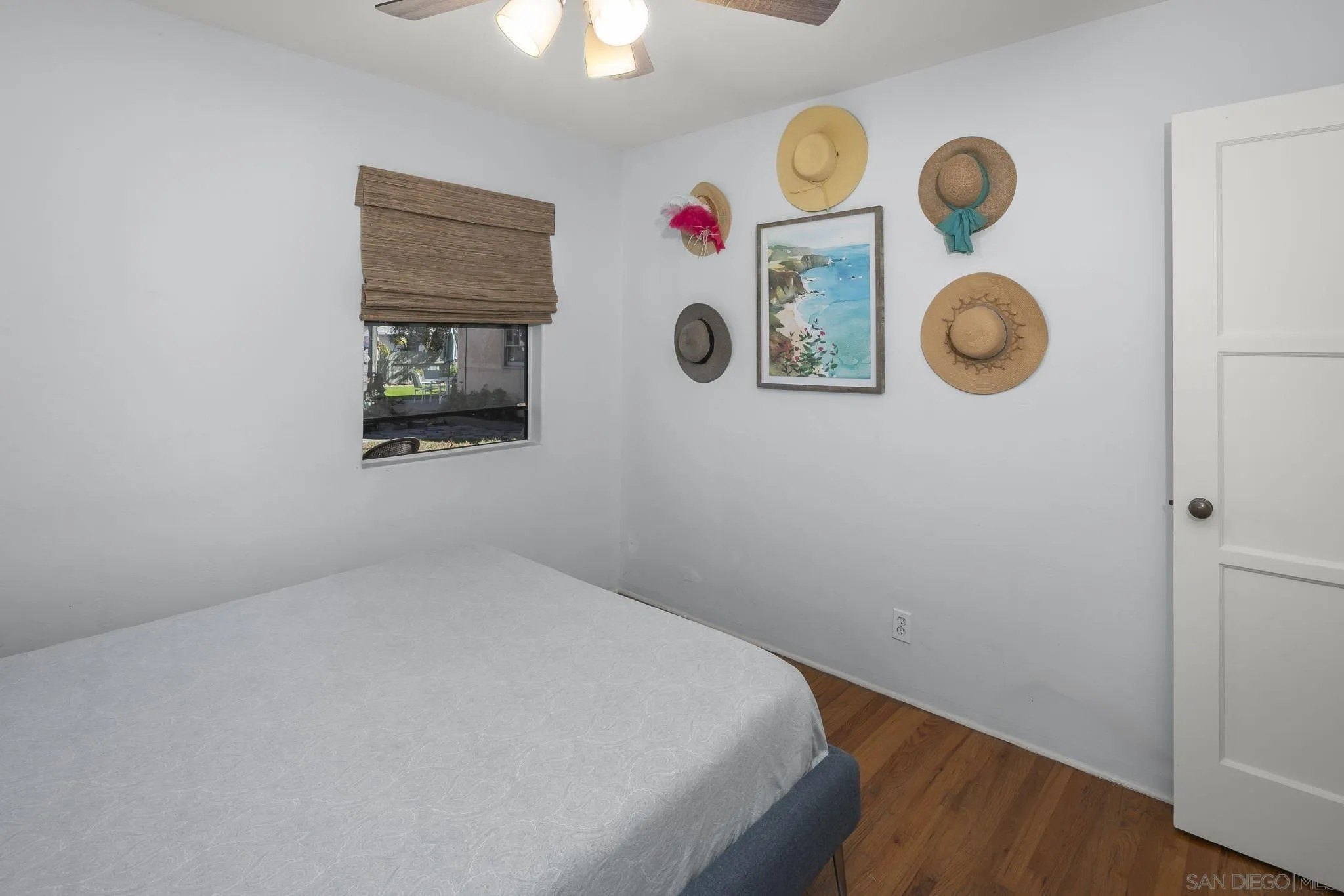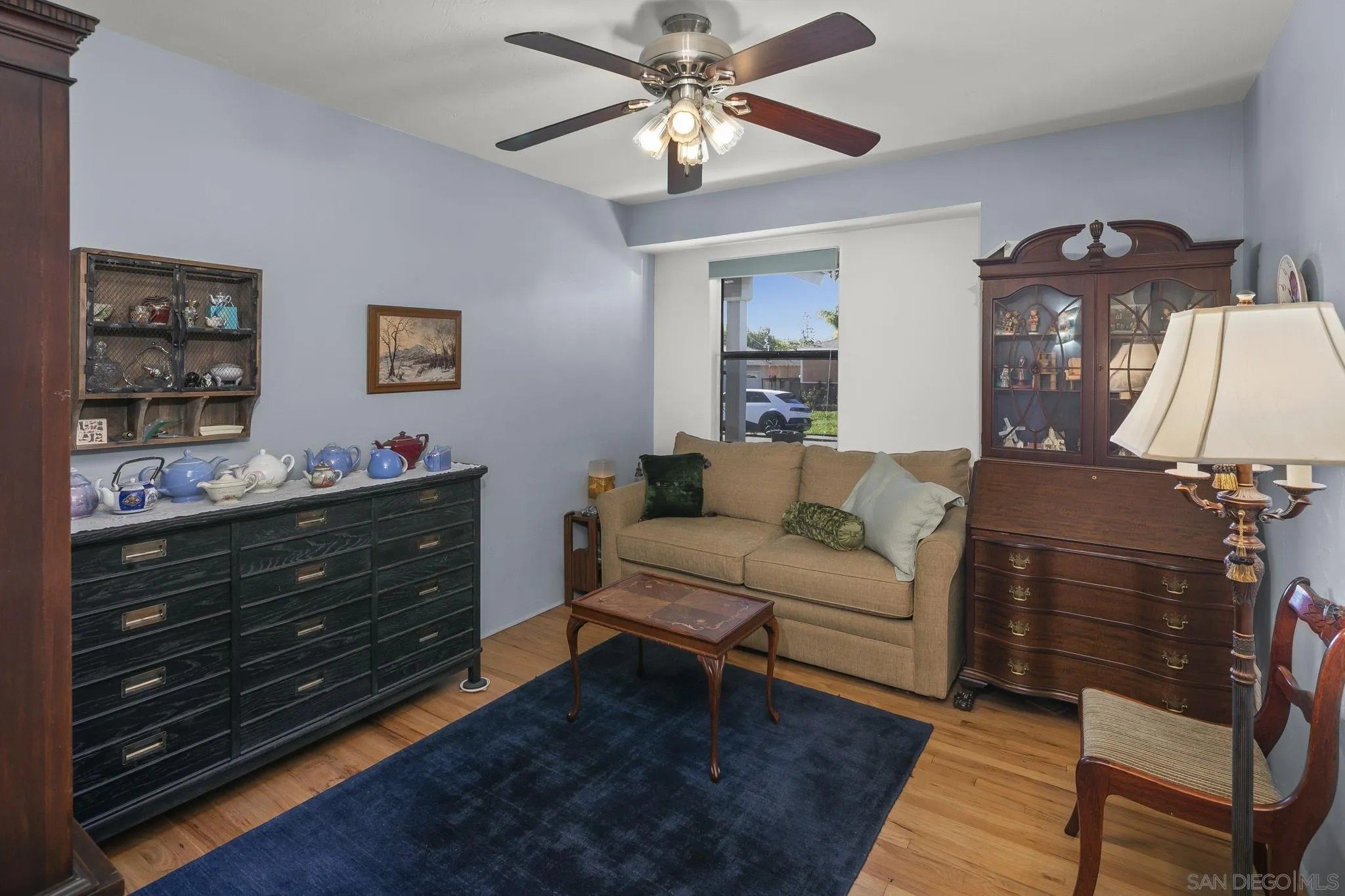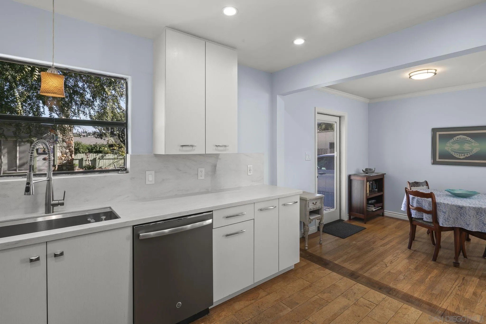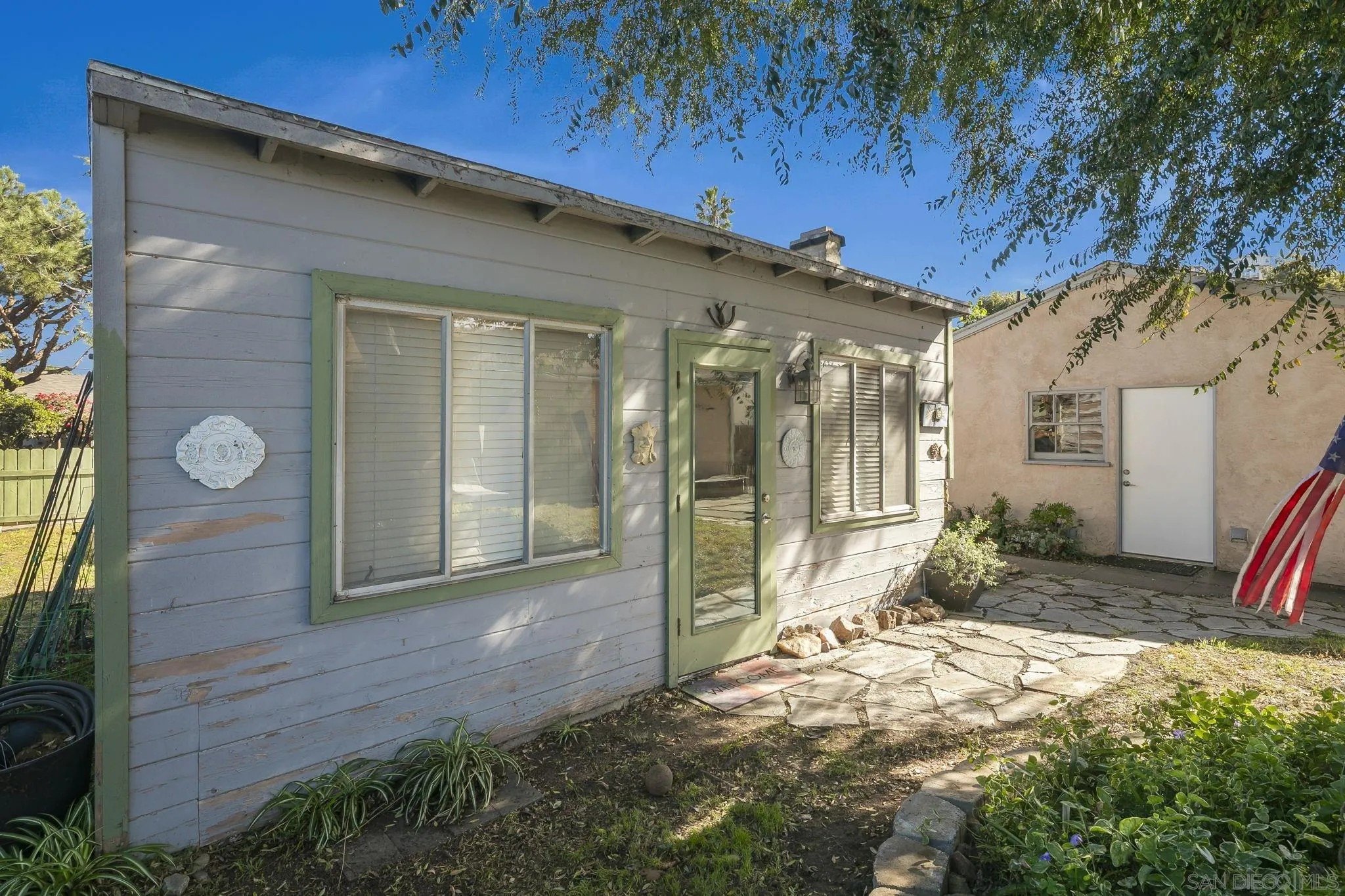 Nestled in the La Mesa neighborhood of Vista La Mesa, this charming 1073 square foot single-family home features 3 bedrooms and a beautifully remodeled bath. The remodeled kitchen shines with neutral corian like counters & backsplash along with stainless steel appliances, a gas range, recessed lighting and cork flooring. It's a great setting for culinary creativity. Enjoy the warmth of hardwood floors and the convenience of central heating and air conditioning. The property's exterior is equally impressive with easy care turf front yard and a spacious turf far backyard perfect for play. Backyard includes a storage shed complete with electrical and AC, a rose garden and a beautiful climbing rose on one fence. The "middle yard" features a shade tree (great for relaxing), patio and a detached studio which is also equipped with lighting and AC. The studio has functional windows and a fireplace along with a wall ac unit. Seller has used this as a work space. The home's two-car detached garage and long driveway ensure ample parking, while the upgraded 200-amp electrical system meets modern demands effortlessly. This home is a practical choice for those seeking both tranquility and accessibility.