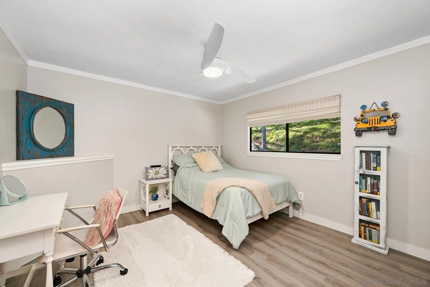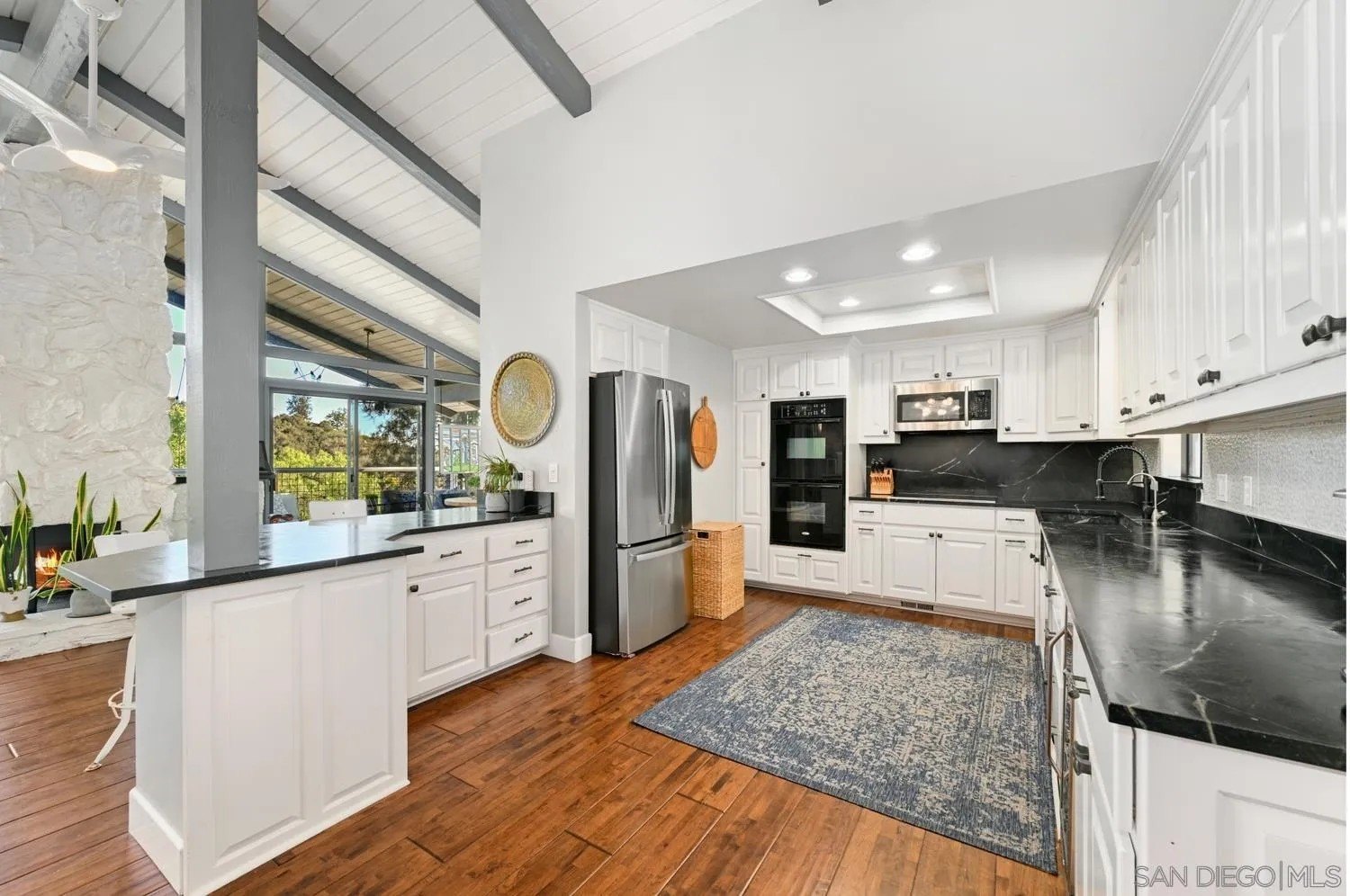 Situated on just over an acre, this remarkable home offers privacy, sweeping views, and elevated modern comfort. Designed for hosting and everyday living alike, the expansive layout features dramatic cathedral ceilings, a sunken living room, and picture windows that capture the surrounding scenery. The heart of the home is a beautifully designed kitchen with crisp white cabinetry, stainless steel appliances, a farmhouse sink, and a modern custom backsplash-perfectly suited for entertaining. Additional highlights include a cozy fireplace, luxury vinyl plank flooring throughout all bedrooms, custom tile showers, and on-trend barn door accents. Outdoor living is truly exceptional, with a wraparound balcony and a resort-style backyard showcasing a pool and spa finished with a mini-pebble surface, expansive grassy areas, and mature trees that enhance the tranquil setting. Energy-efficient solar paired with a Tesla Powerwall, central air conditioning, and a flexible floor plan-including a private downstairs double primary suite option-add comfort and versatility. A large circular driveway offers abundant parking, while the attached three-car garage provides added convenience. Located in a peaceful, quiet neighborhood with easy access to I-15, this two-story retreat delivers the perfect balance of seclusion, luxury, and commuter-friendly living.