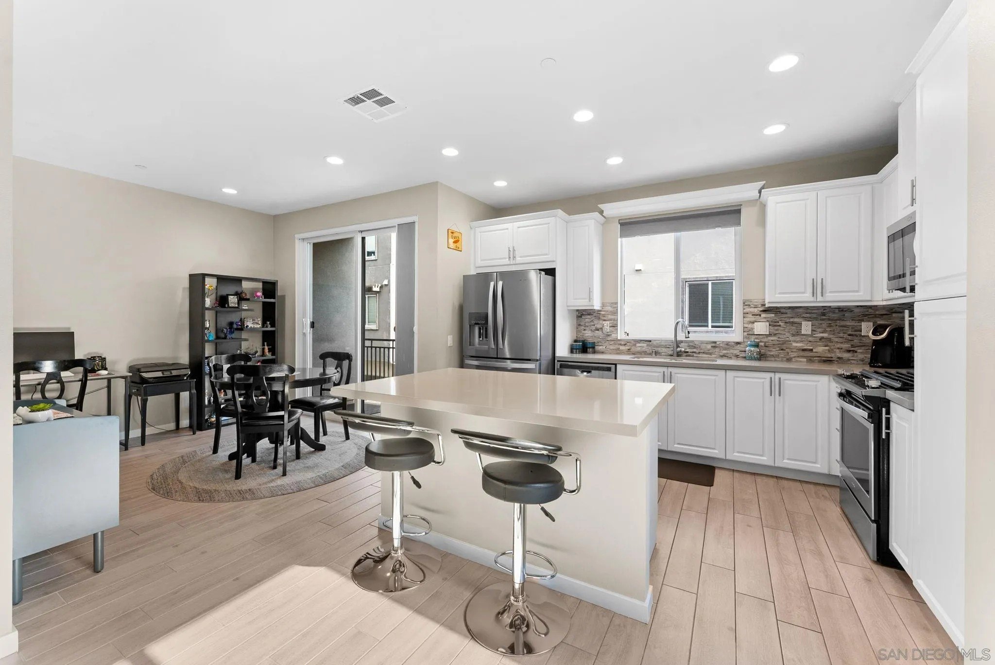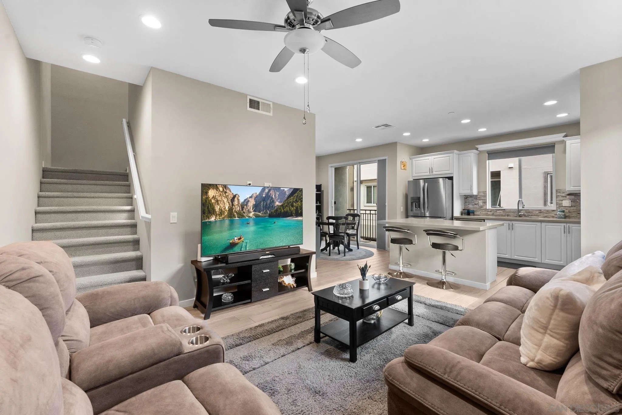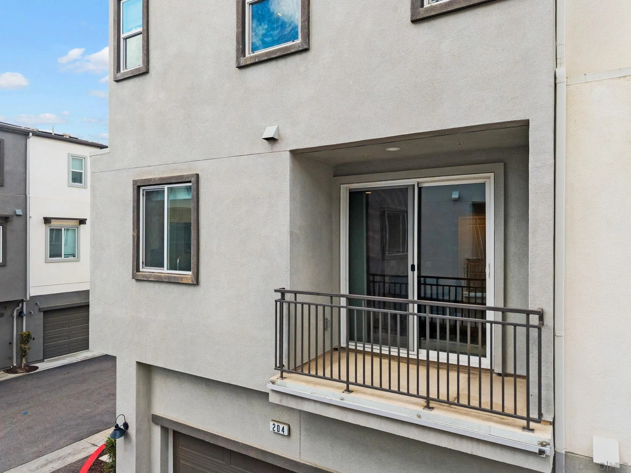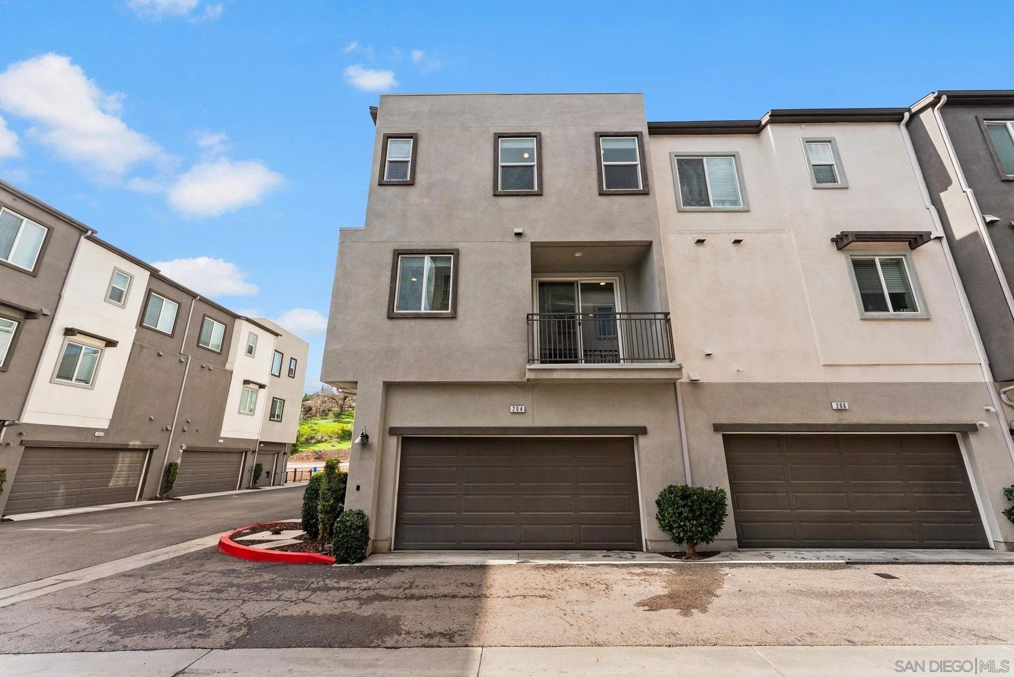 Welcome to your modern highly sought-after Citron community. This stunning 2-bed, 2.5-bath townhouse, built in 2018, showcases clean modern architecture, contemporary finishes, and an inviting atmosphere across 1,130 sq. ft. of thoughtfully designed living space. The bright, corner unit, and open-concept layout is enhanced by recessed LED lighting with upgraded porcelain flooring through the entry, kitchen, and baths, while plush carpet in the living room and bedrooms for warmth and comfort. The chef's kitchen features stainless steel appliances, bright white cabinetry with brushed nickel hardware, quartz countertops, and a stylish tile backsplash. Enjoy the spacious living area or step out onto the balcony - perfect for morning coffee or evening relaxation. Both bedrooms offer comfort and privacy. The primary suite includes a walk-in closet and en-suite bath with white cabinetry and white counters. The secondary bedroom also features its own full bath, ideal for guests, children, or a home office. Additional highlights include tankless water heater, NEW HVAC, direct-access 2-car garage parking with plenty of overhead storage and access to community amenities such as a dog run, sitting areas, playground, and BBQ areas. Located in desirable South Escondido, you're just minutes from freeways, parks, dining, and shopping. Low HOA and **NO MELLO ROOS.**