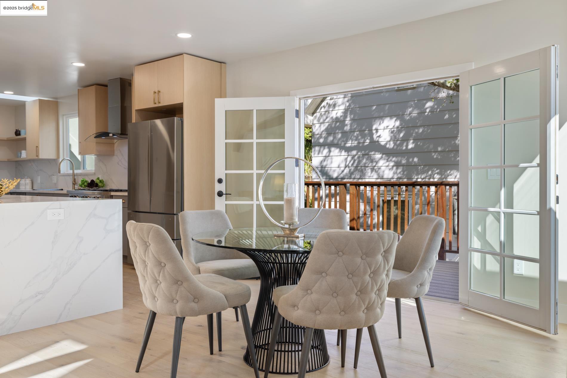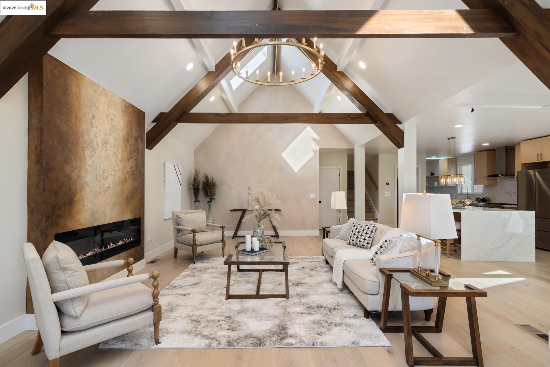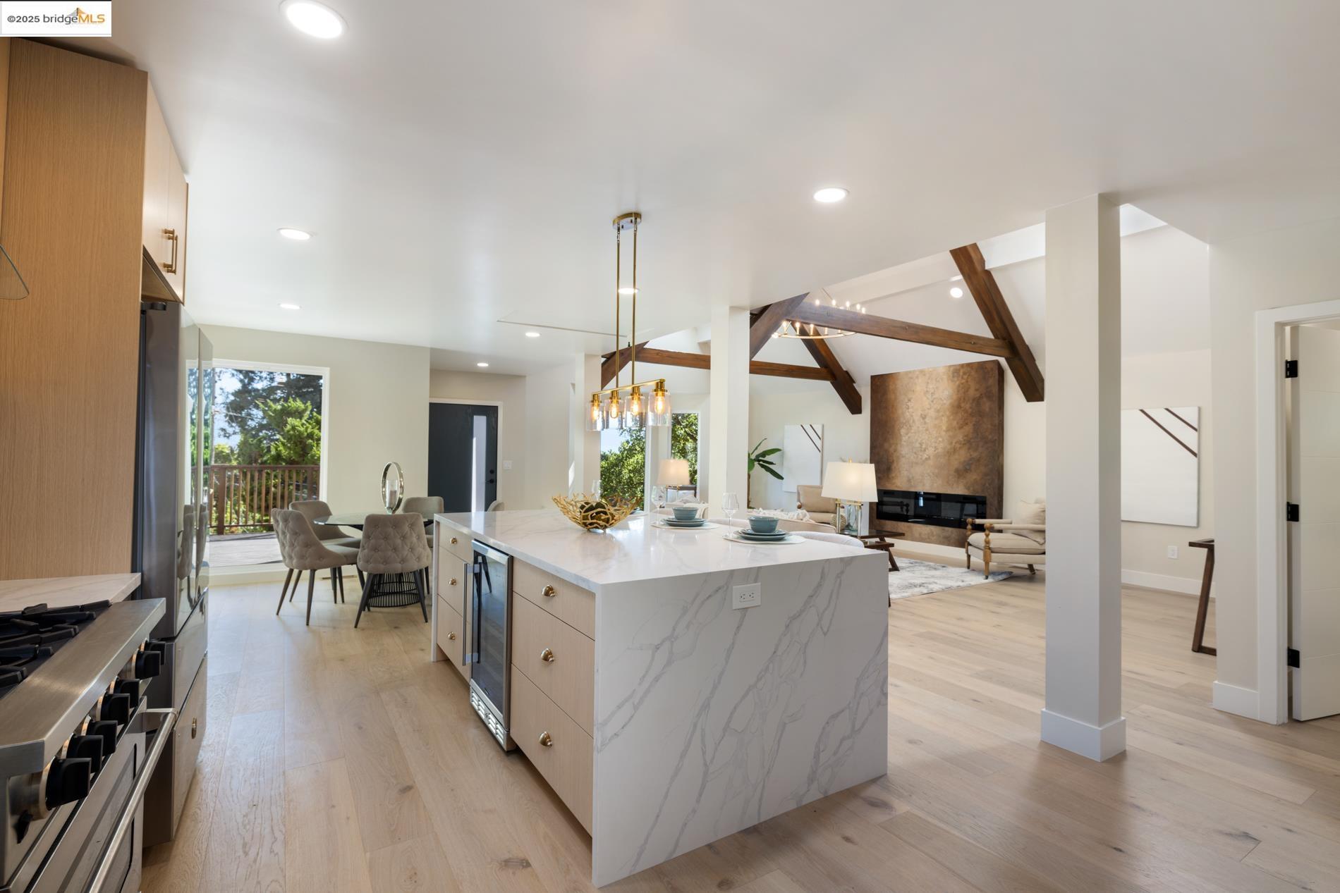 Open Sunday, this Berkeley Hills Tudor has been transformed into a light-filled, modern retreat that seamlessly blends old-world charm with contemporary elegance. The top-to-bottom remodel has elevated the property to a true oasis, overlooking the treetops and Berkeley skyline. As you enter, the soaring skylit ceilings and hand-hewn beams create an inviting, old-world ambiance, while the hand-painted palette of soft naturals unifies the open-space design. The living room features a sleek, modern fireplace, while the 8-foot chef's kitchen island with a stone waterfall counter and the expansive dining space with floor-to-ceiling windows and doors that open to a 560-square-foot wrap-around deck, create a harmonious flow throughout the main living areas. The main floor boasts a bed-and-bath suite with a spa-like bathroom, complete with a seamless, walk-in steam room shower and heated floors. Upstairs, three more bedrooms are uniquely laid out for maximum privacy, including an en-suite primary suite with a walk-in closet and its own indoor-outdoor connection to a private rear yard. Downstairs, a separate-entry integrated ADU offers additional living space, with a living room, bedroom, kitchenette, and a luxury bath, providing flexibility and independence for guests or family members.