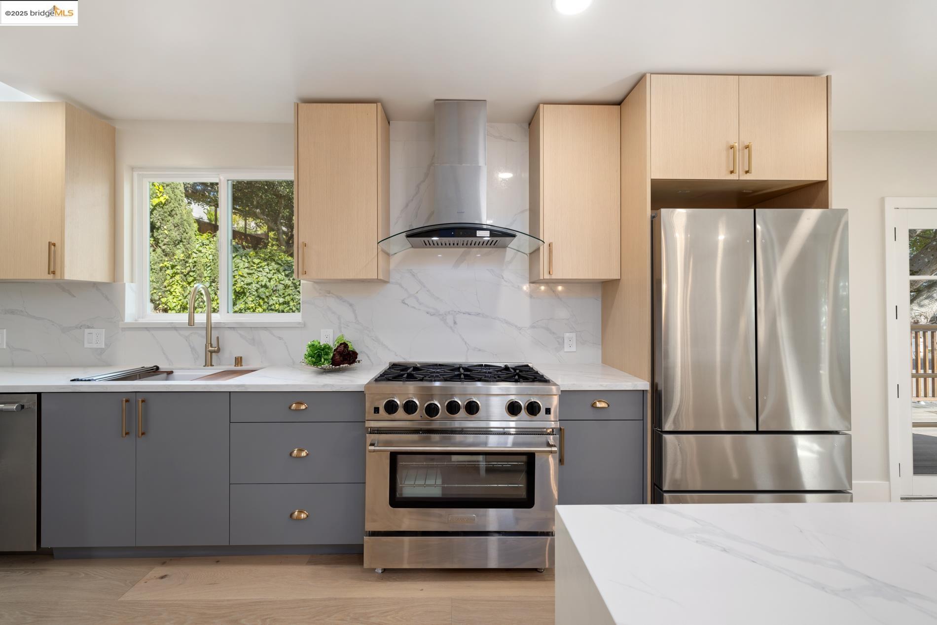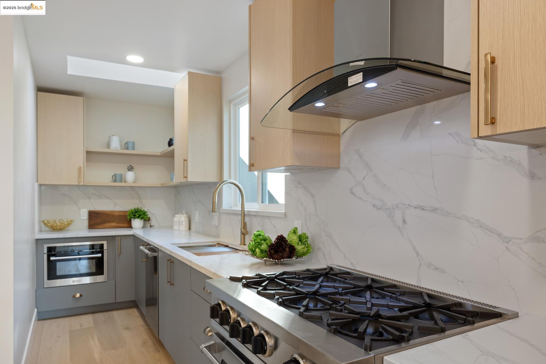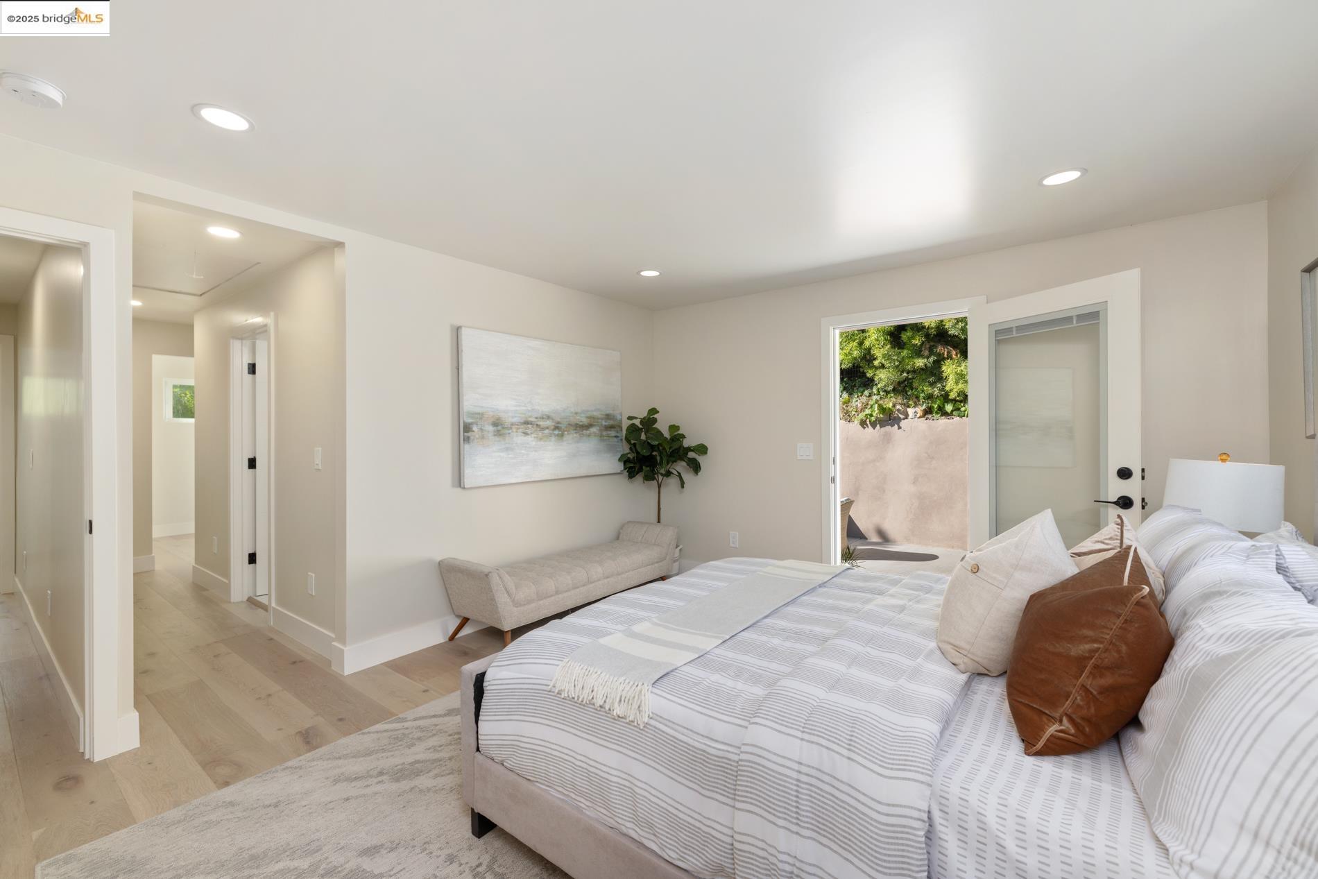 Open Sunday, this Berkeley Hills Tudor has been transformed into a light-filled, modern retreat that seamlessly blends old-world charm with contemporary elegance. The top-to-bottom remodel has elevated the property to a true oasis, overlooking the treetops and Berkeley skyline. As you enter, the soaring skylit ceilings and hand-hewn beams create an inviting, old-world ambiance, while the hand-painted palette of soft naturals unifies the open-space design. The living room features a sleek, modern fireplace, while the 8-foot chef's kitchen island with a stone waterfall counter and the expansive dining space with floor-to-ceiling windows and doors that open to a 560-square-foot wrap-around deck, create a harmonious flow throughout the main living areas. The main floor boasts a bed-and-bath suite with a spa-like bathroom, complete with a seamless, walk-in steam room shower and heated floors. Upstairs, three more bedrooms are uniquely laid out for maximum privacy, including an en-suite primary suite with a walk-in closet and its own indoor-outdoor connection to a private rear yard. Downstairs, a separate-entry integrated ADU offers additional living space, with a living room, bedroom, kitchenette, and a luxury bath, providing flexibility and independence for guests or family members.