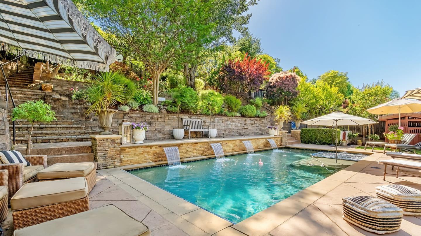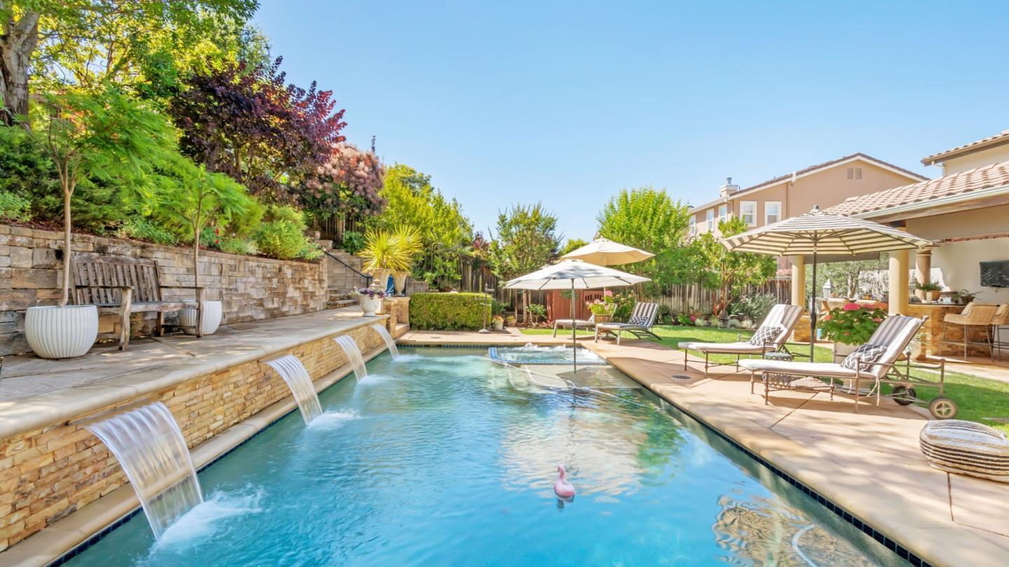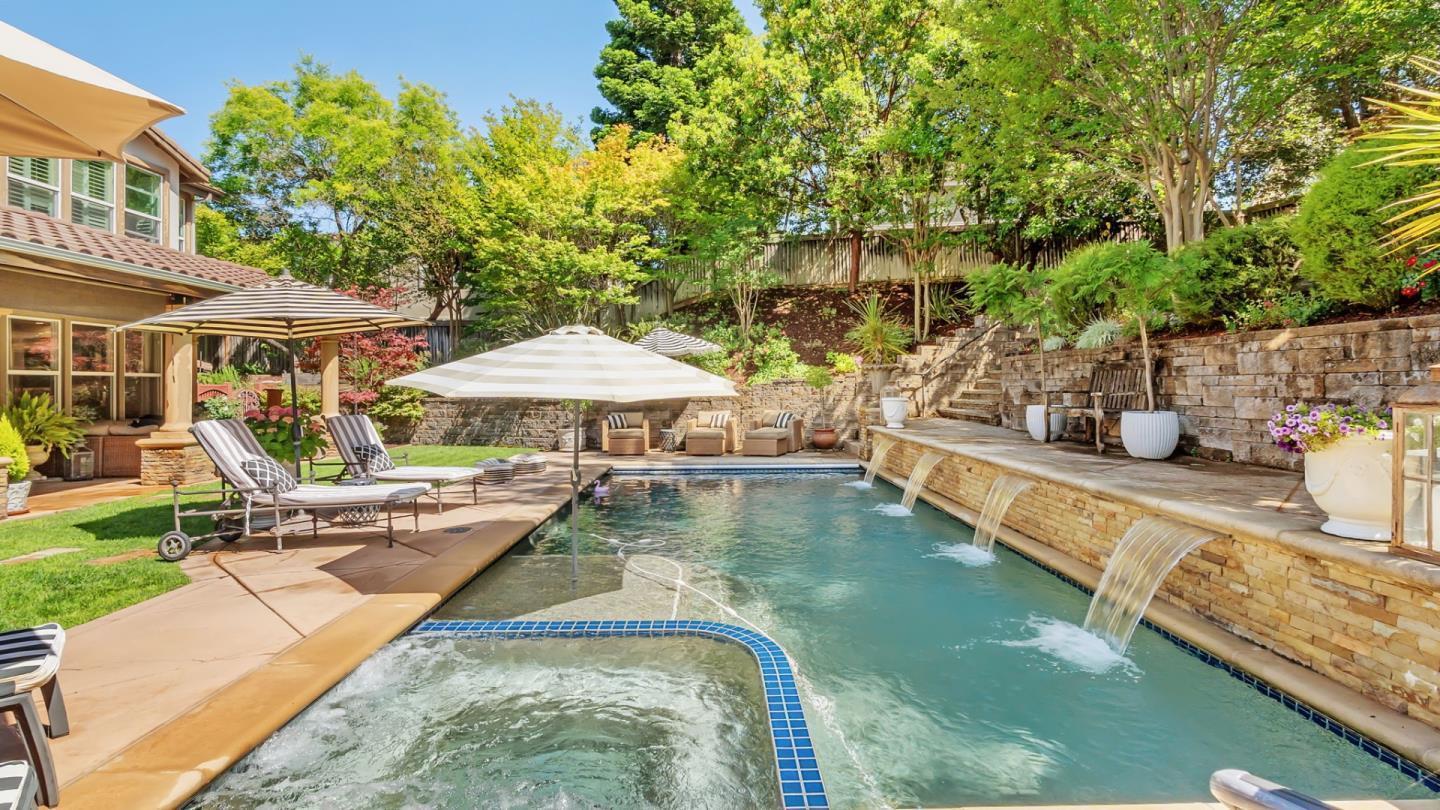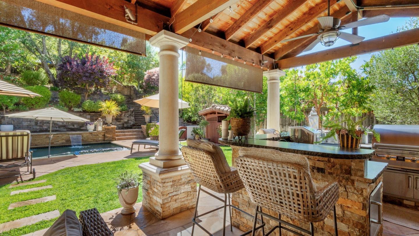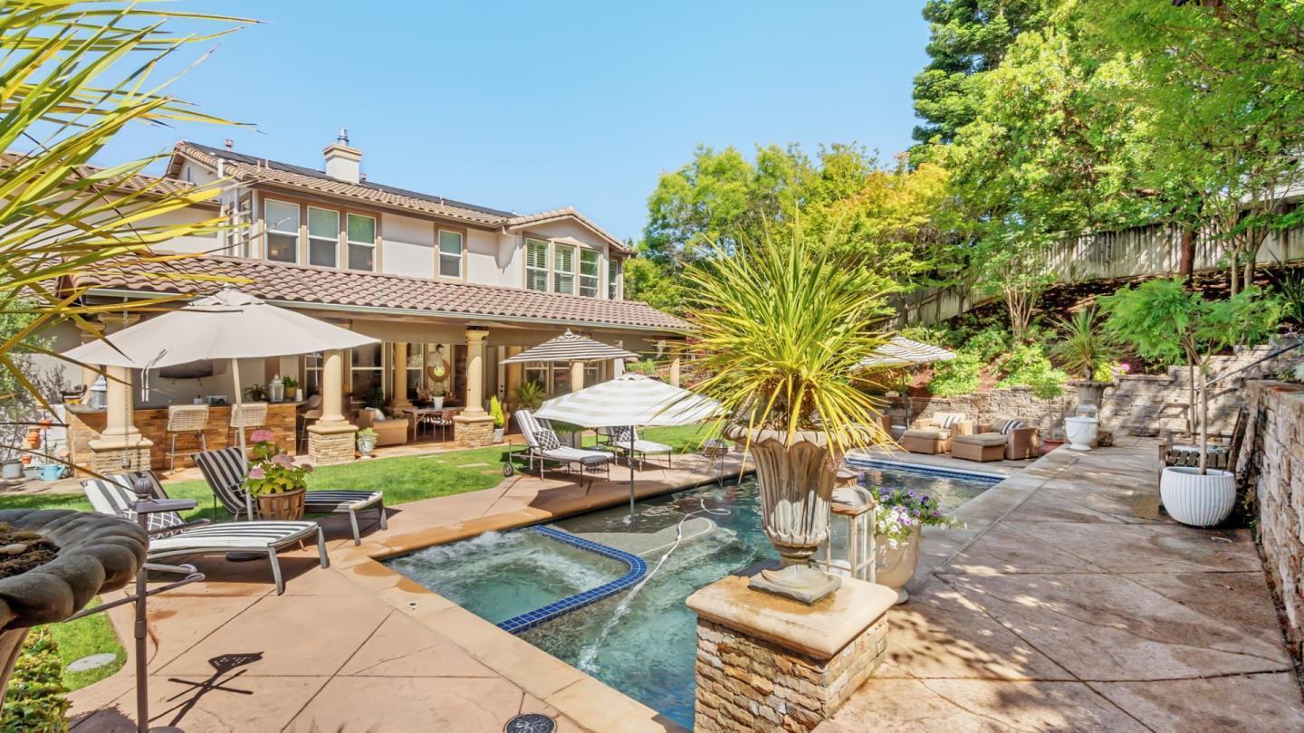 Experience the epitome of luxury living in this stunning 5 bedroom home with a private bedroom and bath downstairs. This home is a work of art, boasting 3,996 square feet of living space on a spacious 13,939 square foot lot. From the moment you arrive, you will be captivated by the grandeur of this property. Step inside to find a gourmet kitchen equipped with top-of-the-line SS Sub-Zero french door refrigerator, a spacious living area with high ceilings adorned with custom tile, millwork, and lighting. The home features new windows, wrought iron details, a wet bar, and a cozy fireplace. The primary suite is a true oasis, complete with a luxurious spa-like bath and stunning views. Venture outside to discover a resort-like outdoor living space perfect for entertaining or simply unwinding. The outdoor area includes a sparkling pool, spa, outdoor kitchen, and a firepit on the upper deck, providing an ideal setting for relaxing under the stars. The property also boasts a majestic oak tree surrounded by fragrant fruit trees. This unique property is filled with custom finishes and upgrades, making it a truly exceptional home. The neighborhood offers a family-friendly atmosphere and convenient access to amenities such as the golf course and clubhouse.