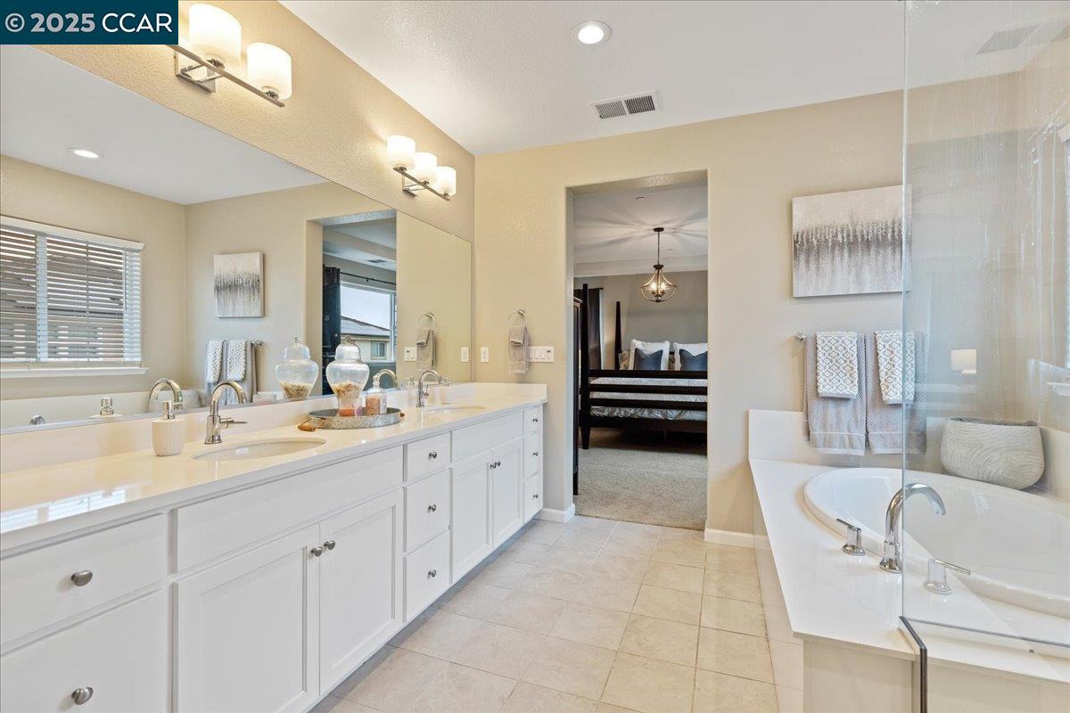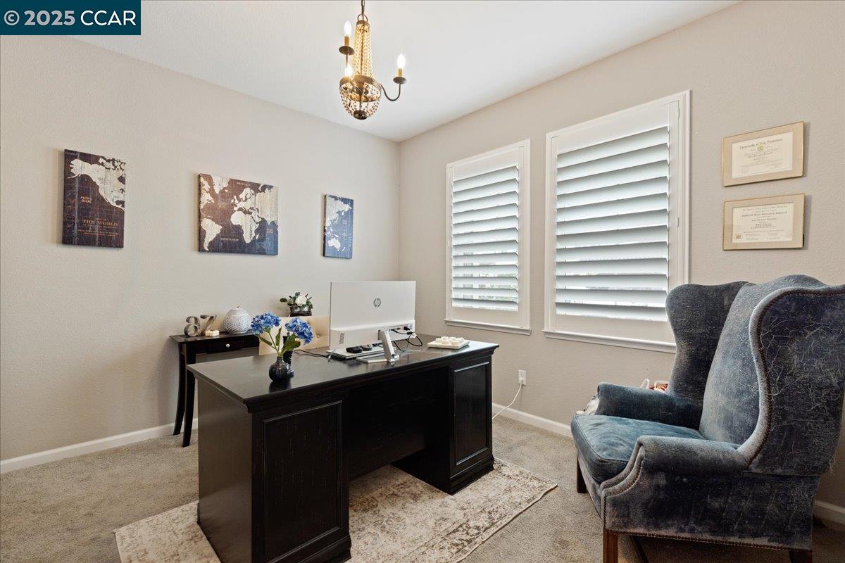 Welcome to this stunning 2018-built home in the desirable Emerson Ranch neighborhood! This 3,572 sq. ft. two-story residence blends comfort and style with numerous upgrades throughout. The entry leads to the first office and a formal dining/bonus room that connects to the chef's kitchen, featuring quartz countertops, stainless steel appliances, an expansive island for five, and a walk-in pantry with prep counter and storage. The open kitchen-family-dining layout is perfect for everyday living. A main-level bedroom and full bath offer convenience for guests or multi-generational living. Also on the main level is a second office/workspace with built-ins. Upstairs boasts a spacious bonus room, four bedrooms, three baths, and a large laundry room with built-in cabinetry and counter space. The private primary suite features a spa-like bath with a soaking tub, a walk-in shower, dual sinks, and a grand custom walk-in closet. Step out back into the California room with two separate fire pit areas and space to add to your dream backyard. This home also offers a 2 car garage with tandem parking and plenty of storage. Don't miss this exceptional home!