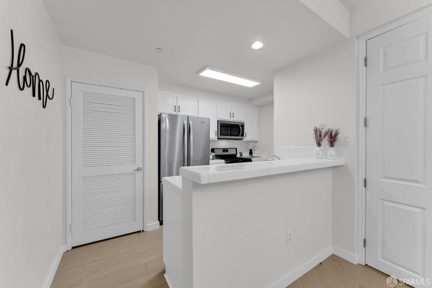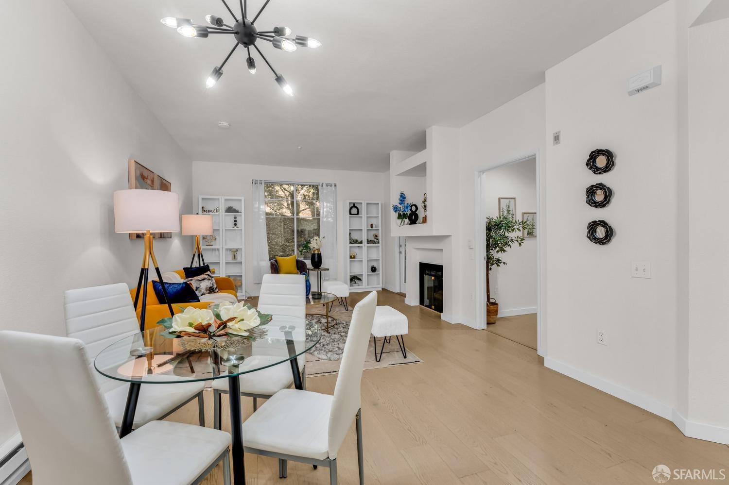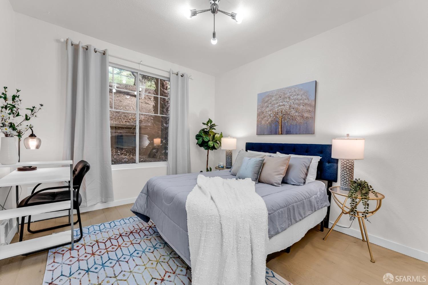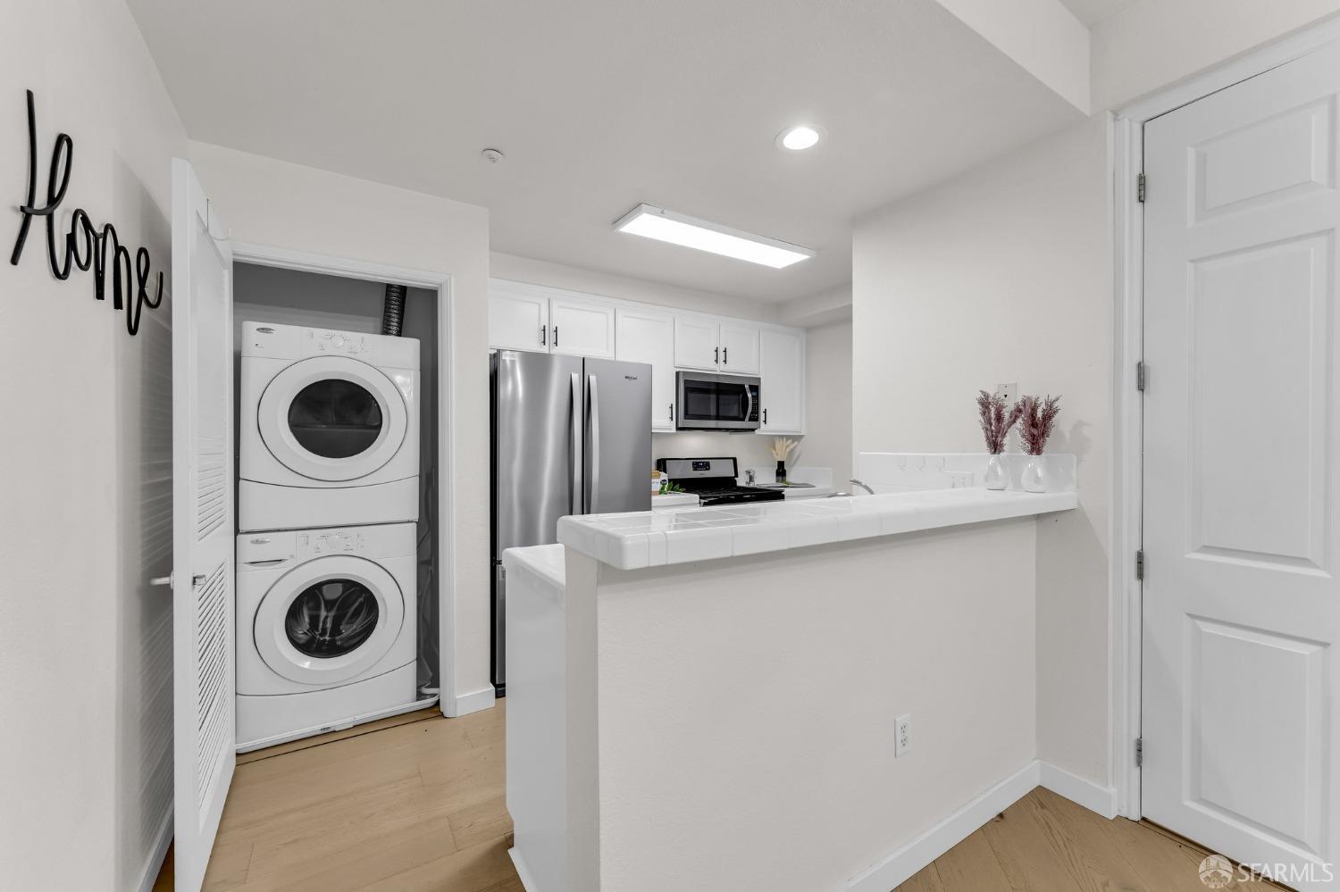 Experience a sanctuary of privacy and tranquility in this low-rise community, where sophistication meets comfort. This exquisite residence spans 1,119 square feet, featuring two spacious bedrooms and two spacious bathrooms. The 2nd bathroom has been thoughtfully upgraded to provide a serene escape. Step inside to discover a home that exudes sophistication, with freshly painted cabinets accented by modern hardware and new LED lighting that illuminates the space with a warm and inviting glow. The open layout seamlessly connects the living area to a kitchen equipped with stainless steel appliances and a gas stove, perfect for culinary enthusiasts. This pet-friendly residence ensures comfort with electric baseboard heating and includes a washer and dryer in the unit for added convenience.Enjoy the luxury of two independent parking spaces in the garage, conveniently located near the elevator. Community amenities abound, offering a lifestyle of leisure and wellness. Take advantage of the heated pool, unwind in the sauna, or maintain your fitness routine in the well-appointed gym. A security gate provides an added layer of assurance, while guest parking accommodates visitors effortlessly. Make this exceptional property your new home and embrace the vibrant lifestyle of Oakland.