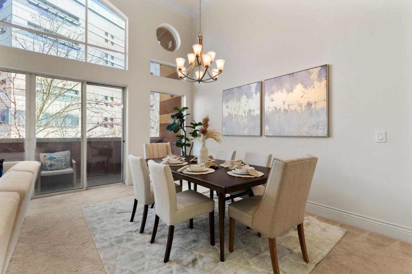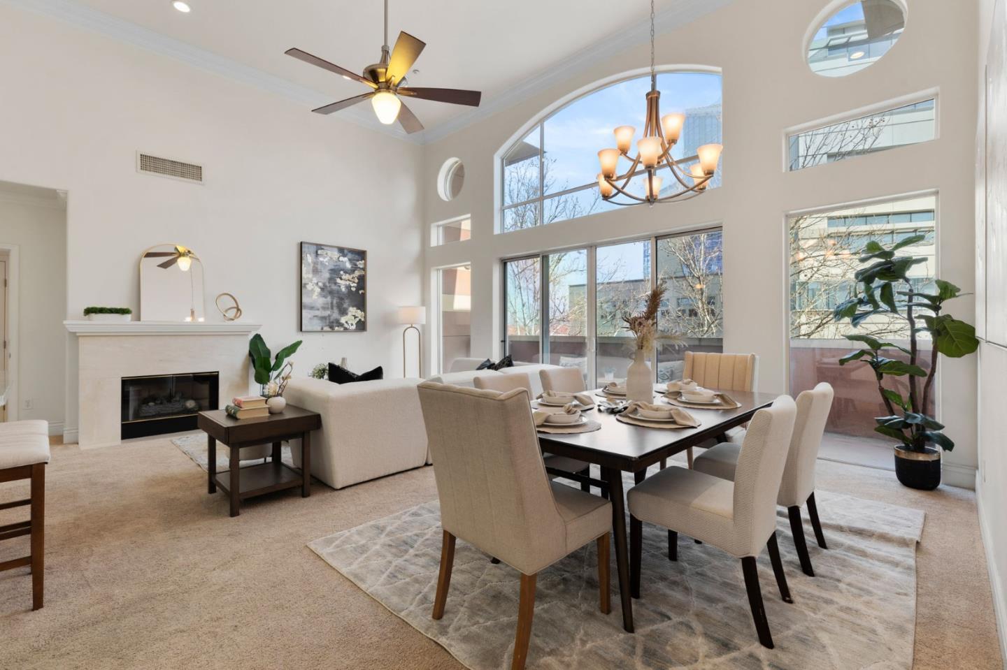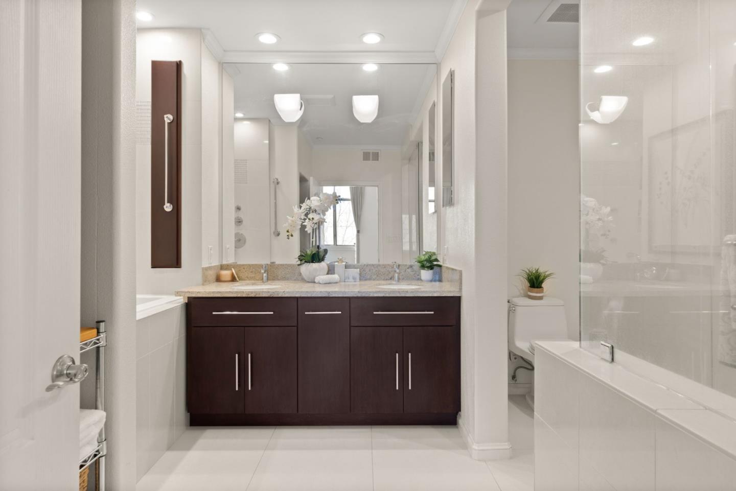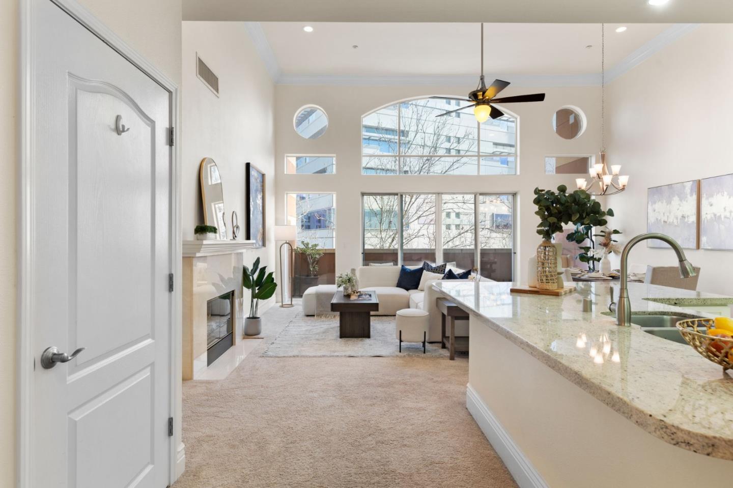 This luxury condo has been completely remodeled and has it all. Top floor, penthouse unit. Vaulted ceilings with large windows and tons of natural sunlight. 2 bedrooms, 2 full bathrooms, and a dedicated office. Gorgeous chef's kitchen with stainless steel appliances and granite counters. Custom kitchen cabinets with soft-close doors, pull-out drawers, and lots of pantry space. Extended kitchen peninsula for extra counter space. Huge primary bedroom suite with large walk-in closet. Amazing spa-like primary bath retreat with custom stall shower and huge luxury Kalia 3 designer square tub. Soak your worries away! Fully functioning home office that has been wired for networking and has tons of cabinet space. Home has been completely wired for Control4 smart home and audio-visual capabilities for the absolute best home entertainment. Recessed lighting throughout and ceiling fans in living room and bedrooms. Terrific top floor location with city and foothill views. Outdoor balcony. Includes 2 parking spaces and additional storage. Great location with restaurants and theaters right outside your doorstep. Easy walk to SJSU, San Pedro Square, SAP Center, and more.
