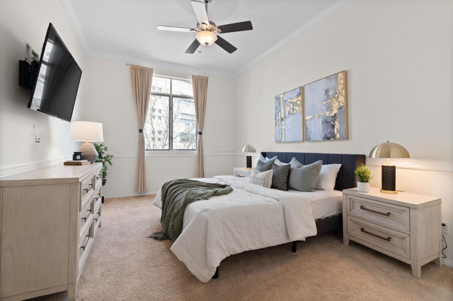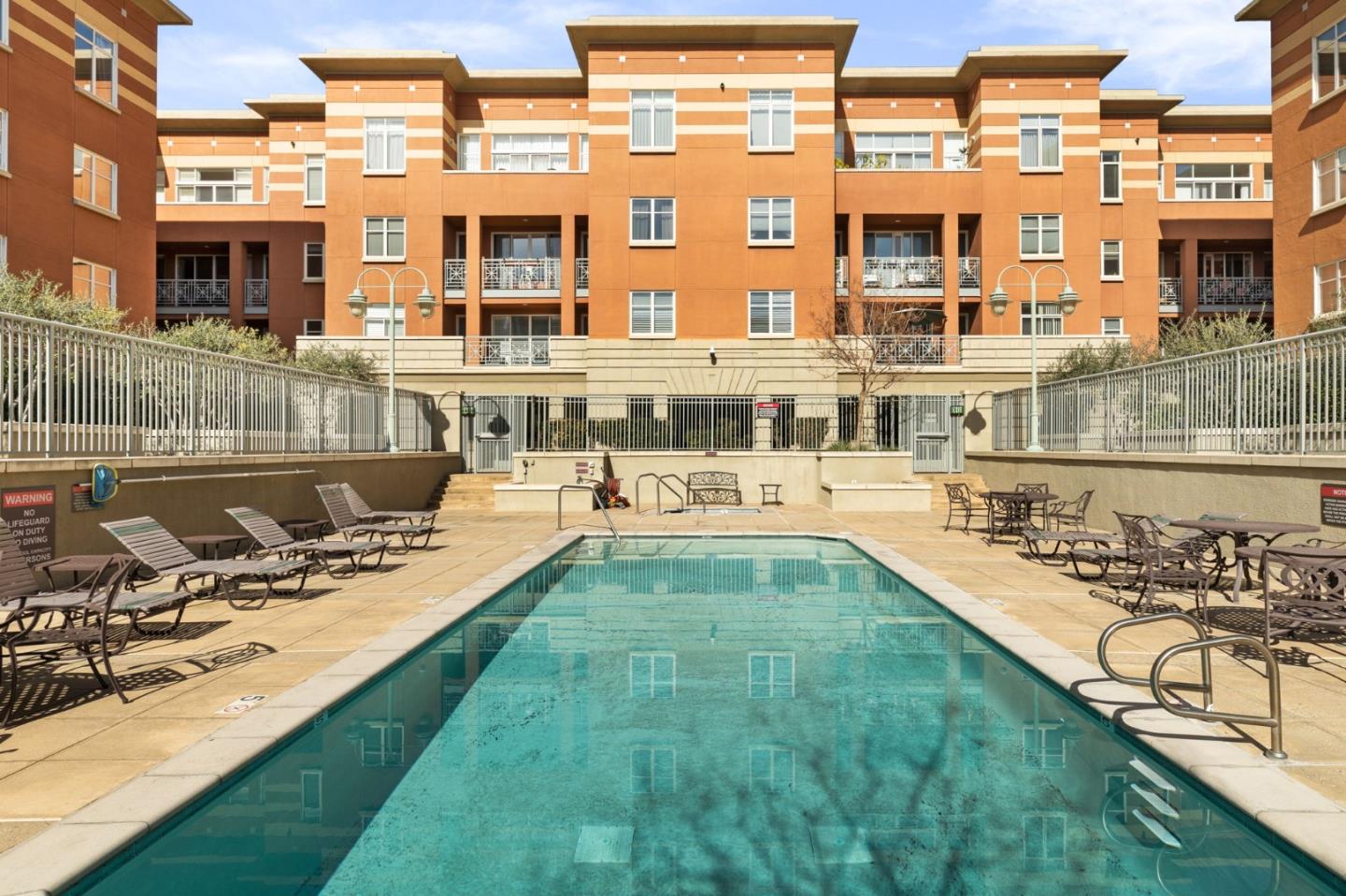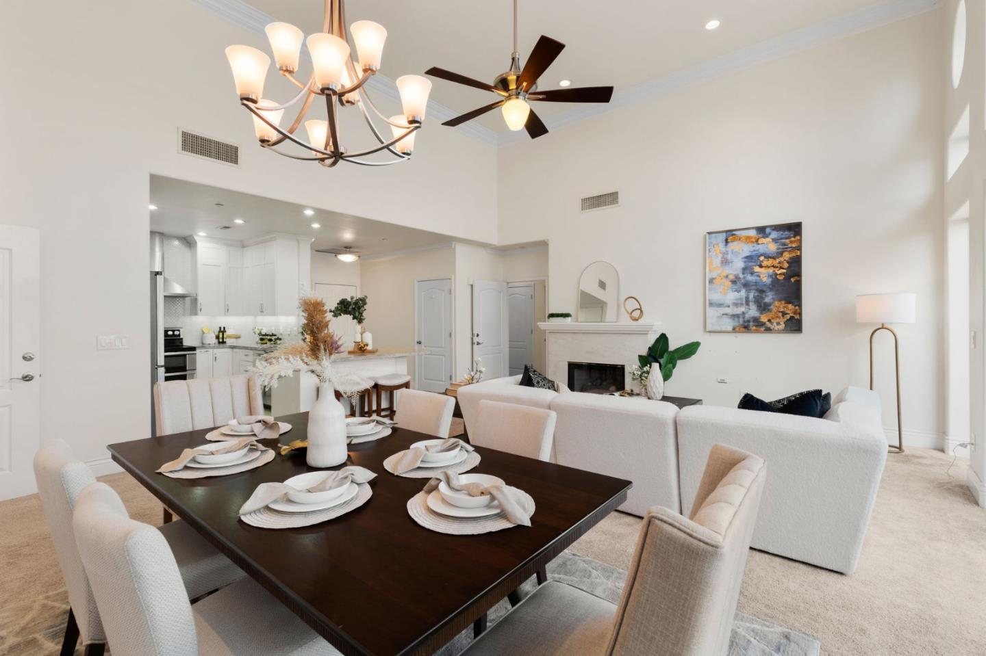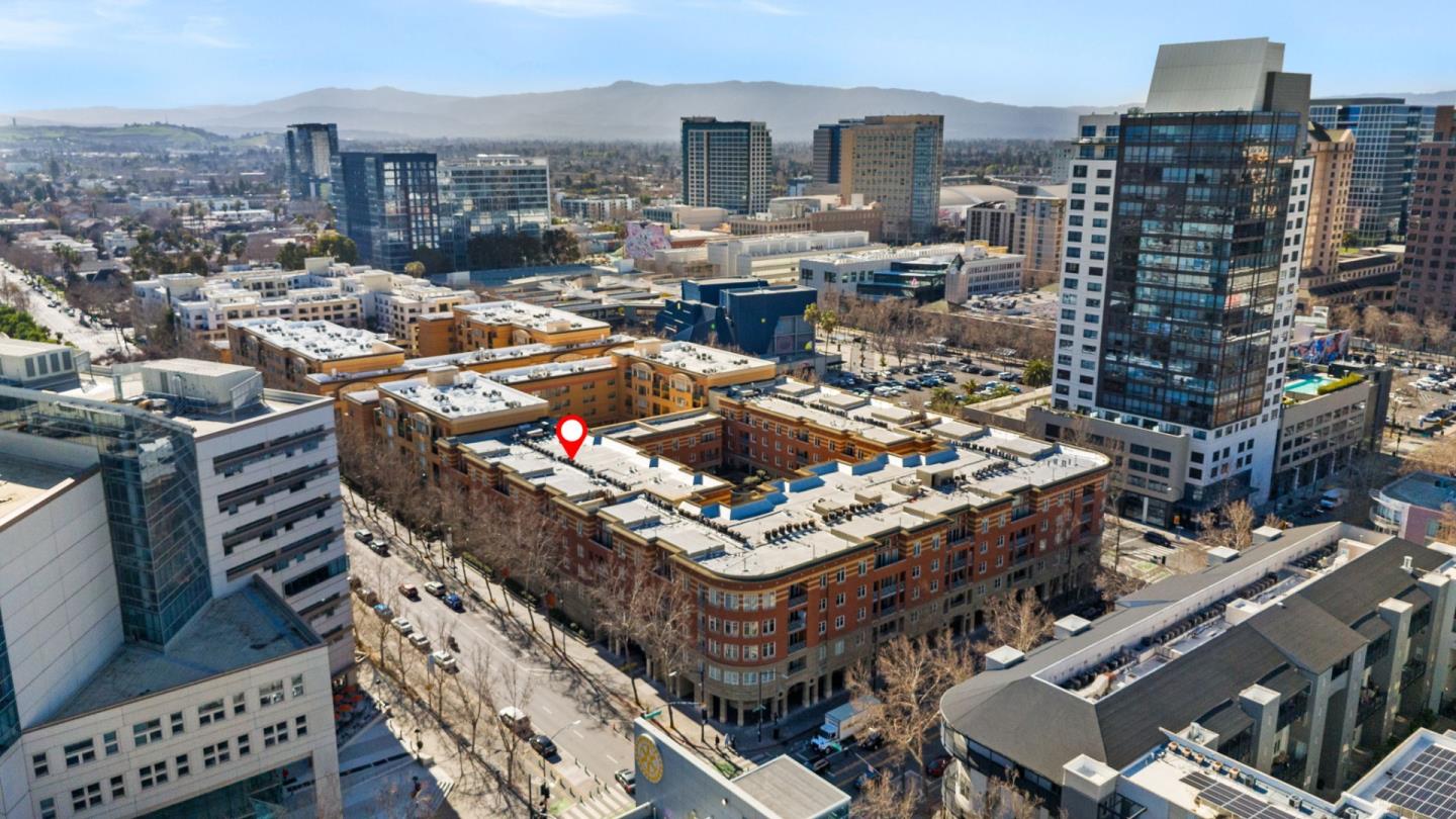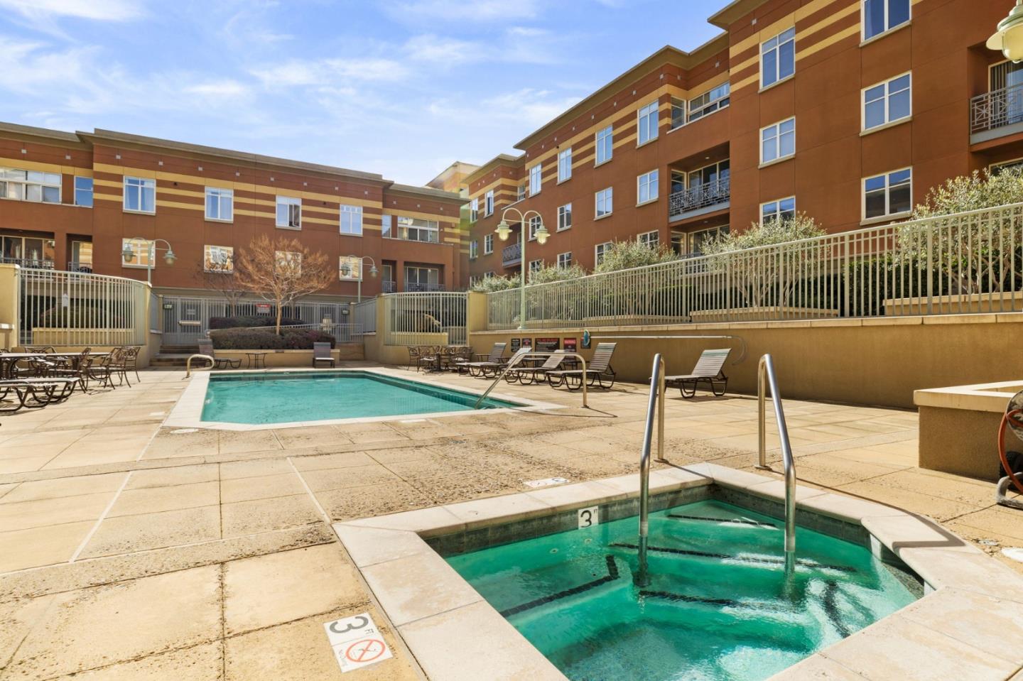 This luxury condo has been completely remodeled and has it all. Top floor, penthouse unit. Vaulted ceilings with large windows and tons of natural sunlight. 2 bedrooms, 2 full bathrooms, and a dedicated office. Gorgeous chef's kitchen with stainless steel appliances and granite counters. Custom kitchen cabinets with soft-close doors, pull-out drawers, and lots of pantry space. Extended kitchen peninsula for extra counter space. Huge primary bedroom suite with large walk-in closet. Amazing spa-like primary bath retreat with custom stall shower and huge luxury Kalia 3 designer square tub. Soak your worries away! Fully functioning home office that has been wired for networking and has tons of cabinet space. Home has been completely wired for Control4 smart home and audio-visual capabilities for the absolute best home entertainment. Recessed lighting throughout and ceiling fans in living room and bedrooms. Terrific top floor location with city and foothill views. Outdoor balcony. Includes 2 parking spaces and additional storage. Great location with restaurants and theaters right outside your doorstep. Easy walk to SJSU, San Pedro Square, SAP Center, and more.