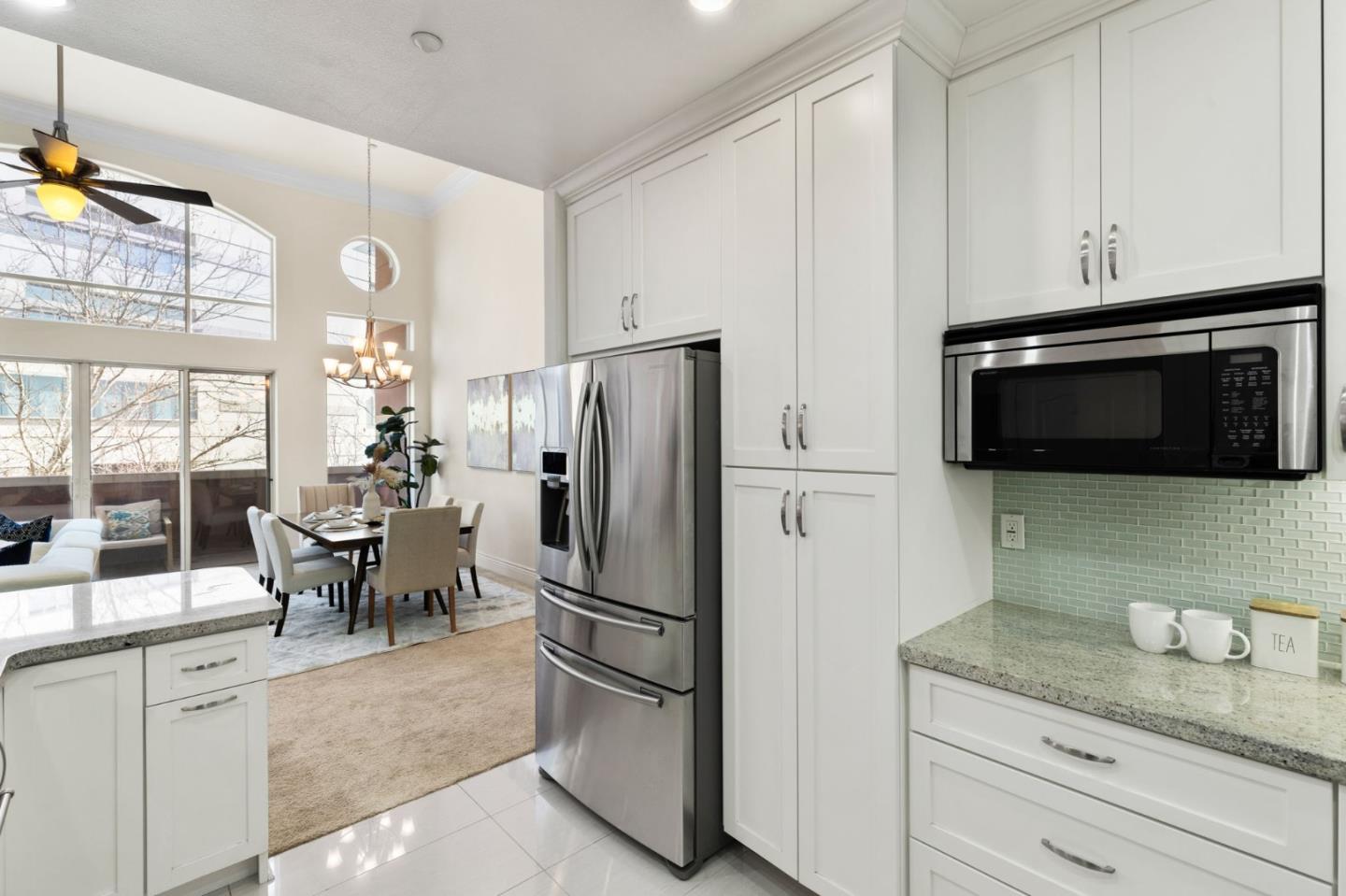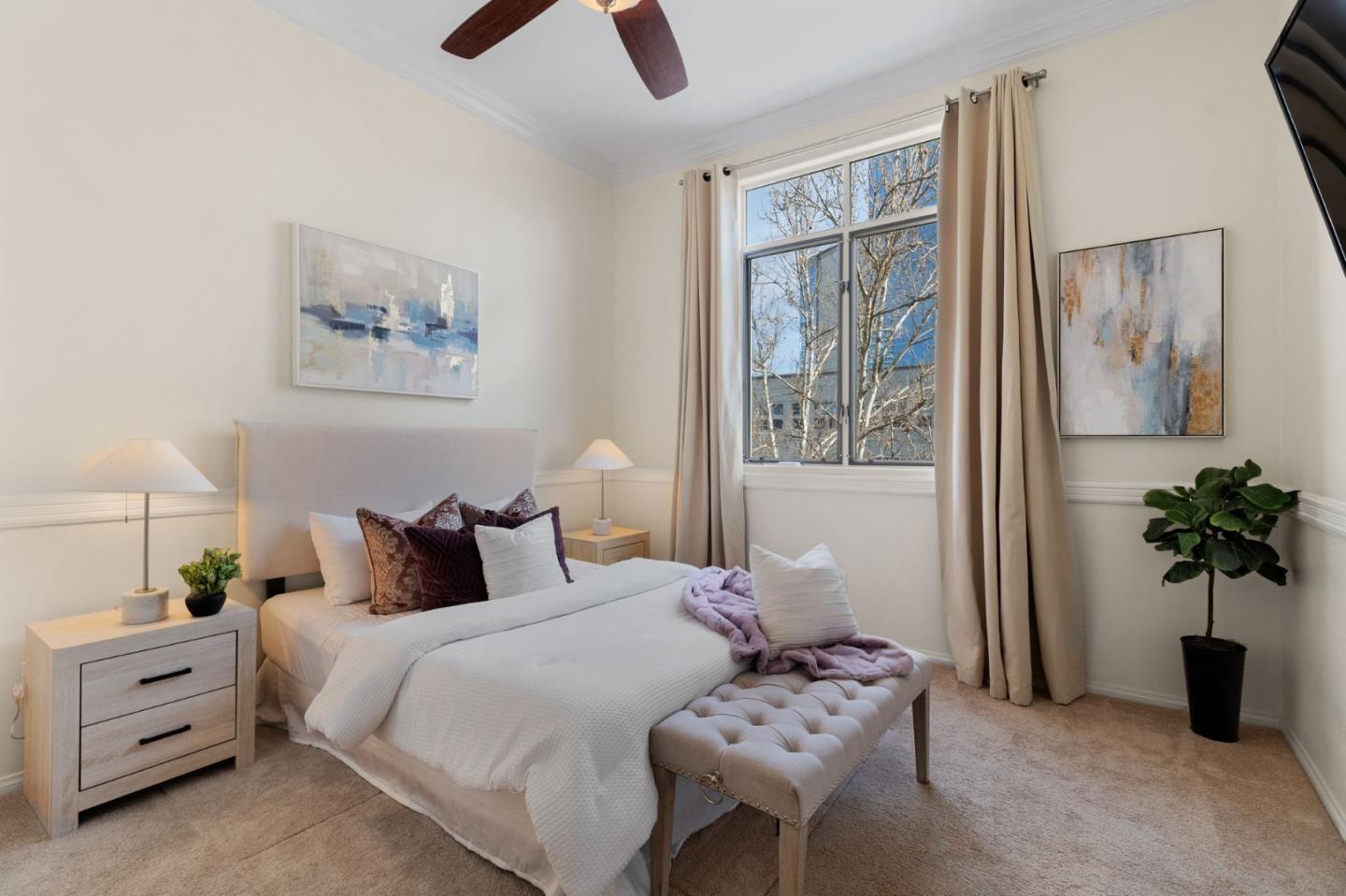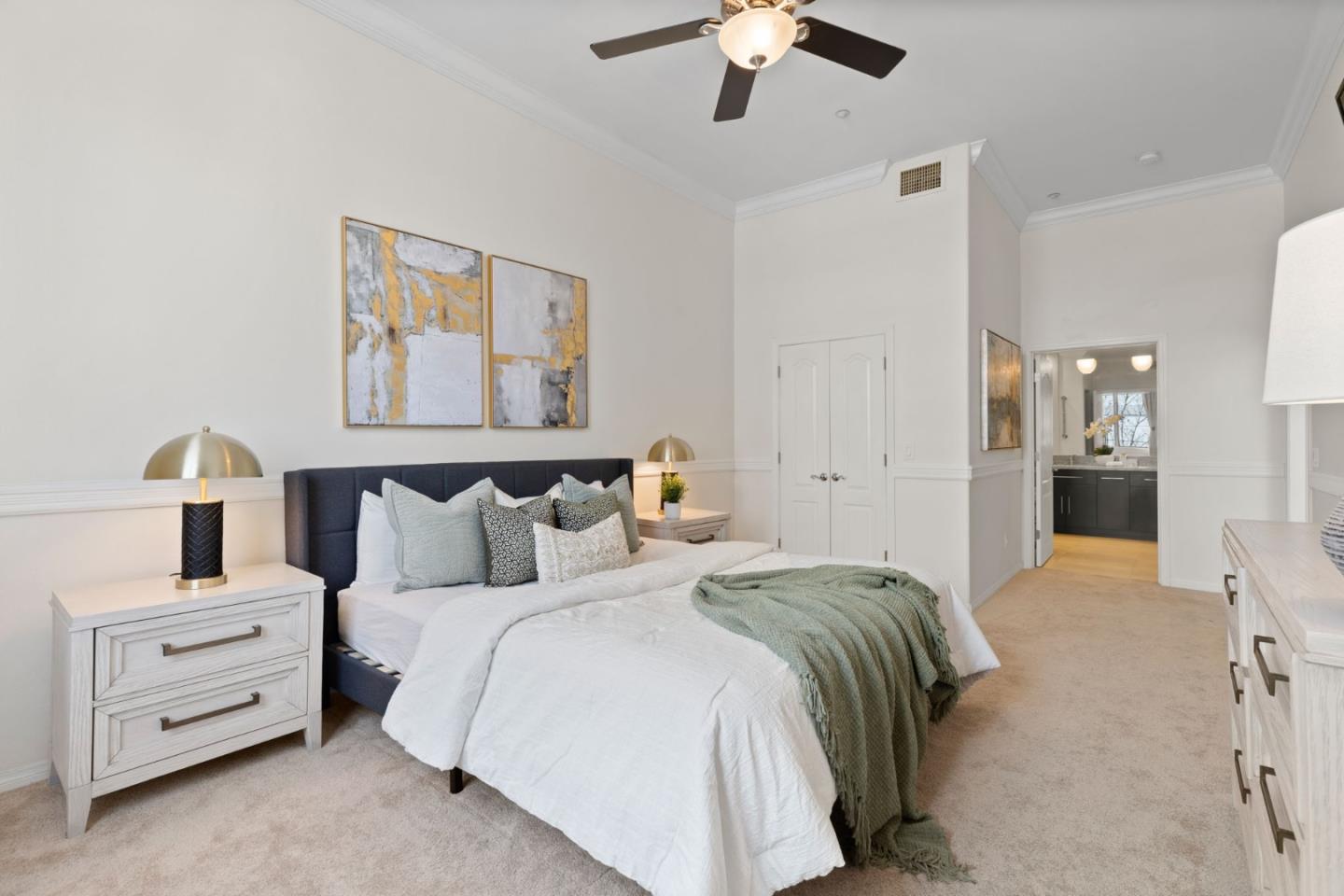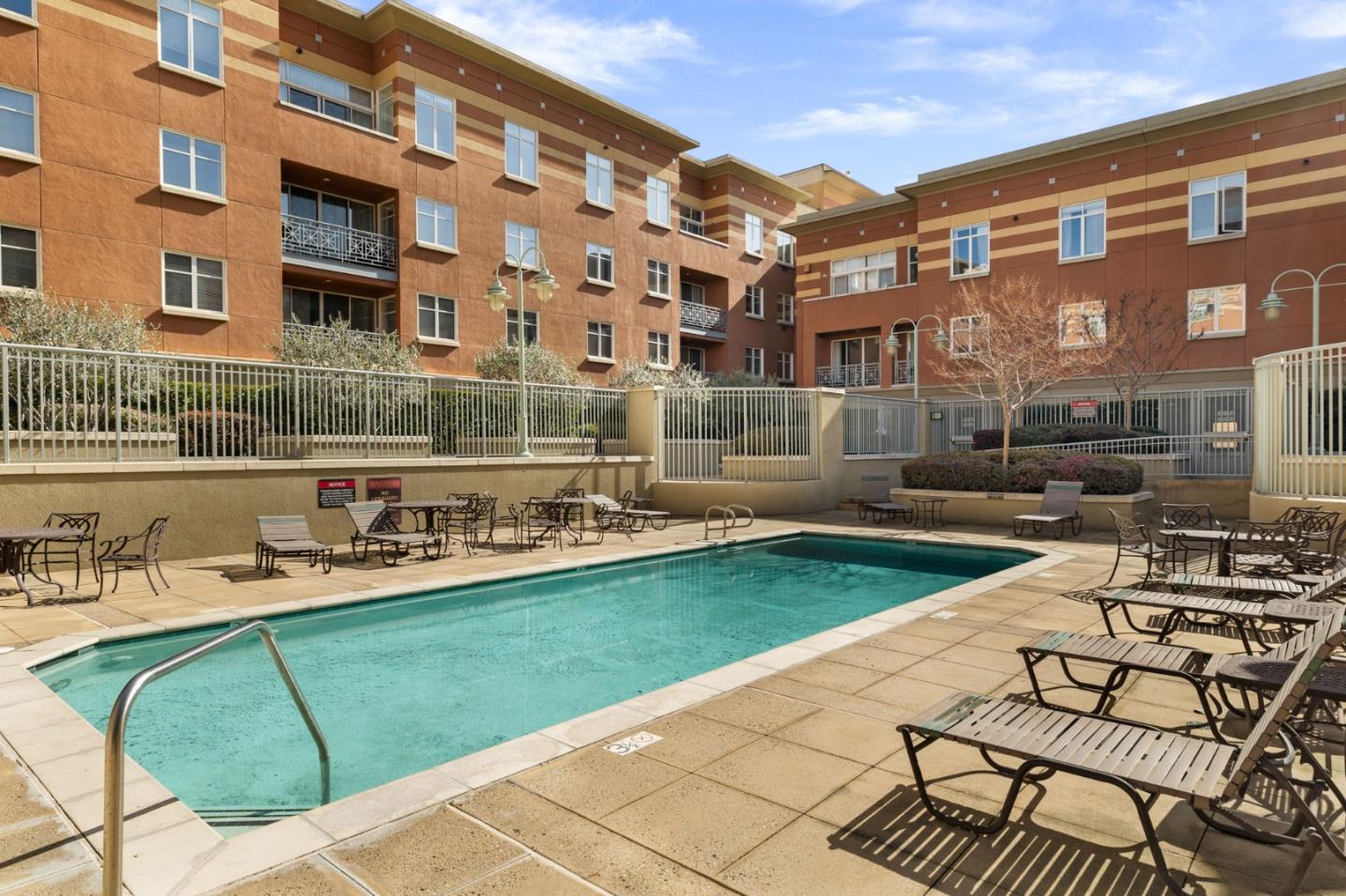 This luxury condo has been completely remodeled and has it all. Top floor, penthouse unit. Vaulted ceilings with large windows and tons of natural sunlight. 2 bedrooms, 2 full bathrooms, and a dedicated office. Gorgeous chef's kitchen with stainless steel appliances and granite counters. Custom kitchen cabinets with soft-close doors, pull-out drawers, and lots of pantry space. Extended kitchen peninsula for extra counter space. Huge primary bedroom suite with large walk-in closet. Amazing spa-like primary bath retreat with custom stall shower and huge luxury Kalia 3 designer square tub. Soak your worries away! Fully functioning home office that has been wired for networking and has tons of cabinet space. Home has been completely wired for Control4 smart home and audio-visual capabilities for the absolute best home entertainment. Recessed lighting throughout and ceiling fans in living room and bedrooms. Terrific top floor location with city and foothill views. Outdoor balcony. Includes 2 parking spaces and additional storage. Great location with restaurants and theaters right outside your doorstep. Easy walk to SJSU, San Pedro Square, SAP Center, and more.