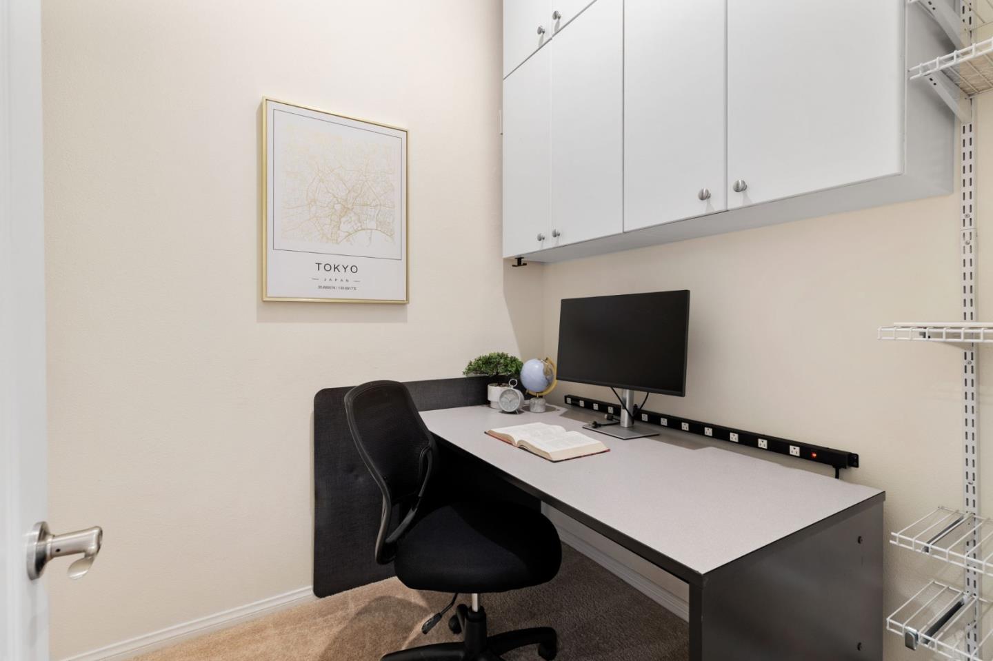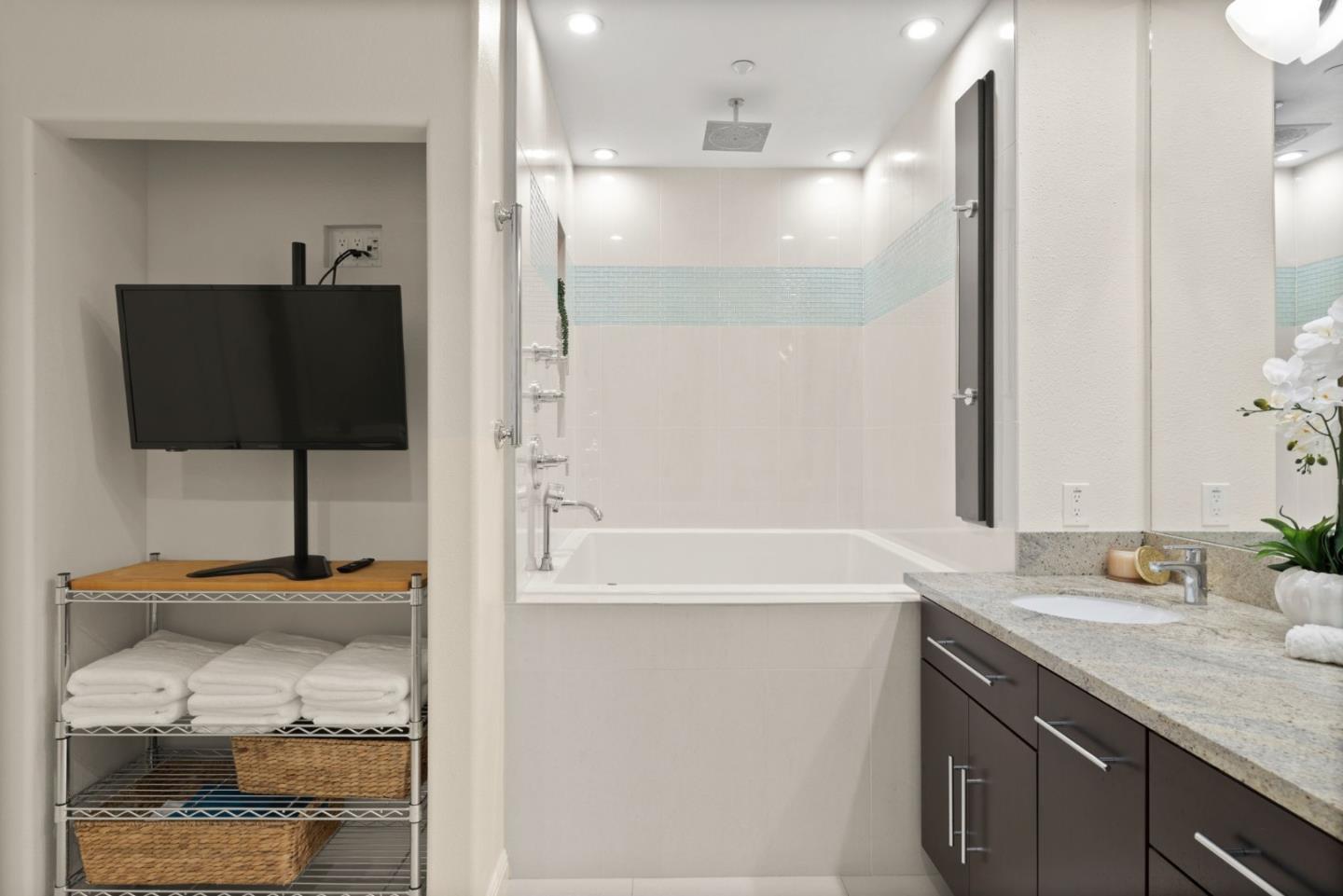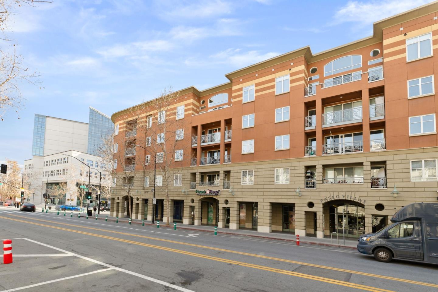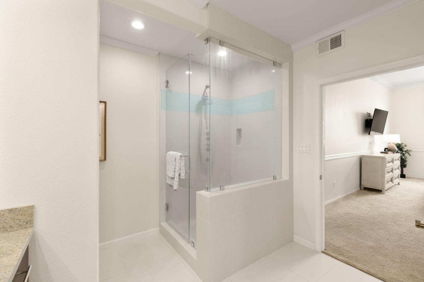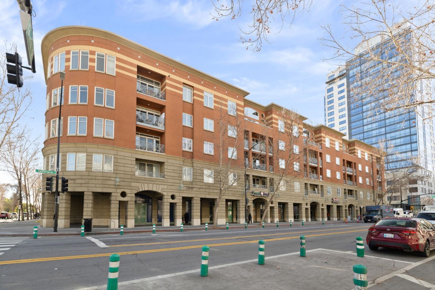 This luxury condo has been completely remodeled and has it all. Top floor, penthouse unit. Vaulted ceilings with large windows and tons of natural sunlight. 2 bedrooms, 2 full bathrooms, and a dedicated office. Gorgeous chef's kitchen with stainless steel appliances and granite counters. Custom kitchen cabinets with soft-close doors, pull-out drawers, and lots of pantry space. Extended kitchen peninsula for extra counter space. Huge primary bedroom suite with large walk-in closet. Amazing spa-like primary bath retreat with custom stall shower and huge luxury Kalia 3 designer square tub. Soak your worries away! Fully functioning home office that has been wired for networking and has tons of cabinet space. Home has been completely wired for Control4 smart home and audio-visual capabilities for the absolute best home entertainment. Recessed lighting throughout and ceiling fans in living room and bedrooms. Terrific top floor location with city and foothill views. Outdoor balcony. Includes 2 parking spaces and additional storage. Great location with restaurants and theaters right outside your doorstep. Easy walk to SJSU, San Pedro Square, SAP Center, and more.
