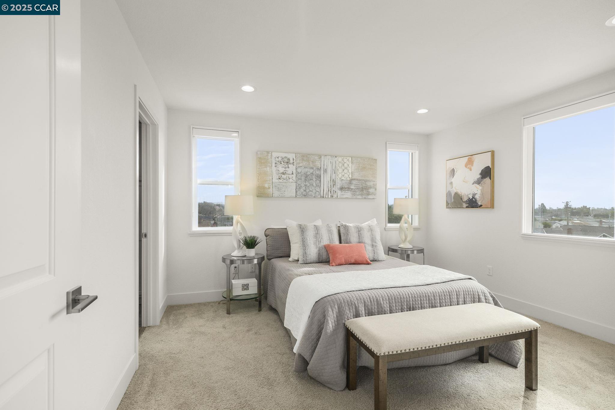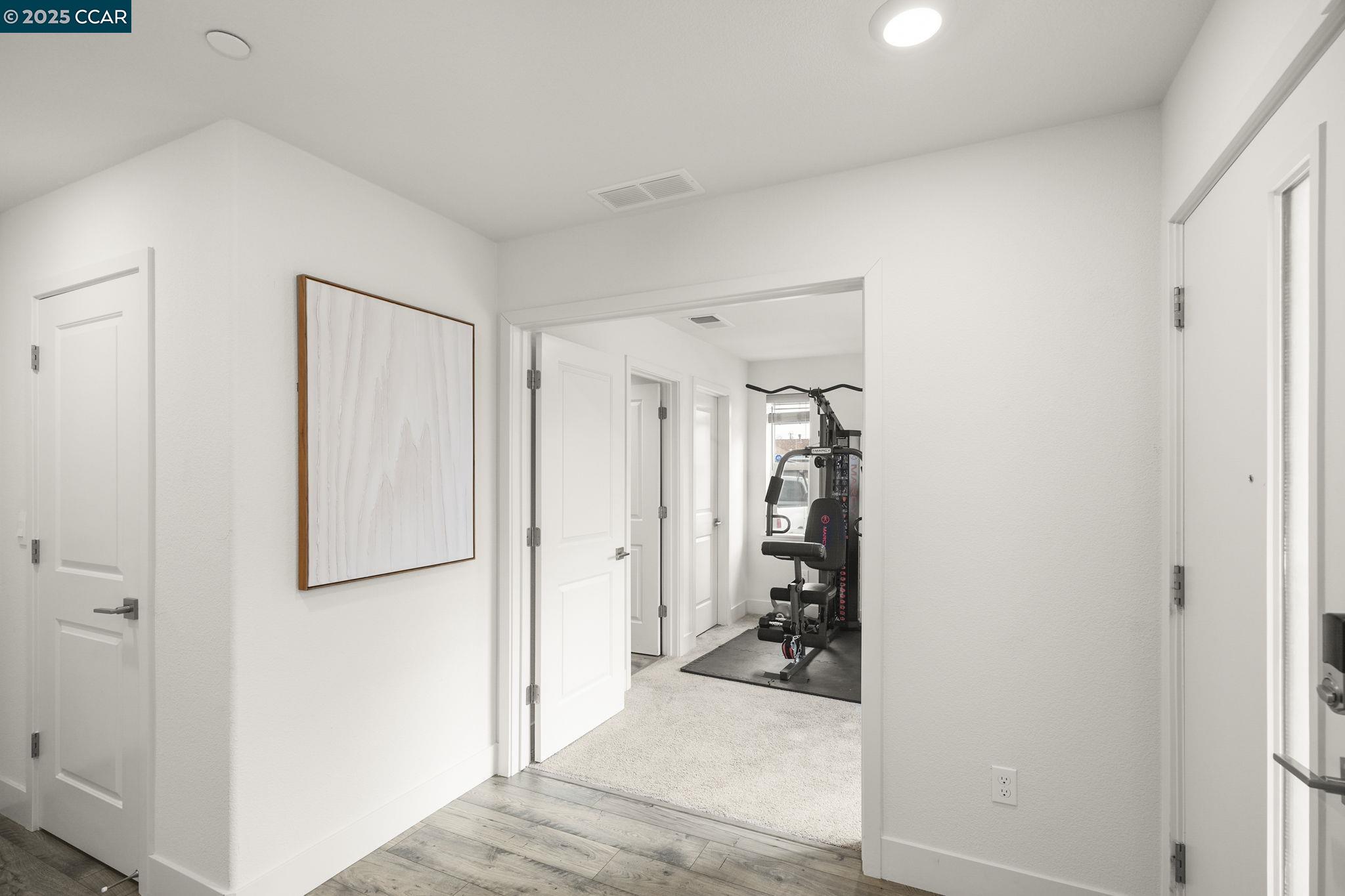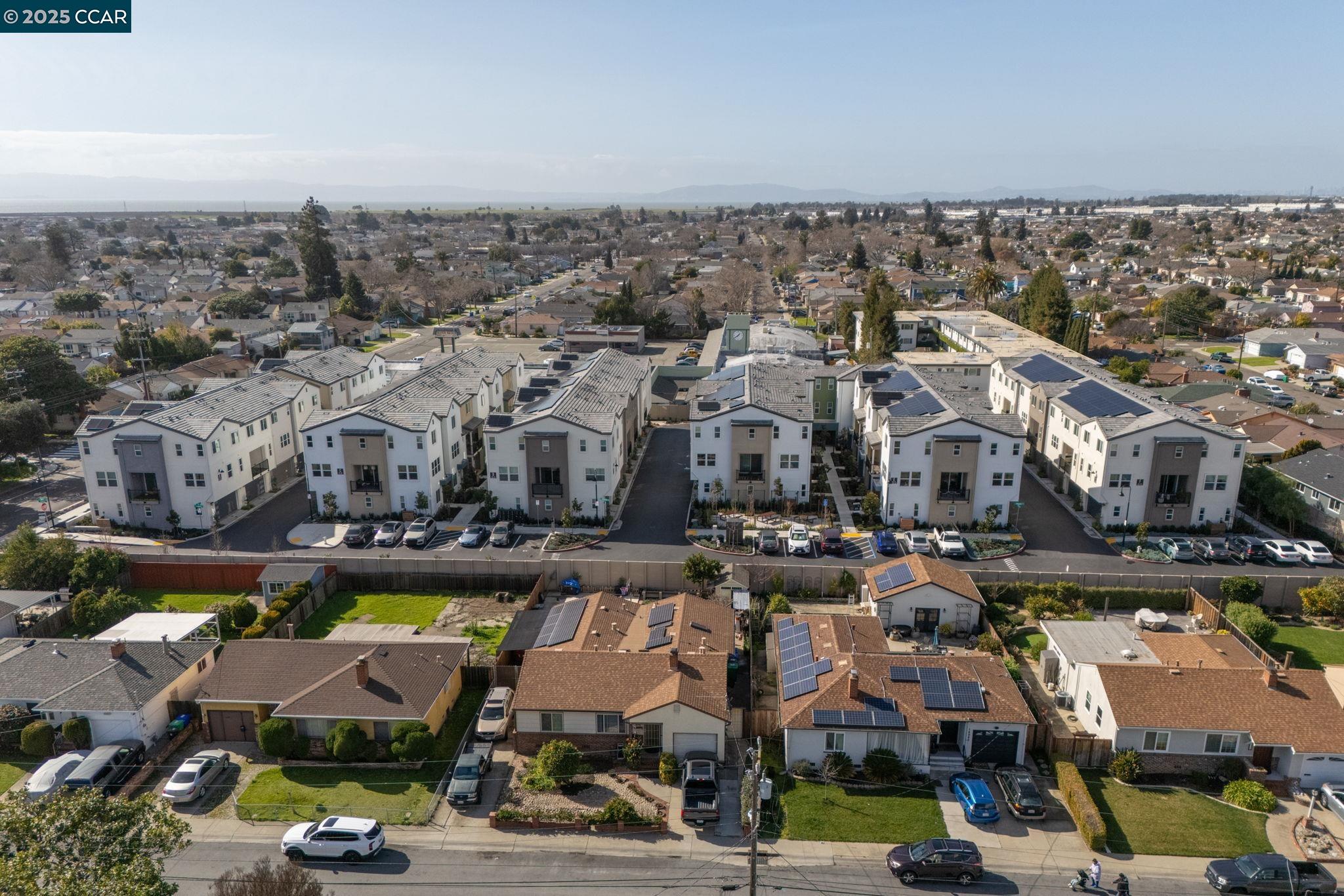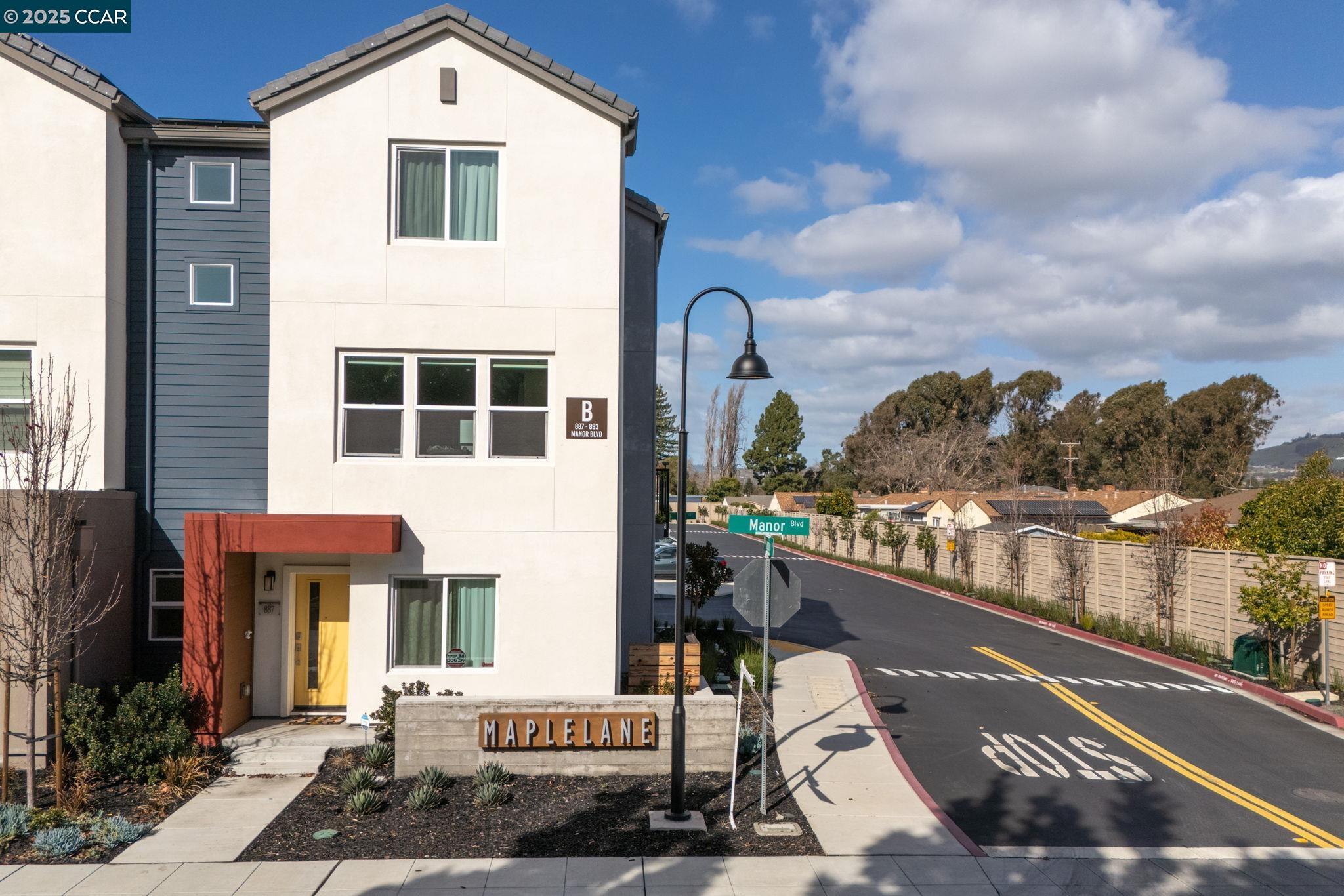 Welcome home to this exceptional opportunity in San Leandro! First time on the resale market! Built in 2023, this townhome style condo features 4 bedrooms, 3.5 bathrooms, 2017 sq. ft. of living space, 2 car garage with owned solar, open concept floor plan with great room and dining area, gourmet kitchen featuring stainless steel Kitchen Aid appliances, with soft close drawers, freestanding island and walk in pantry. Primary bedroom also includes an en-suite bathroom with double sinks, walk-in closet, and water closet. The first-floor ensuite bedroom can be utilized as a grandparents/guest suite, wellness room, or fitness center. The home also includes blackout shutters, home management office next to kitchen, balcony overlooking the San Leandro hills, luxury vinyl plank floors throughout main living area and bathrooms, granite counter tops & island, end unit allows more lighting throughout the home. Amazing Smart Home features including alarm, camera, thermostat, and enabled appliances. Level 2 EV charging available in the community. Nestled in the well-established Washington Manor Community. Nearby to shops and to Manor Park!