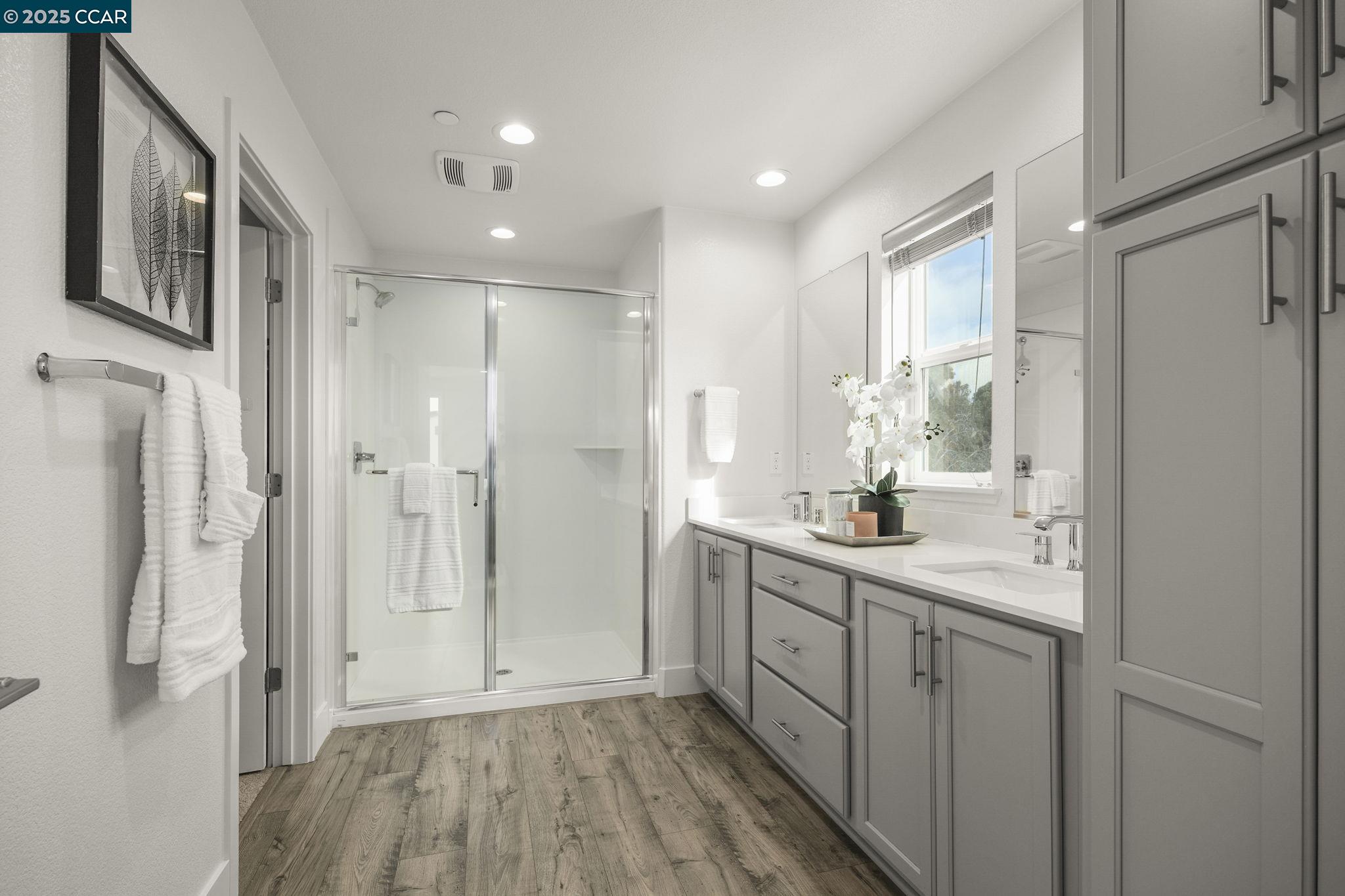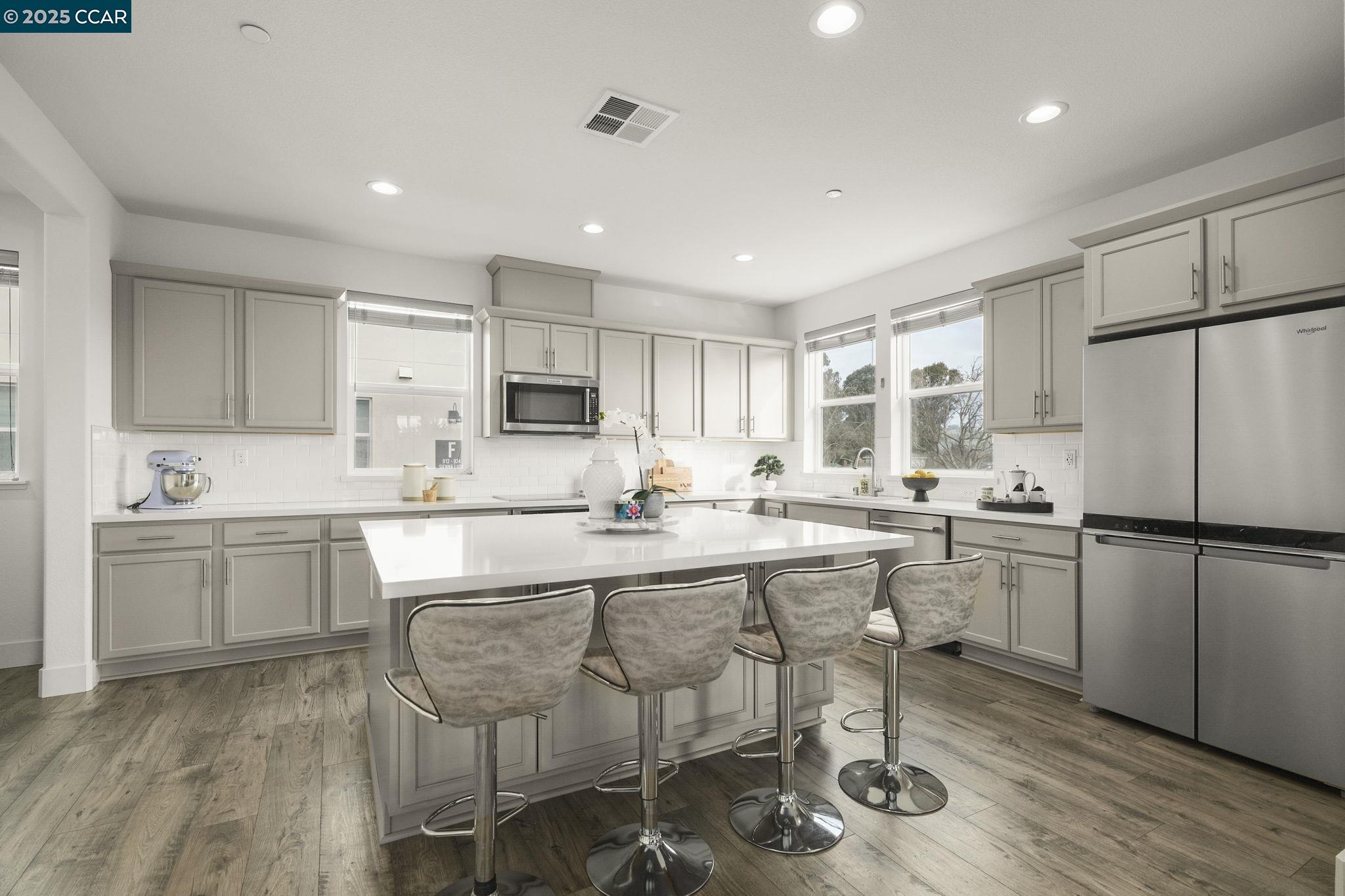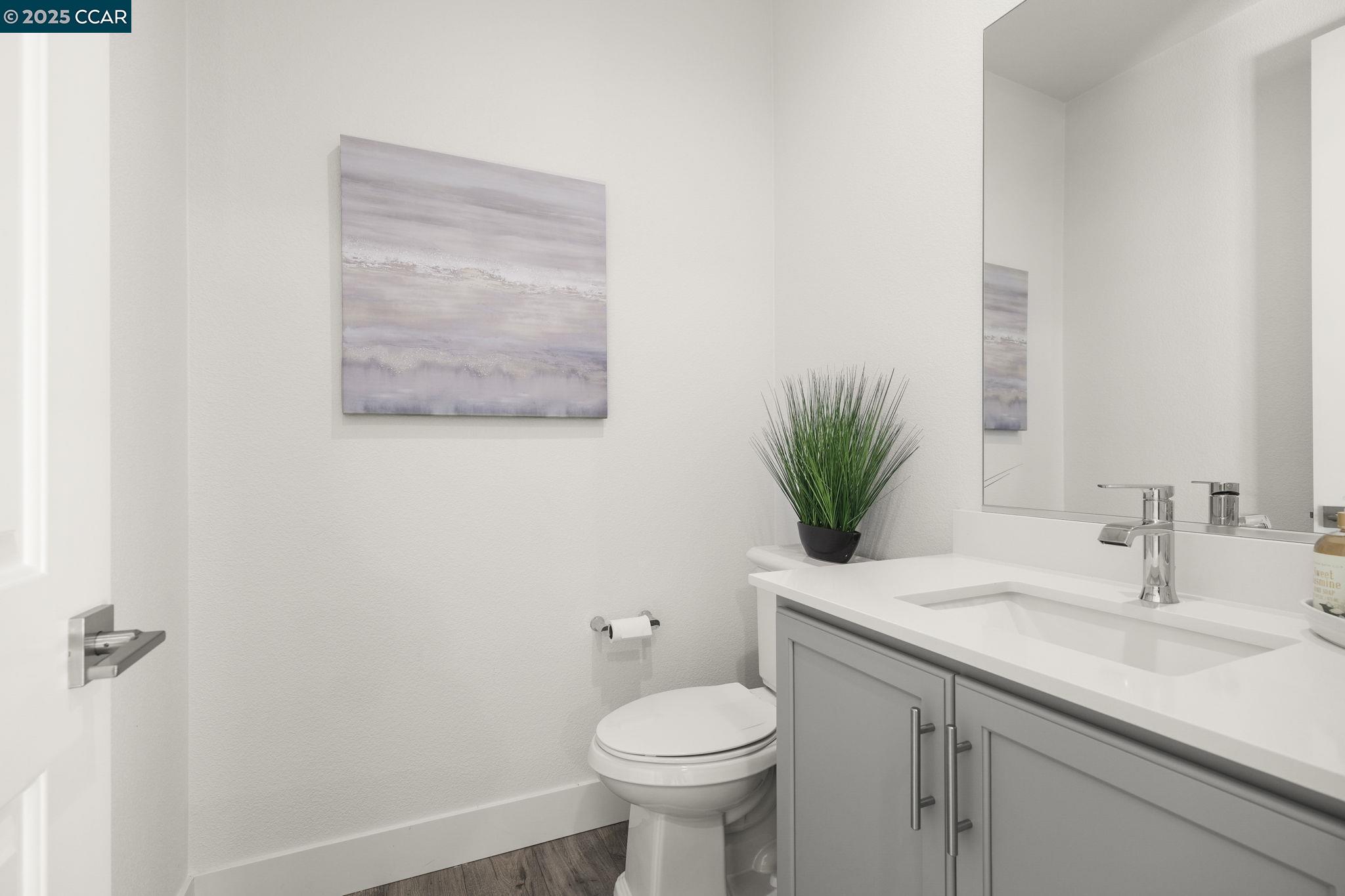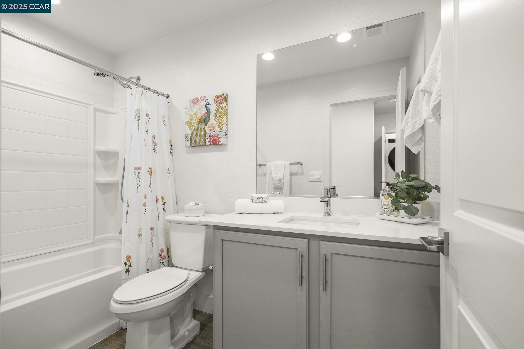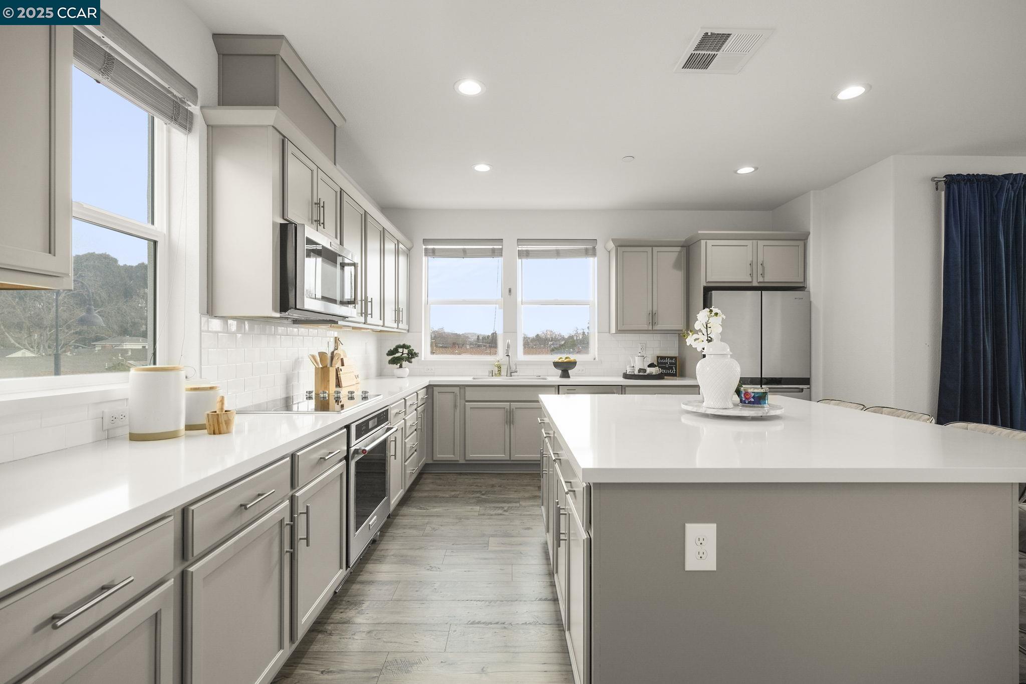 Welcome home to this exceptional opportunity in San Leandro! First time on the resale market! Built in 2023, this townhome style condo features 4 bedrooms, 3.5 bathrooms, 2017 sq. ft. of living space, 2 car garage with owned solar, open concept floor plan with great room and dining area, gourmet kitchen featuring stainless steel Kitchen Aid appliances, with soft close drawers, freestanding island and walk in pantry. Primary bedroom also includes an en-suite bathroom with double sinks, walk-in closet, and water closet. The first-floor ensuite bedroom can be utilized as a grandparents/guest suite, wellness room, or fitness center. The home also includes blackout shutters, home management office next to kitchen, balcony overlooking the San Leandro hills, luxury vinyl plank floors throughout main living area and bathrooms, granite counter tops & island, end unit allows more lighting throughout the home. Amazing Smart Home features including alarm, camera, thermostat, and enabled appliances. Level 2 EV charging available in the community. Nestled in the well-established Washington Manor Community. Nearby to shops and to Manor Park!
