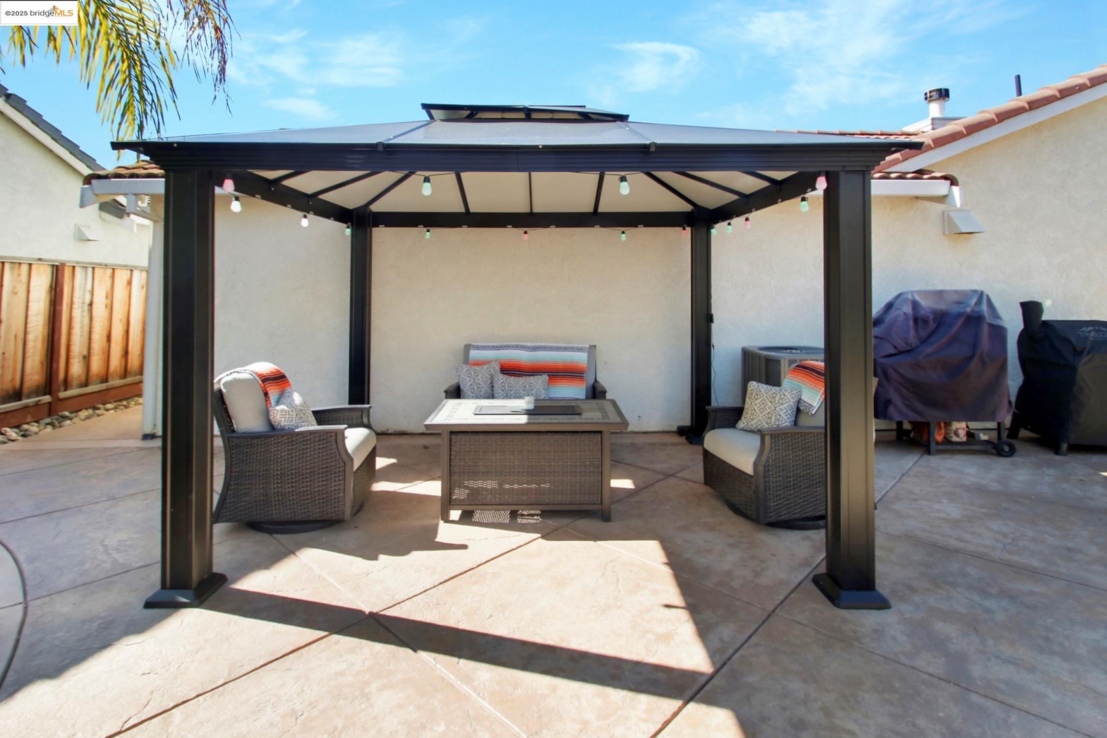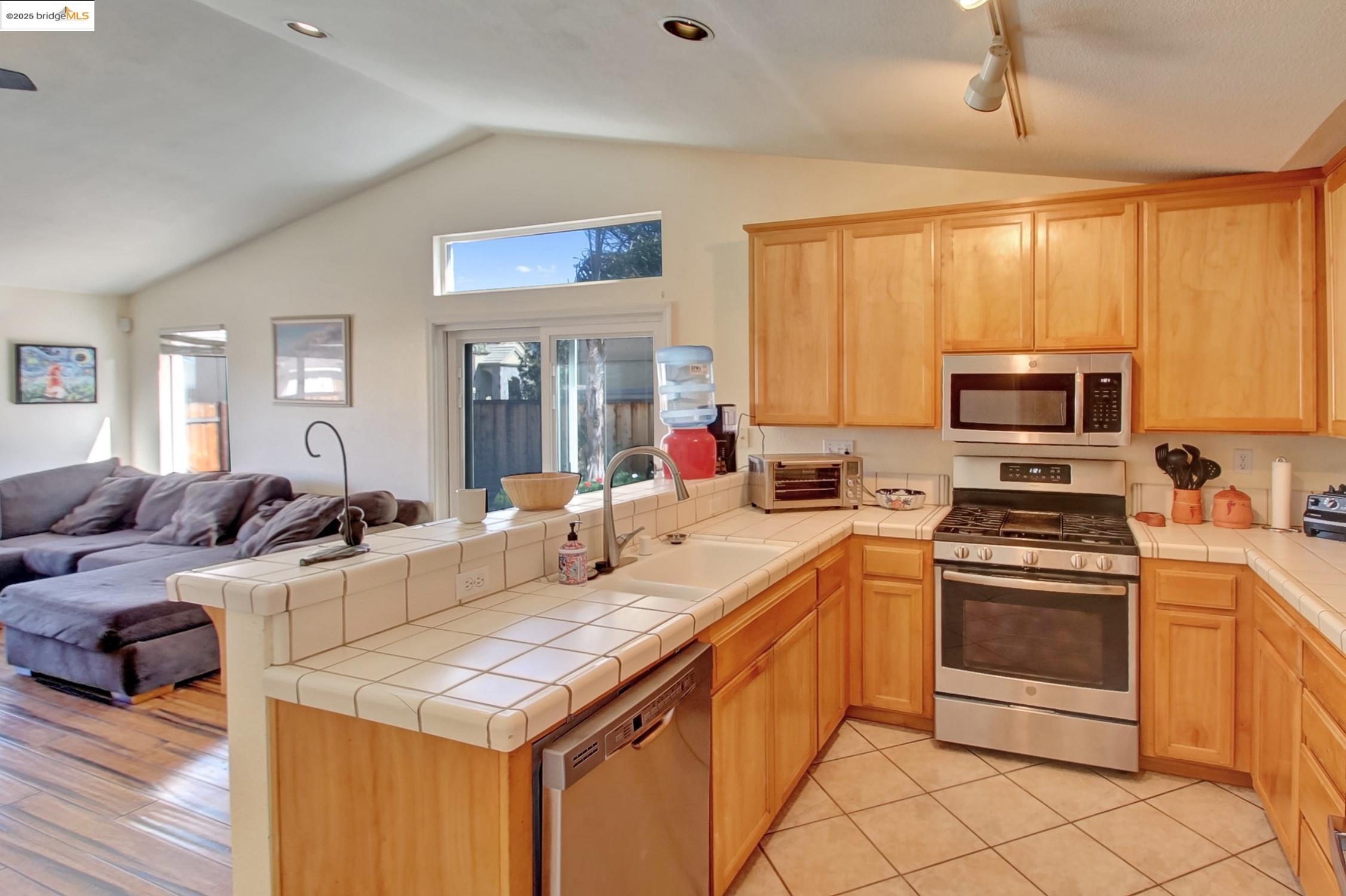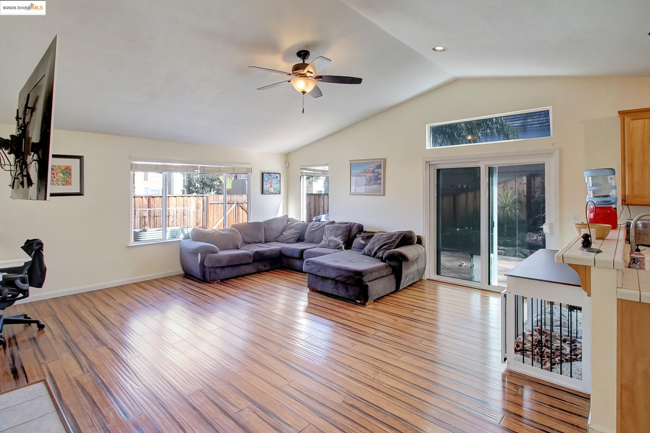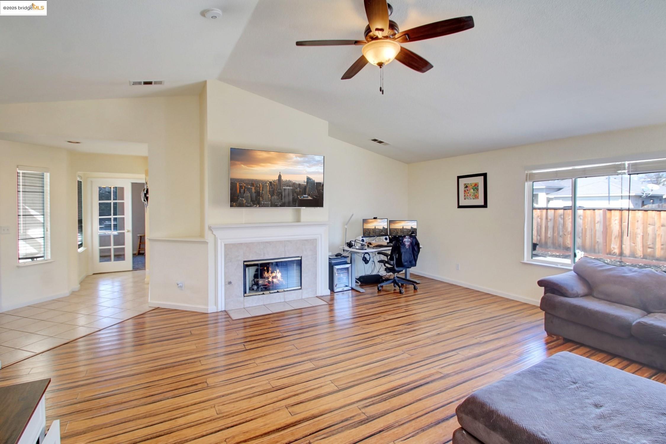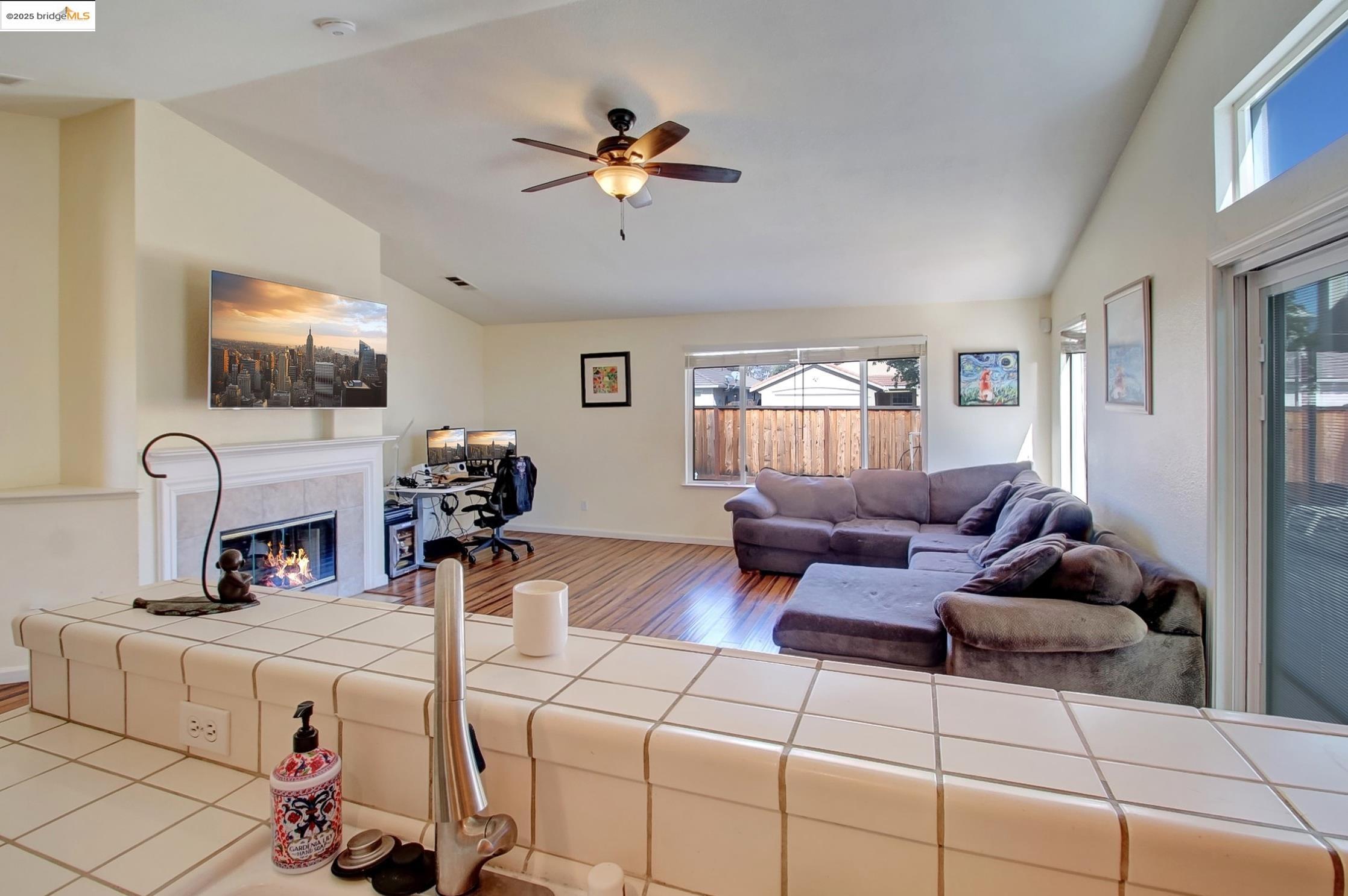 Great single story Pulte home on a spacious corner lot. The beautifully landscaped backyard offers a private retreat featuring a fire-pit area tucked away in a secluded corner. Home has 3 bedrooms & 2 baths, complimented by a large living room with vaulted ceiling. Kitchen includes stainless steel appliances. Refrigerator stays. Ceiling fan/light fixtures in each bedroom + the living room. Gorgeous laminate flooring. Fireplace w/gas starter & decorative log-set. Upgraded sliding glass doors with between-the-glass blinds. Many newer 2” blinds. Covered porch welcomes you and your guests. Large stamped concrete patio. Gated side yard access. Easily maintained yard! Newer fencing! Laundry room with cabinets. Washer & dryer stay! Ring doorbell & 2 cameras stay! Smart thermostat. Keyless entry. Driveway widened to provide more parking. Great neighborhood & a short walk to Creekside Park, one of Brentwood’s best parks! So many outdoor recreational & leisure activities: Pickleball, tennis, basketball, disc-golf, performing stage & seating, multiple play structures, BBQs, picnic tables, and so much more. All of this set along side of historic Marsh Creek and walking trails. Great Brentwood schools.