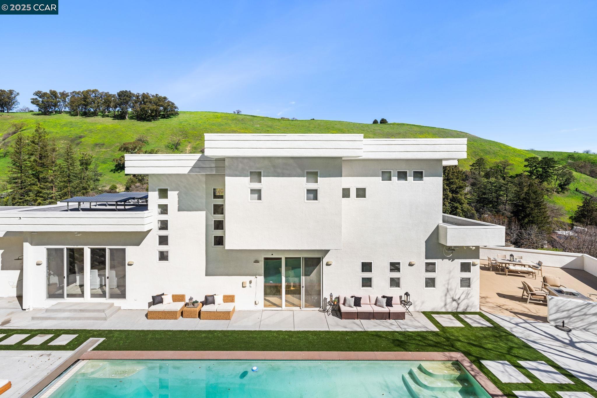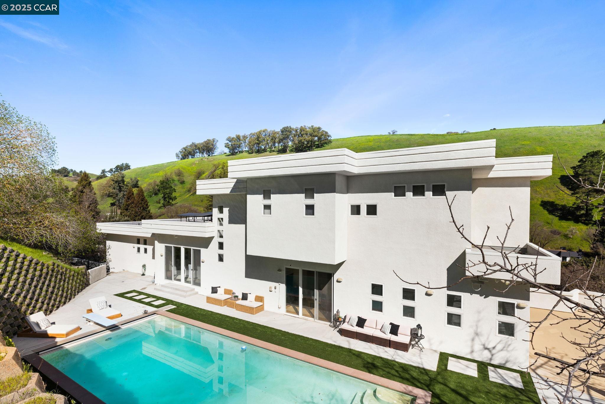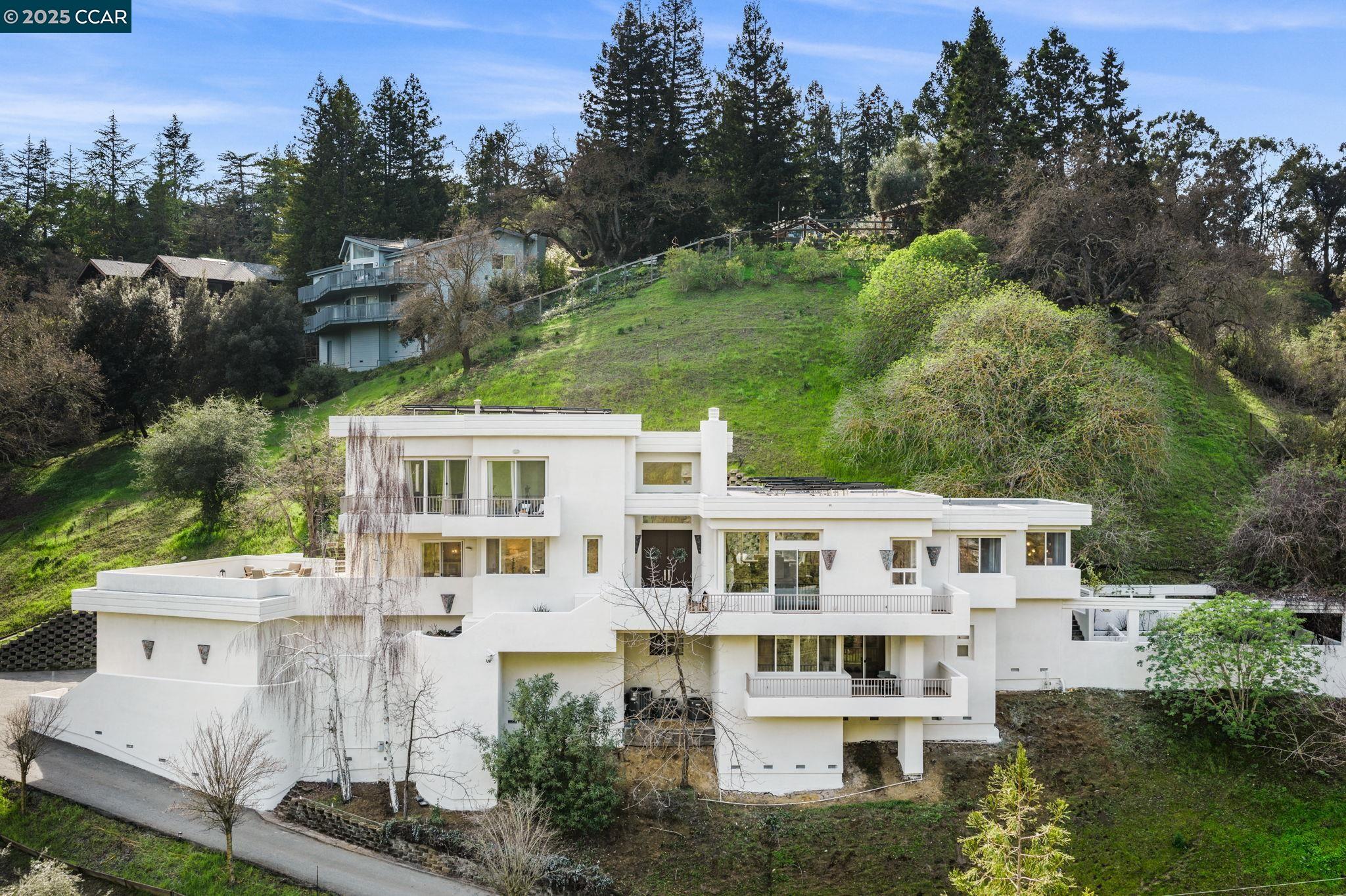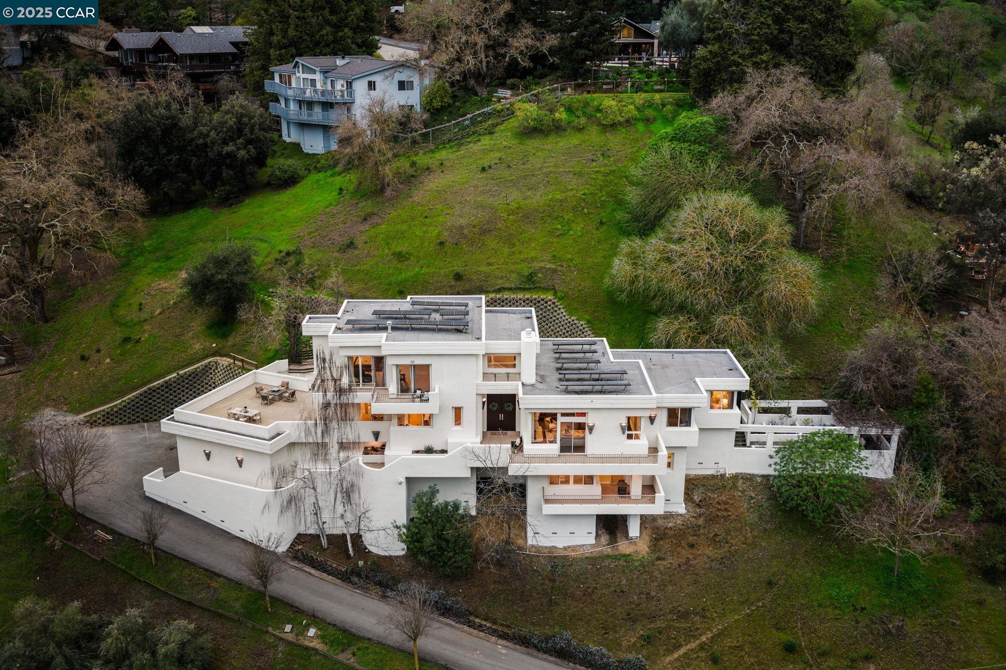 Spectacular modern hillside estate perched at the top of a private drive. Nestled on an expansive knoll on the Lafayette/Walnut Creek border, come enjoy breathtaking Mt Diablo vistas, ridgetop views & feelings of tranquility. This stunning property redefines contemporary living with its expansive 4,384 Sq Ft, high ceilings & views from most every window. Boasting 5 spacious bedrooms, 3 full baths + 2 half baths, this residence offers a perfect blend of comfort & flexibility. High ceilings create an airy, open ambiance, enhancing the modern home elegance. Spacious & open floor plan makes it ideal for everyday living. Grand entertaining spaces with a tiered floor plan offer the possibility for multi-generational living, private guest quarters or au pair set up. Bonus playroom, media room, exercise/gym area are icing on the cake. Remodeled kitchen is a chef's delight & you will love the convenient Elevator! SOLAR is owned. Sparkling pool, rooftop sun deck & secret garden! Situated equal distance (5 minutes) from bustling downtown Walnut Creek & quaint downtown Lafayette on prestigious Springbrook Rd on Acalanes Ridge. Convenient to everything: 2 BART stations, 680 & 24, shopping, dining, theatre, endless hiking & biking trails & open space. Walk to Acalanes High School.