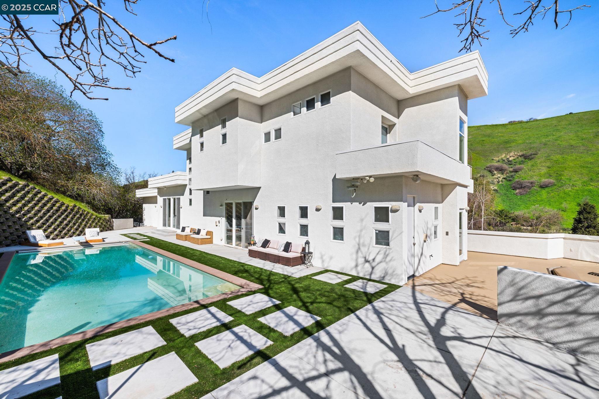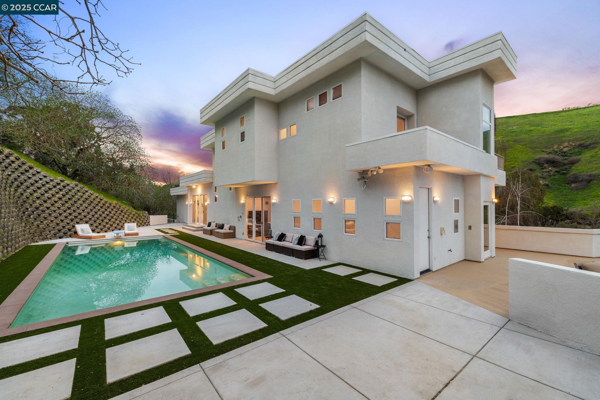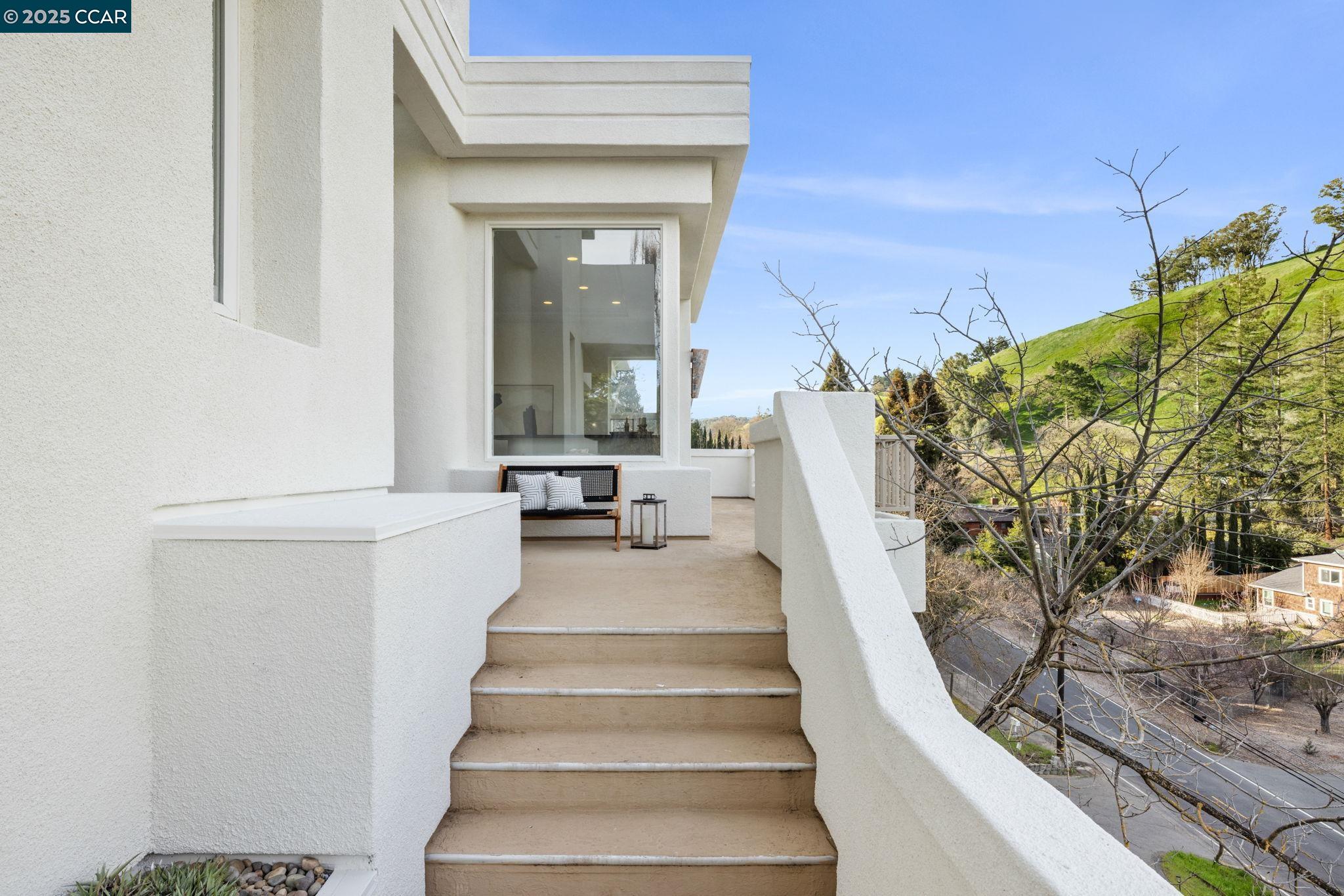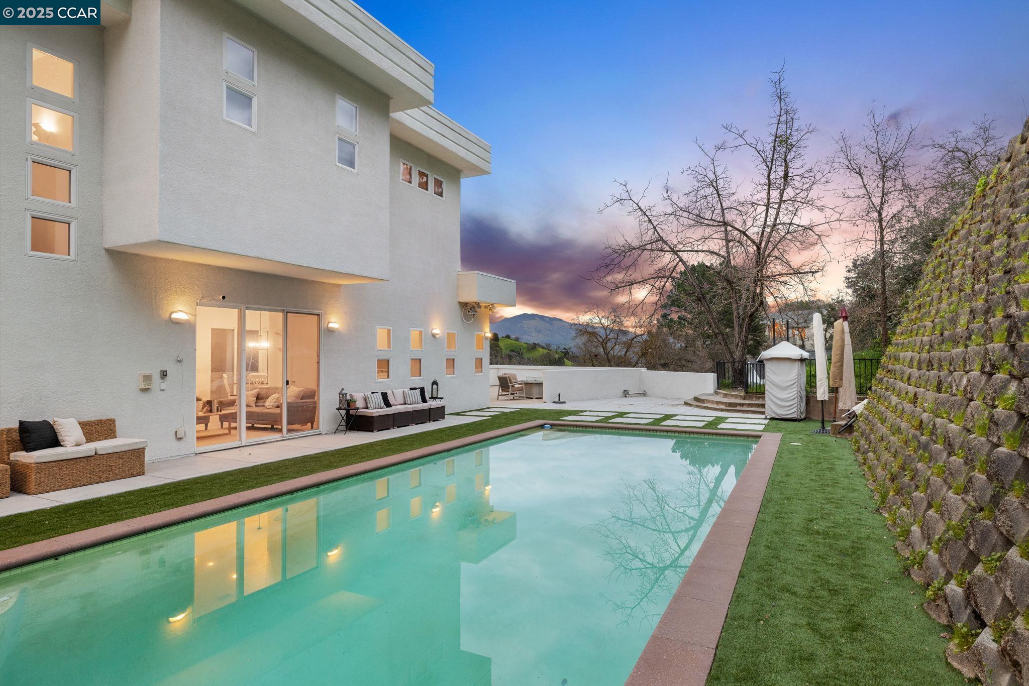 Spectacular modern hillside estate perched at the top of a private drive. Nestled on an expansive knoll on the Lafayette/Walnut Creek border, come enjoy breathtaking Mt Diablo vistas, ridgetop views & feelings of tranquility. This stunning property redefines contemporary living with its expansive 4,384 Sq Ft, high ceilings & views from most every window. Boasting 5 spacious bedrooms, 3 full baths + 2 half baths, this residence offers a perfect blend of comfort & flexibility. High ceilings create an airy, open ambiance, enhancing the modern home elegance. Spacious & open floor plan makes it ideal for everyday living. Grand entertaining spaces with a tiered floor plan offer the possibility for multi-generational living, private guest quarters or au pair set up. Bonus playroom, media room, exercise/gym area are icing on the cake. Remodeled kitchen is a chef's delight & you will love the convenient Elevator! SOLAR is owned. Sparkling pool, rooftop sun deck & secret garden! Situated equal distance (5 minutes) from bustling downtown Walnut Creek & quaint downtown Lafayette on prestigious Springbrook Rd on Acalanes Ridge. Convenient to everything: 2 BART stations, 680 & 24, shopping, dining, theatre, endless hiking & biking trails & open space. Walk to Acalanes High School.